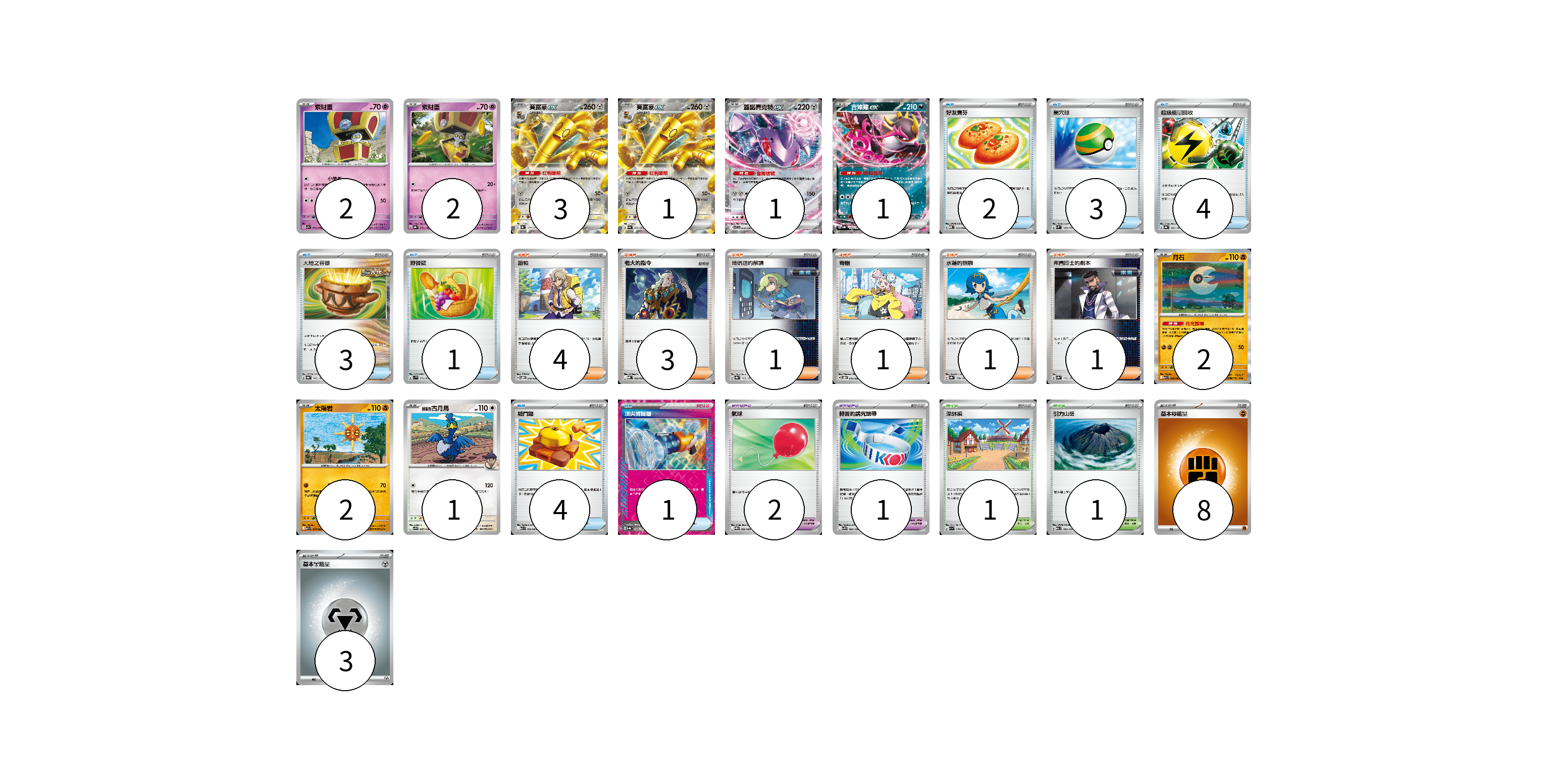 牌組構築方案 以此牌組為基礎新構築牌組 顯示卡面 顯示列表 寶可夢卡(15) 2 2 3 1 1 1 2 2 1 寶可夢道具(3) 2 1 物品卡(18) 2 3 4 3 1 4 1 支援者卡(11) 4 3 1 1 1 1 競技場卡(2) 1 1 能量卡(11) 8 3 寶可夢卡(15) 卡牌名稱 張數 卡牌名稱 張數 索財靈 SV7a 024/064 02 索財靈 SV8a 073/187 02 賽富豪ex SV8a 117/187 03 賽富豪ex SV3a 050/062 01 蓋諾賽克特ex SV11B 069/086 01 吉雉雞ex SV8a 104/187 01 月石 M1L 026/063 02 太陽岩 M1L 027/063 02 赫普的古月鳥 SV9 087/100 01 寶可夢道具(3) 卡牌名稱 張數 卡牌名稱 張數 氣球 SV11B 082/086 02 赫普的講究頭帶 SV9 092/100 01 物品卡(18) 卡牌名稱 張數 卡牌名稱 張數 好友寶芬 MBD 013/022 02 巢穴球 SVM 133/175 03 超級能量回收 SV8a 141/187 04 大地之容器 SV8a 143/187 03 野餐籃 SV1V 071/078 01 戰鬥鑼 M1L 059/063 04 頂尖捕捉器 SV8a 148/187 01 支援者卡(11) 卡牌名稱 張數 卡牌名稱 張數 派帕 SVOD 018/020 04 老大的指令 MBD 020/022 03 暗碼迷的解讀 SV8a 165/187 01 奇樹 SVOD 016/020 01 水蓮的照顧 SV8a 168/187 01 弗圖博士的劇本 SV8a 175/187 01 競技場卡(2) 卡牌名稱 張數 卡牌名稱 張數 深缽鎮 SV1a 070/073 01 引力山岳 M2a 183/193 01 能量卡(11) 卡牌名稱 張數 卡牌名稱 張數 基本【鬥】能量 M-P FIG 08 基本【鋼】能量 M-P MET 03 以此牌組為基礎新構築牌組 牌組編碼 RBVVXo-fXRnES-mnLsnA copy 列印牌組單 牌組編碼已複製 分享至SNS
