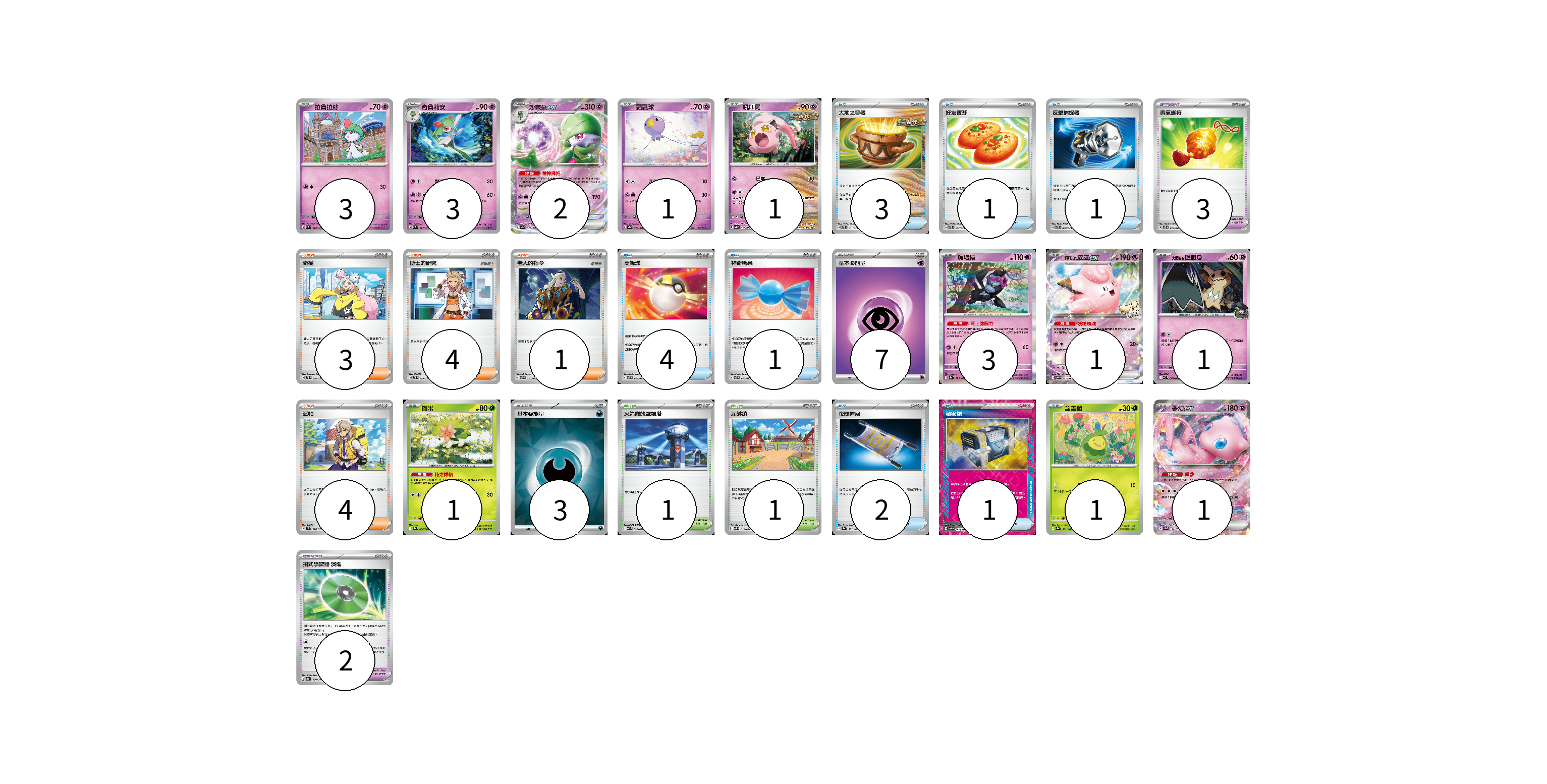 牌組構築方案 以此牌組為基礎新構築牌組 顯示卡面 顯示列表 寶可夢卡(18) 3 3 2 1 1 3 1 1 1 1 1 寶可夢道具(5) 3 2 物品卡(13) 3 1 1 4 1 2 1 支援者卡(12) 3 4 1 4 競技場卡(2) 1 1 能量卡(10) 7 3 寶可夢卡(18) 卡牌名稱 張數 卡牌名稱 張數 拉魯拉絲 SV1S 026/078 03 奇魯莉安 SV1S 027/078 03 沙奈朵ex SV1S 028/078 02 飄飄球 SV1S 029/078 01 吼叫尾 SV4K 032/066 01 願增猿 SV8a 075/187 03 莉莉艾的皮皮ex SV9 033/100 01 <火箭隊的>謎擬Q SV10 042/098 01 謝米 SV9a 006/063 01 含羞苞 SV8a 001/187 01 夢幻ex SV2a 151/165 01 寶可夢道具(5) 卡牌名稱 張數 卡牌名稱 張數 勇氣護符 SVTS 017/022 03 招式學習器 演進 SV8a 160/187 02 物品卡(13) 卡牌名稱 張數 卡牌名稱 張數 大地之容器 SVTS 011/022 03 好友寶芬 SVTS 012/022 01 反擊捕捉器 SVTS 009/022 01 高級球 SVTS 014/022 04 神奇糖果 SVTS 015/022 01 夜間擔架 SV8a 151/187 02 秘密箱 SV6 092/101 01 支援者卡(12) 卡牌名稱 張數 卡牌名稱 張數 奇樹 SVTS 018/022 03 博士的研究 SVTS 019/022 04 老大的指令 SVTS 020/022 01 派帕 SV1V 076/078 04 競技場卡(2) 卡牌名稱 張數 卡牌名稱 張數 火箭隊的監視塔 SV10 096/098 01 深缽鎮 SVF 036/038 01 能量卡(10) 卡牌名稱 張數 卡牌名稱 張數 基本【超】能量 SVTS PSY 07 基本【惡】能量 SVOM DAR 03 以此牌組為基礎新構築牌組 牌組編碼 RGPoTe-SAxFEu-mLSdee copy 列印牌組單 牌組編碼已複製 分享至SNS