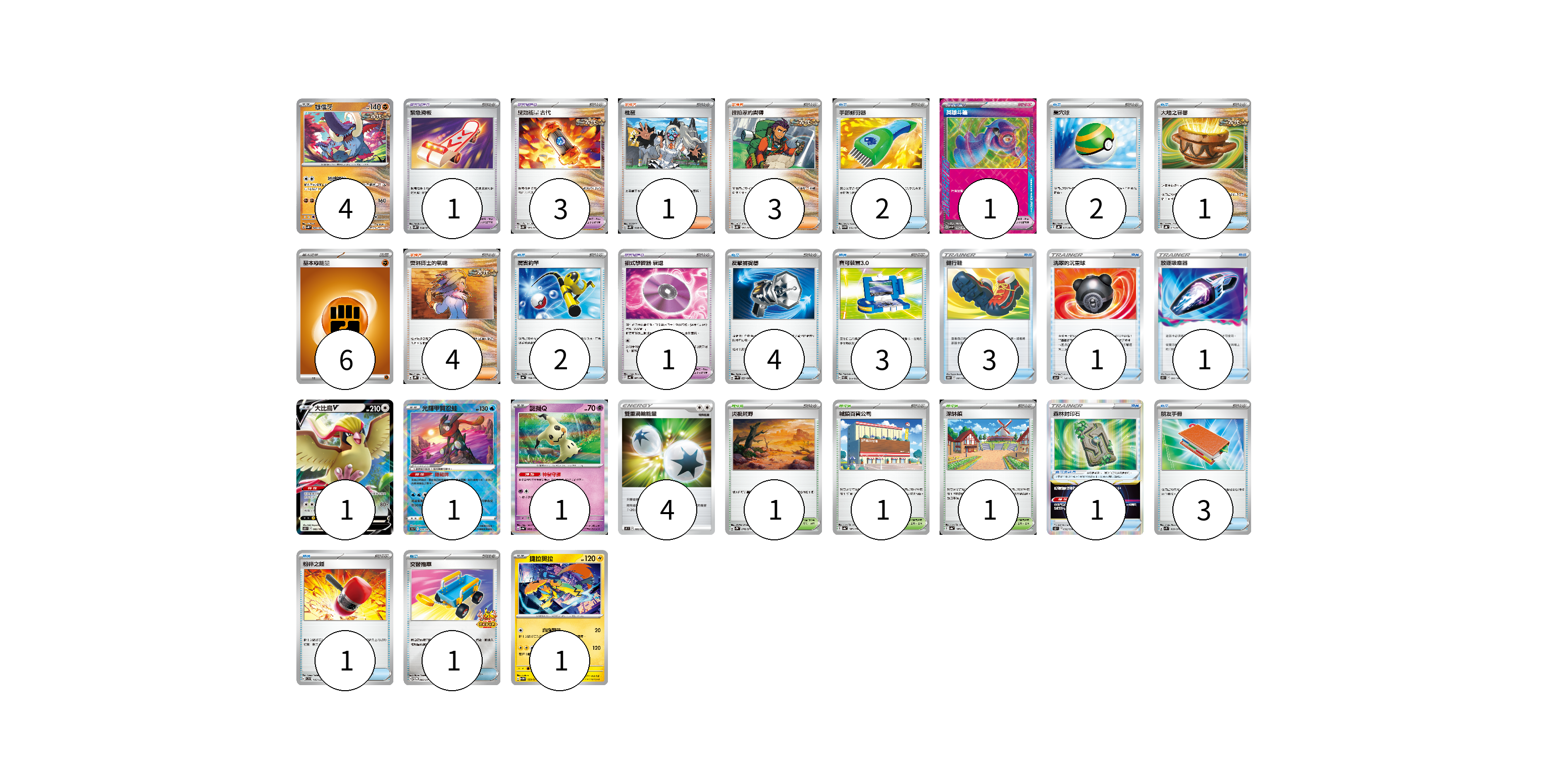 牌組構築方案 以此牌組為基礎新構築牌組 顯示卡面 顯示列表 寶可夢卡(8) 4 1 1 1 1 寶可夢道具(7) 1 3 1 1 1 物品卡(24) 2 2 1 2 4 3 3 1 1 3 1 1 支援者卡(8) 1 3 4 競技場卡(3) 1 1 1 能量卡(10) 6 4 寶可夢卡(8) 卡牌名稱 張數 卡牌名稱 張數 雄偉牙 SV5K 042/071 04 大比鳥V S11 082/100 01 光輝甲賀忍蛙 S9a 026/067 01 謎擬Q SV4a 088/190 01 捷拉奧拉 SV5M 029/071 01 寶可夢道具(7) 卡牌名稱 張數 卡牌名稱 張數 緊急滑板 SV5K 064/071 01 驅勁能量 古代 SV5K 065/071 03 英雄斗篷 SV5M 064/071 01 招式學習器 衰退 SV4K 063/066 01 森林封印石 S12 092/098 01 物品卡(24) 卡牌名稱 張數 卡牌名稱 張數 手部修剪器 SV5M 061/071 02 巢穴球 SVHK 012/022 02 大地之容器 SVHK 011/022 01 厲害釣竿 SV4a 158/190 02 反擊捕捉器 SV4M 059/066 04 寶可裝置3.0 SVEL 014/020 03 健行鞋 S10D 061/067 03 洗翠的沉重球 S12a 140/172 01 放逐吸塵器 S11 093/100 01 朋友手冊 SV1S 069/078 03 粉碎之錘 SVD 116/139 01 交替推車 SV-P 082/SV-P 01 支援者卡(8) 卡牌名稱 張數 卡牌名稱 張數 枇琶 SV5K 068/071 01 探險家的嚮導 SV5K 067/071 03 奧琳博士的氣魄 SVHK 017/022 04 競技場卡(3) 卡牌名稱 張數 卡牌名稱 張數 災禍荒野 SV2D 070/071 01 城鎮百貨公司 SV4a 183/190 01 深缽鎮 SV4a 185/190 01 能量卡(10) 卡牌名稱 張數 卡牌名稱 張數 基本【鬥】能量 SVHK FIG 06 雙重渦輪能量 S9 100/100 04 以此牌組為基礎新構築牌組 牌組編碼 RJcRDf-zHSBhe-PktVur copy 列印牌組單 牌組編碼已複製 分享至SNS