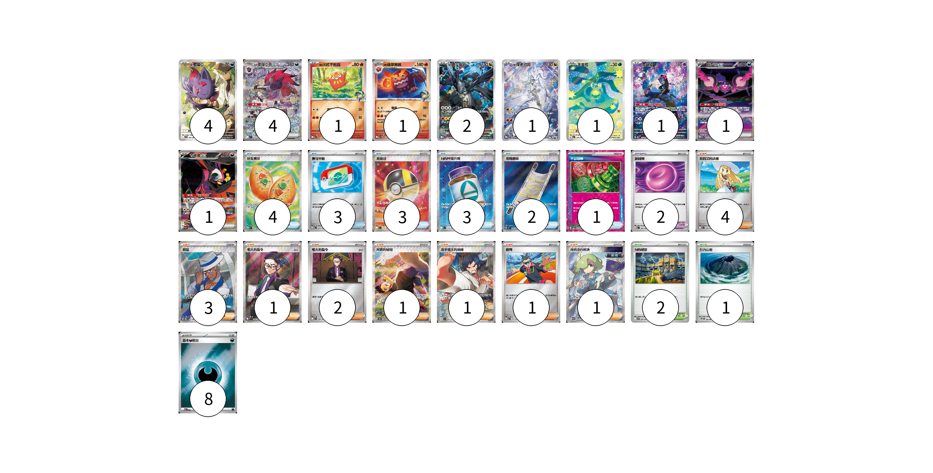 牌組構築方案 以此牌組為基礎新構築牌組 顯示卡面 顯示列表 寶可夢卡(17) 4 4 1 1 2 1 1 1 1 1 寶可夢道具(2) 2 物品卡(16) 4 3 3 3 2 1 支援者卡(14) 4 3 1 2 1 1 1 1 競技場卡(3) 2 1 能量卡(8) 8 寶可夢卡(17) 卡牌名稱 張數 卡牌名稱 張數 N的索羅亞 SV9 108/100 04 N的索羅亞克ex M2a 242/193 04 N的火紅不倒翁 M2a 027/193 01 N的達摩狒狒 M2a 028/193 01 N的捷克羅姆 M2a 210/193 02 N的萊希拉姆 SV9 109/100 01 含羞苞 M2a 196/193 01 願增猿 SV6 107/101 01 桃歹郎ex SV6a 090/064 01 吉雉雞ex SV6a 089/064 01 寶可夢道具(2) 卡牌名稱 張數 卡牌名稱 張數 鎖鏈糬 MC 681/742 02 物品卡(16) 卡牌名稱 張數 卡牌名稱 張數 好友寶芬 M1S 081/063 04 寶可平板 MC 662/742 03 高級球 M2a 216/193 03 N的PP提升劑 M2a 214/193 03 夜間擔架 M1L 083/063 02 不公印章 SV5a 053/066 01 支援者卡(14) 卡牌名稱 張數 卡牌名稱 張數 莉莉艾的決意 MC 729/742 04 席藍 SV8 127/106 03 老大的指令(烏羽) MC 760/742 01 老大的指令 MC 724/742 02 阿杏的秘招 SV8a 228/187 01 空手道王的演練 M2a 220/193 01 裁判 MC 711/742 01 暗碼迷的解讀 SV5M 090/071 01 競技場卡(3) 卡牌名稱 張數 卡牌名稱 張數 N的城堡 SV9 097/100 02 引力山岳 SV8 106/106 01 能量卡(8) 卡牌名稱 張數 卡牌名稱 張數 基本【惡】能量 MC DAR 08 以此牌組為基礎新構築牌組 牌組編碼 RJeDWh-oEzAOf-zOZmie copy 列印牌組單 牌組編碼已複製 分享至SNS