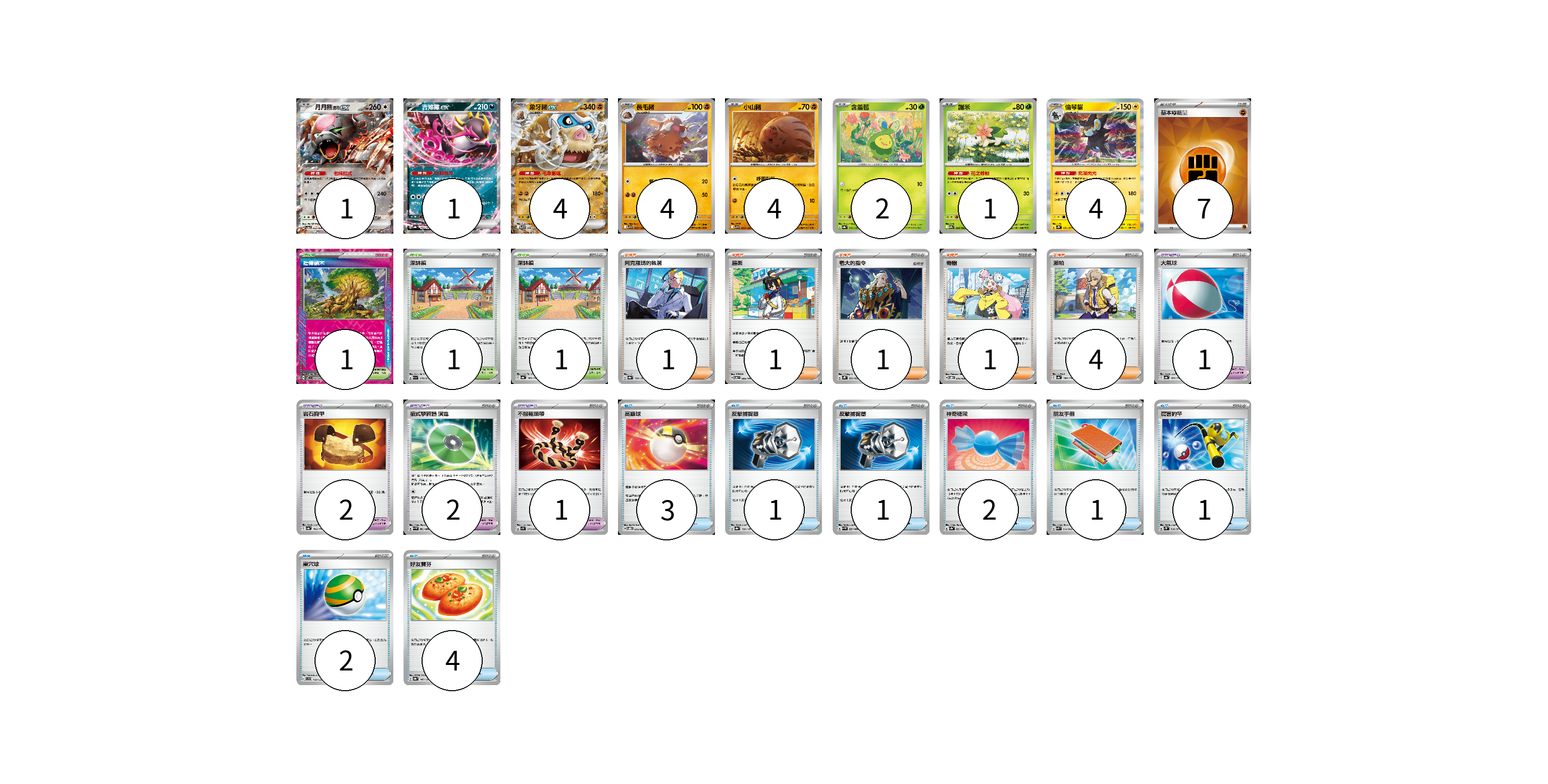 牌組構築方案 以此牌組為基礎新構築牌組 顯示卡面 顯示列表 寶可夢卡(21) 1 1 4 4 4 2 1 4 寶可夢道具(6) 1 2 2 1 物品卡(15) 3 1 1 2 1 1 2 4 支援者卡(8) 1 1 1 1 4 競技場卡(3) 1 1 1 能量卡(7) 7 寶可夢卡(21) 卡牌名稱 張數 卡牌名稱 張數 月月熊 赫月 ex SV5a 052/066 01 吉雉雞ex SV8a 104/187 01 象牙豬ex SV9 046/100 04 長毛豬 SV9 045/100 04 小山豬 SV9 044/100 04 含羞苞 SV8a 001/187 02 謝米 SV9a 006/063 01 倫琴貓 SV2D 021/071 04 寶可夢道具(6) 卡牌名稱 張數 卡牌名稱 張數 大氣球 SV4a 165/190 01 岩石胸甲 SV4a 164/190 02 招式學習器 演進 SV4M 063/066 02 不服輸頭帶 SV1S 073/078 01 物品卡(15) 卡牌名稱 張數 卡牌名稱 張數 高級球 SVOD 012/020 03 反擊捕捉器 SV8a 139/187 01 反擊捕捉器 SV4M 059/066 01 神奇糖果 SV3a 053/062 02 朋友手冊 SVK 014/042 01 厲害釣竿 SV2P 066/071 01 巢穴球 SVD 118/139 02 好友寶芬 SV8a 147/187 04 支援者卡(8) 卡牌名稱 張數 卡牌名稱 張數 阿克羅瑪的執著 SV8a 164/187 01 烏栗 SV6 096/101 01 老大的指令 SVHK 022/022 01 奇樹 SVOD 016/020 01 派帕 SV4a 180/190 04 競技場卡(3) 卡牌名稱 張數 卡牌名稱 張數 壯偉碩木 SV7 101/102 01 深缽鎮 SV1a 070/073 01 深缽鎮 SV4a 185/190 01 能量卡(7) 卡牌名稱 張數 卡牌名稱 張數 基本【鬥】能量 SVK FIG 07 以此牌組為基礎新構築牌組 牌組編碼 RKsybY-nvEijc-knxnsy copy 列印牌組單 牌組編碼已複製 分享至SNS