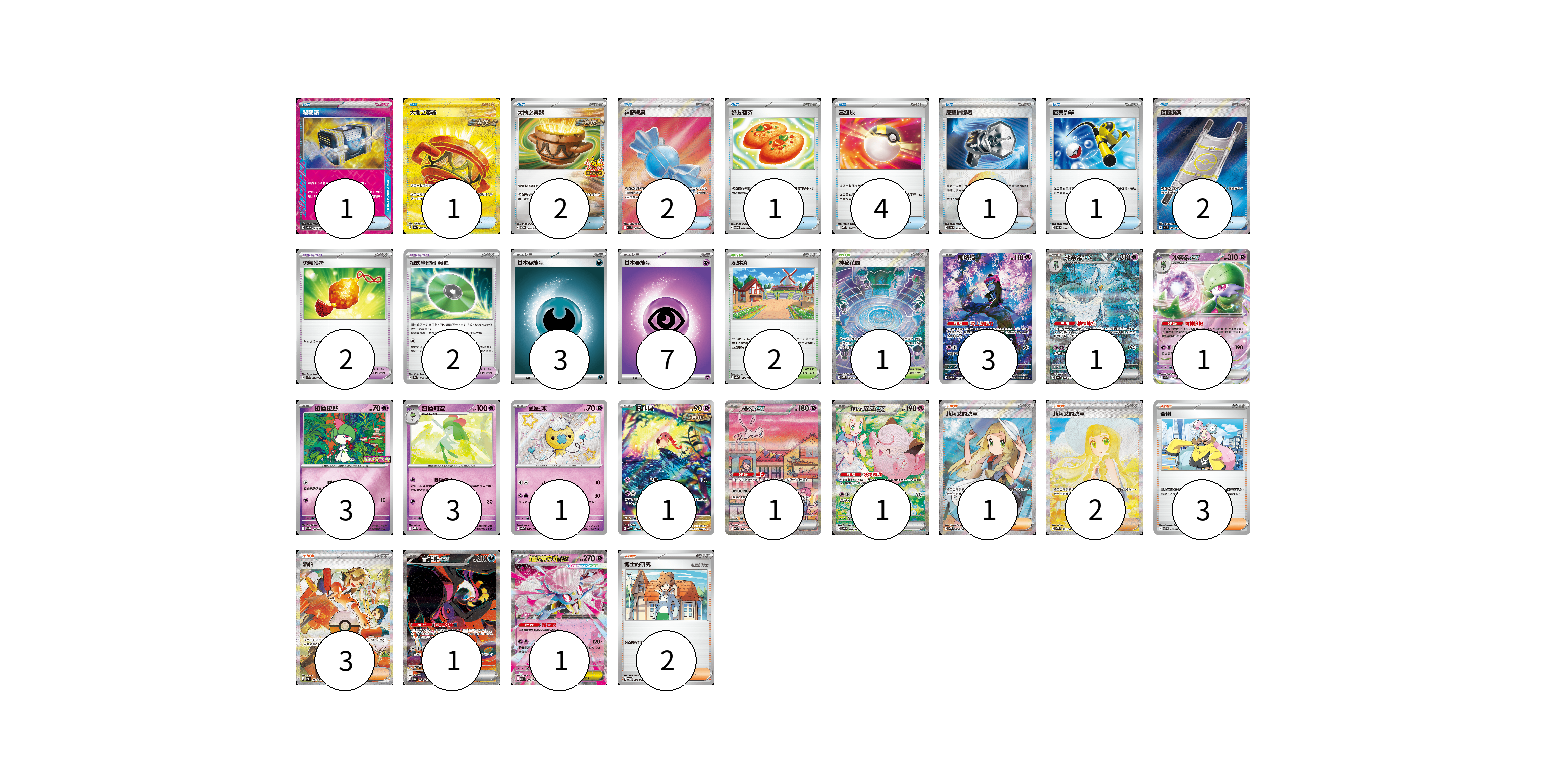 牌組構築方案 以此牌組為基礎新構築牌組 顯示卡面 顯示列表 寶可夢卡(17) 3 1 1 3 3 1 1 1 1 1 1 寶可夢道具(4) 2 2 物品卡(15) 1 1 2 2 1 4 1 1 2 支援者卡(11) 1 2 3 3 2 競技場卡(3) 2 1 能量卡(10) 3 7 寶可夢卡(17) 卡牌名稱 張數 卡牌名稱 張數 願增猿 SV6 107/101 03 沙奈朵ex SV4a 348/190 01 沙奈朵ex SV1S 028/078 01 拉魯拉絲 M-P 005/M-P 03 奇魯莉安 M1S 041/063 03 飄飄球 SV4a 260/190 01 吼叫尾 SV4K 071/066 01 夢幻ex SV2a 205/165 01 莉莉艾的皮皮ex SV9 126/100 01 吉雉雞ex SV6a 089/064 01 超級蒂安希ex MBD 006/022 01 寶可夢道具(4) 卡牌名稱 張數 卡牌名稱 張數 勇氣護符 SVK 024/042 02 招式學習器 演進 SV8a 160/187 02 物品卡(15) 卡牌名稱 張數 卡牌名稱 張數 秘密箱 SV6 092/101 01 大地之容器 SV6a 093/064 01 大地之容器 SV-P 084/SV-P 02 神奇糖果 M1S 082/063 02 好友寶芬 SVOD 011/020 01 高級球 MBD 014/022 04 反擊捕捉器 SV8a 139/187 01 厲害釣竿 SVOD 010/020 01 夜間擔架 M1L 083/063 02 支援者卡(11) 卡牌名稱 張數 卡牌名稱 張數 莉莉艾的決意 M1L 086/063 01 莉莉艾的決意 M1L 091/063 02 奇樹 SVTS 018/022 03 派帕 SV4a 353/190 03 博士的研究 SV11B 084/086 02 競技場卡(3) 卡牌名稱 張數 卡牌名稱 張數 深缽鎮 SV4a 185/190 02 神秘花園 M1S 086/063 01 能量卡(10) 卡牌名稱 張數 卡牌名稱 張數 基本【惡】能量 MBG DAR 03 基本【超】能量 MBD PSY 07 以此牌組為基礎新構築牌組 牌組編碼 RKtLUX-wqPcWl-xlRWah copy 列印牌組單 牌組編碼已複製 分享至SNS
