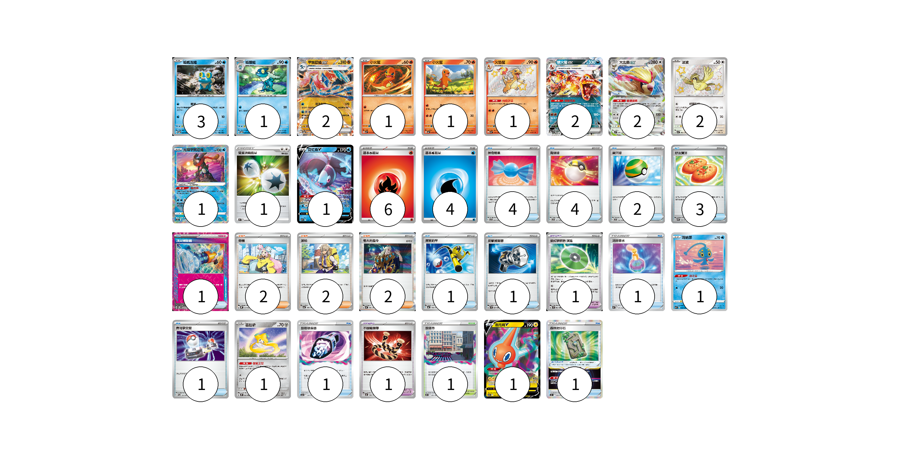牌組構築方案 以此牌組為基礎新構築牌組 顯示卡面 顯示列表 寶可夢卡(20) 3 1 2 1 1 1 2 2 2 1 1 1 1 1 寶可夢道具(3) 1 1 1 物品卡(19) 4 4 2 3 1 1 1 1 1 1 支援者卡(6) 2 2 2 競技場卡(1) 1 能量卡(11) 1 6 4 寶可夢卡(20) 卡牌名稱 張數 卡牌名稱 張數 呱呱泡蛙 SV5a 023/066 03 呱頭蛙 SV5a 024/066 01 甲賀忍蛙ex SV5a 045/066 02 小火龍 SV3 012/108 01 小火龍 SV4a 025/190 01 火恐龍 SV4a 211/190 01 噴火龍ex SV3 066/108 02 大比鳥ex SV3 089/108 02 波波 SV4a 304/190 02 光輝甲賀忍蛙 S12a 033/172 01 霓虹魚V SVF 002/038 01 瑪納霏 SVF 003/038 01 基拉祈 SV3a 042/062 01 洛托姆V S11 037/100 01 寶可夢道具(3) 卡牌名稱 張數 卡牌名稱 張數 招式學習器 演進 SV4M 063/066 01 不服輸頭帶 SV4a 168/190 01 森林封印石 S12 092/098 01 物品卡(19) 卡牌名稱 張數 卡牌名稱 張數 神奇糖果 SVF 020/038 04 高級球 SVF 017/038 04 巢穴球 SVF 016/038 02 好友寶芬 SV5K 063/071 03 頂尖捕捉器 SV5M 062/071 01 厲害釣竿 SV4a 158/190 01 反擊捕捉器 SV4M 059/066 01 消除香水 SVF 011/038 01 寶可夢交替 SV-P 014/SV-P 01 放逐吸塵器 S12a 144/172 01 支援者卡(6) 卡牌名稱 張數 卡牌名稱 張數 奇樹 SVHK 019/022 02 派帕 SV4a 180/190 02 老大的指令 SV4a 181/190 02 競技場卡(1) 卡牌名稱 張數 卡牌名稱 張數 放逐市 S11 099/100 01 能量卡(11) 卡牌名稱 張數 卡牌名稱 張數 雙重渦輪能量 SVF 038/038 01 基本【火】能量 SVF FIR 06 基本【水】能量 SVF WAT 04 以此牌組為基礎新構築牌組 牌組編碼 RQUmiD-yPMXbD-HodNHN copy 列印牌組單 牌組編碼已複製 分享至SNS