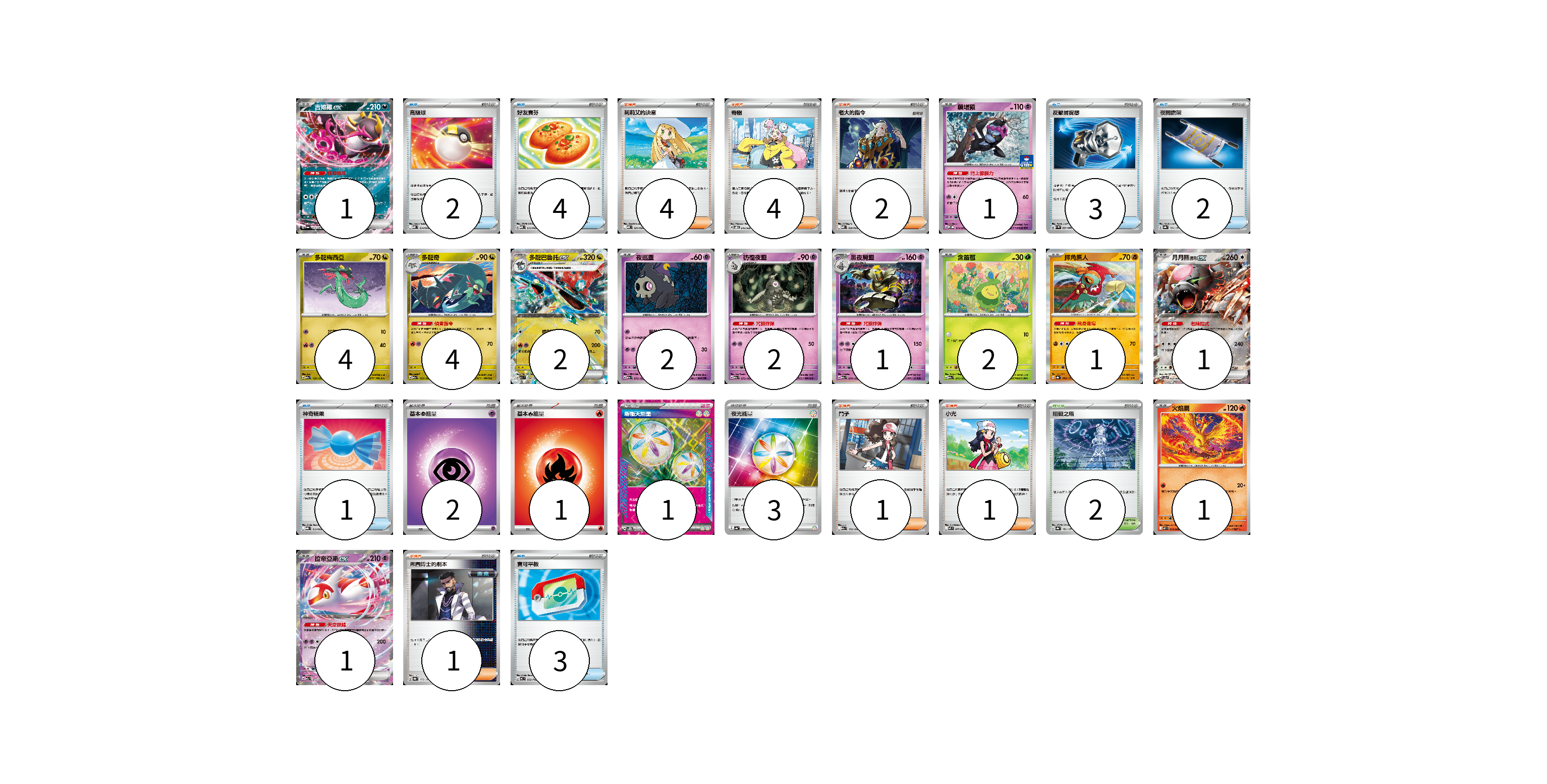 牌組構築方案 以此牌組為基礎新構築牌組 顯示卡面 顯示列表 寶可夢卡(23) 1 1 4 4 2 2 2 1 2 1 1 1 1 物品卡(15) 2 4 3 2 1 3 支援者卡(13) 4 4 2 1 1 1 競技場卡(2) 2 能量卡(7) 2 1 1 3 寶可夢卡(23) 卡牌名稱 張數 卡牌名稱 張數 吉雉雞ex SV6a 038/064 01 願增猿 M-P 014/M-P 01 多龍梅西亞 M2a 132/193 04 多龍奇 M2a 133/193 04 多龍巴魯托ex M2a 134/193 02 夜巡靈 M2a 072/193 02 彷徨夜靈 M2a 073/193 02 黑夜魔靈 M2a 074/193 01 含羞苞 M2a 011/193 02 摔角鷹人 SV8a 084/187 01 月月熊 赫月 ex SV5a 052/066 01 火焰鳥 M2 014/080 01 拉帝亞斯ex M2a 075/193 01 物品卡(15) 卡牌名稱 張數 卡牌名稱 張數 高級球 MBD 014/022 02 好友寶芬 MBD 013/022 04 反擊捕捉器 SV4M 059/066 03 夜間擔架 SV8a 151/187 02 神奇糖果 MBG 013/022 01 寶可平板 MC 662/742 03 支援者卡(13) 卡牌名稱 張數 卡牌名稱 張數 莉莉艾的決意 MBD 021/022 04 奇樹 SVOD 016/020 04 老大的指令 MBD 020/022 02 鬥子 M2a 172/193 01 小光 M2 077/080 01 弗圖博士的劇本 SV8a 175/187 01 競技場卡(2) 卡牌名稱 張數 卡牌名稱 張數 阻礙之塔 SV8a 181/187 02 能量卡(7) 卡牌名稱 張數 卡牌名稱 張數 基本【超】能量 MBD PSY 02 基本【火】能量 M-P FIR 01 新衝天能量 SV5K 071/071 01 夜光能量 SV4a 190/190 03 以此牌組為基礎新構築牌組 牌組編碼 RSIPif-uDPUxZ-ZunEoh copy 列印牌組單 牌組編碼已複製 分享至SNS