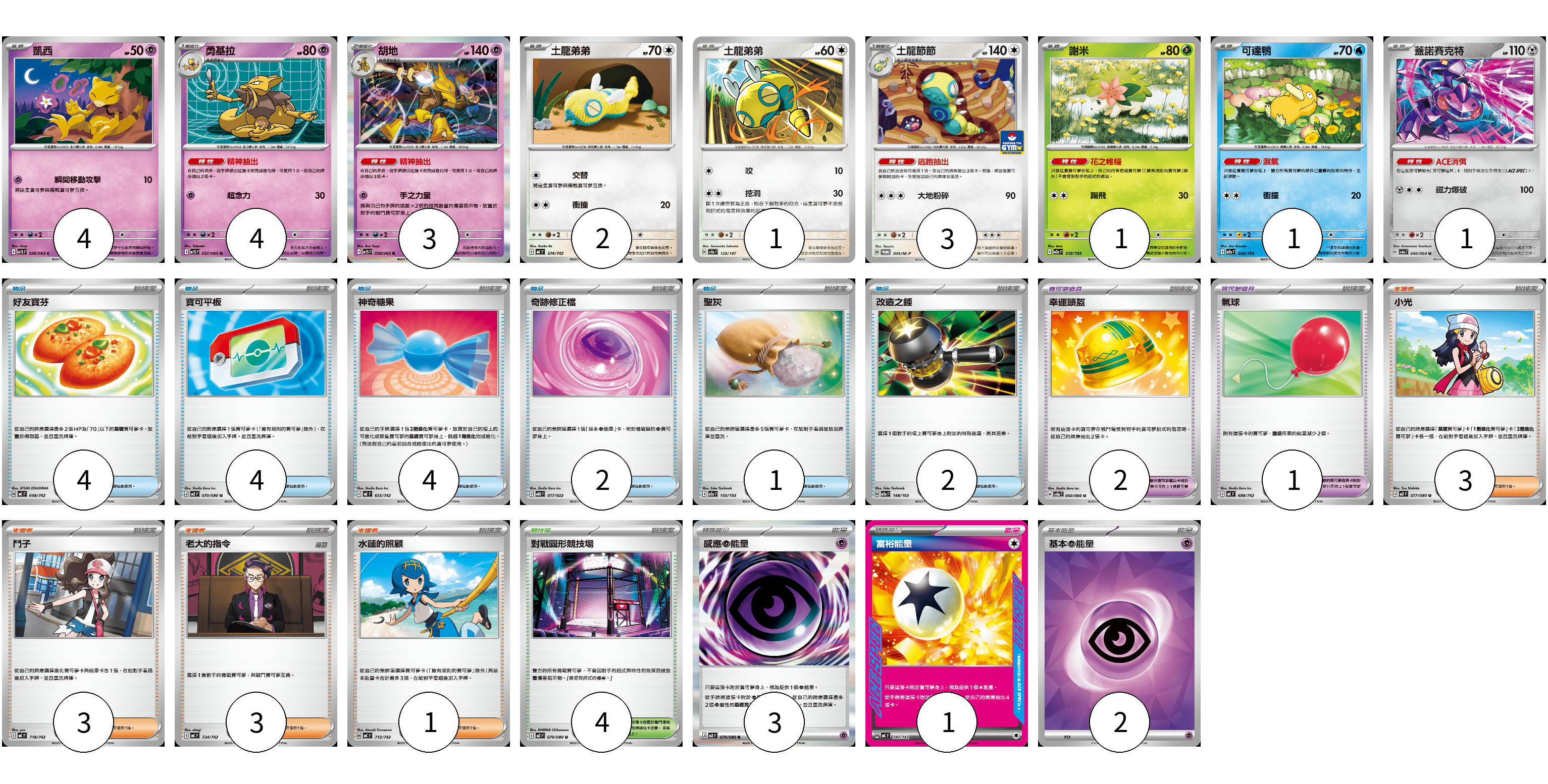 牌組構築方案 以此牌組為基礎新構築牌組 顯示卡面 顯示列表 寶可夢卡(20) 4 4 3 2 1 3 1 1 1 寶可夢道具(3) 2 1 物品卡(17) 4 4 4 2 1 2 支援者卡(10) 3 3 3 1 競技場卡(4) 4 能量卡(6) 3 1 2 寶可夢卡(20) 卡牌名稱 張數 卡牌名稱 張數 凱西 M1S 036/063 04 勇基拉 M1S 037/063 04 胡地 M1S 038/063 03 土龍弟弟 MC 574/742 02 土龍弟弟 SV8a 129/187 01 土龍節節 M-P 045/M-P 03 謝米 M2a 012/193 01 可達鴨 M2a 032/193 01 蓋諾賽克特 SV6a 040/064 01 寶可夢道具(3) 卡牌名稱 張數 卡牌名稱 張數 幸運頭盔 SV5a 060/066 02 氣球 MC 688/742 01 物品卡(17) 卡牌名稱 張數 卡牌名稱 張數 好友寶芬 MC 648/742 04 寶可平板 M3 070/080 04 神奇糖果 MC 655/742 04 奇跡修正檔 MBD 017/022 02 聖灰 M2a 150/193 01 改造之錘 M2a 148/193 02 支援者卡(10) 卡牌名稱 張數 卡牌名稱 張數 小光 M2 077/080 03 鬥子 MC 718/742 03 老大的指令 MC 724/742 03 水蓮的照顧 MC 712/742 01 競技場卡(4) 卡牌名稱 張數 卡牌名稱 張數 對戰圓形競技場 M2 079/080 04 能量卡(6) 卡牌名稱 張數 卡牌名稱 張數 感應【超】能量 M3 079/080 03 富裕能量 MC 740/742 01 基本【超】能量 SVOD PSY 02 以此牌組為基礎新構築牌組 牌組編碼 RTncdA-FfqqAb-kHkeSO copy 列印牌組單 牌組編碼已複製 分享至SNS