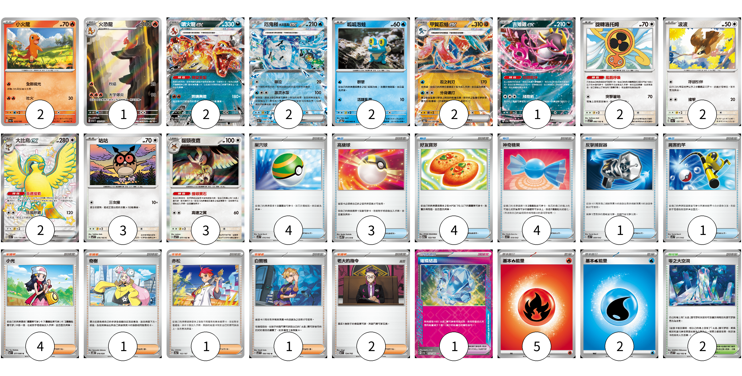 牌組構築方案 以此牌組為基礎新構築牌組 顯示卡面 顯示列表 寶可夢卡(24) 2 1 2 2 2 2 1 2 2 2 3 3 寶可夢道具(1) 1 物品卡(17) 4 3 4 4 1 1 支援者卡(9) 4 1 1 1 2 競技場卡(2) 2 能量卡(7) 5 2 寶可夢卡(24) 卡牌名稱 張數 卡牌名稱 張數 小火龍 SV4a 025/190 02 火恐龍 SV2a 169/165 01 噴火龍ex SV4a 115/190 02 厄鬼椪 水井面具ex SV8a 050/187 02 呱呱泡蛙 SV5a 023/066 02 甲賀忍蛙ex SV5a 045/066 02 吉雉雞ex SV6a 038/064 01 旋轉洛托姆 SV7 080/102 02 波波 SV4a 137/190 02 大比鳥ex SV4a 335/190 02 咕咕 SV7 076/102 03 貓頭夜鷹 SV7 077/102 03 寶可夢道具(1) 卡牌名稱 張數 卡牌名稱 張數 璀璨結晶 SV8a 152/187 01 物品卡(17) 卡牌名稱 張數 卡牌名稱 張數 巢穴球 SVK 016/042 04 高級球 SVTH 011/018 03 好友寶芬 M2a 153/193 04 神奇糖果 SVK 019/042 04 反擊捕捉器 SVK 009/042 01 厲害釣竿 SVK 011/042 01 支援者卡(9) 卡牌名稱 張數 卡牌名稱 張數 小光 M2 077/080 04 奇樹 SVOD 016/020 01 赤松 SV8a 163/187 01 白蕾雅 SV7 100/102 01 老大的指令 MC 724/742 02 競技場卡(2) 卡牌名稱 張數 卡牌名稱 張數 零之大空洞 SV7 102/102 02 能量卡(7) 卡牌名稱 張數 卡牌名稱 張數 基本【火】能量 MC FIR 05 基本【水】能量 MC WAT 02 以此牌組為基礎新構築牌組 牌組編碼 RUrQzE-PzdITU-isdaMH copy 列印牌組單 牌組編碼已複製 分享至SNS