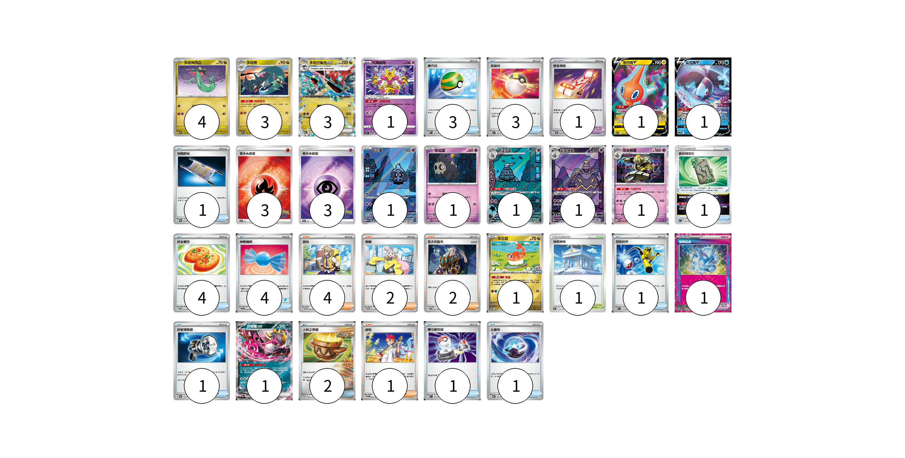 牌組構築方案 以此牌組為基礎新構築牌組 顯示卡面 顯示列表 寶可夢卡(20) 4 3 3 1 1 1 1 1 1 1 1 1 1 寶可夢道具(2) 1 1 物品卡(22) 3 3 1 1 4 4 1 1 2 1 1 支援者卡(9) 4 2 2 1 競技場卡(1) 1 能量卡(6) 3 3 寶可夢卡(20) 卡牌名稱 張數 卡牌名稱 張數 多龍梅西亞 SV8a 118/187 04 多龍奇 SV8a 119/187 03 多龍巴魯托ex SV8a 120/187 03 光輝胡地 SVTM 006/022 01 洛托姆V S11 037/100 01 霓虹魚V SVHK 004/022 01 夜巡靈 SV6a 068/064 01 夜巡靈 SV6a 018/064 01 彷徨夜靈 SV6a 069/064 01 黑夜魔靈 SV6a 070/064 01 黑夜魔靈 SV6a 020/064 01 米立龍 SV-P 186/SV-P 01 吉雉雞ex SV8a 104/187 01 寶可夢道具(2) 卡牌名稱 張數 卡牌名稱 張數 緊急滑板 SV5K 064/071 01 璀璨結晶 SV7 094/102 01 物品卡(22) 卡牌名稱 張數 卡牌名稱 張數 巢穴球 SVM 133/175 03 高級球 SVM 134/175 03 夜間擔架 SV6a 056/064 01 森林封印石 SVF 024/038 01 好友寶芬 SVTG 011/019 04 神奇糖果 SVI 053/066 04 厲害釣竿 SVK 011/042 01 反擊捕捉器 SV8a 139/187 01 大地之容器 SV-P 084/SV-P 02 寶可夢交替 SVM 136/175 01 太晶珠 SV8a 145/187 01 支援者卡(9) 卡牌名稱 張數 卡牌名稱 張數 派帕 SVTM 019/022 04 奇樹 SVTG 017/019 02 老大的指令 SVF 032/038 02 赤松 SV7 097/102 01 競技場卡(1) 卡牌名稱 張數 卡牌名稱 張數 神奧神殿 S10P 067/067 01 能量卡(6) 卡牌名稱 張數 卡牌名稱 張數 基本火能量 S10b FIR 03 基本超能量 S10b PSY 03 以此牌組為基礎新構築牌組 牌組編碼 RWvIVJ-OplkXj-iOrqFz copy 列印牌組單 牌組編碼已複製 分享至SNS