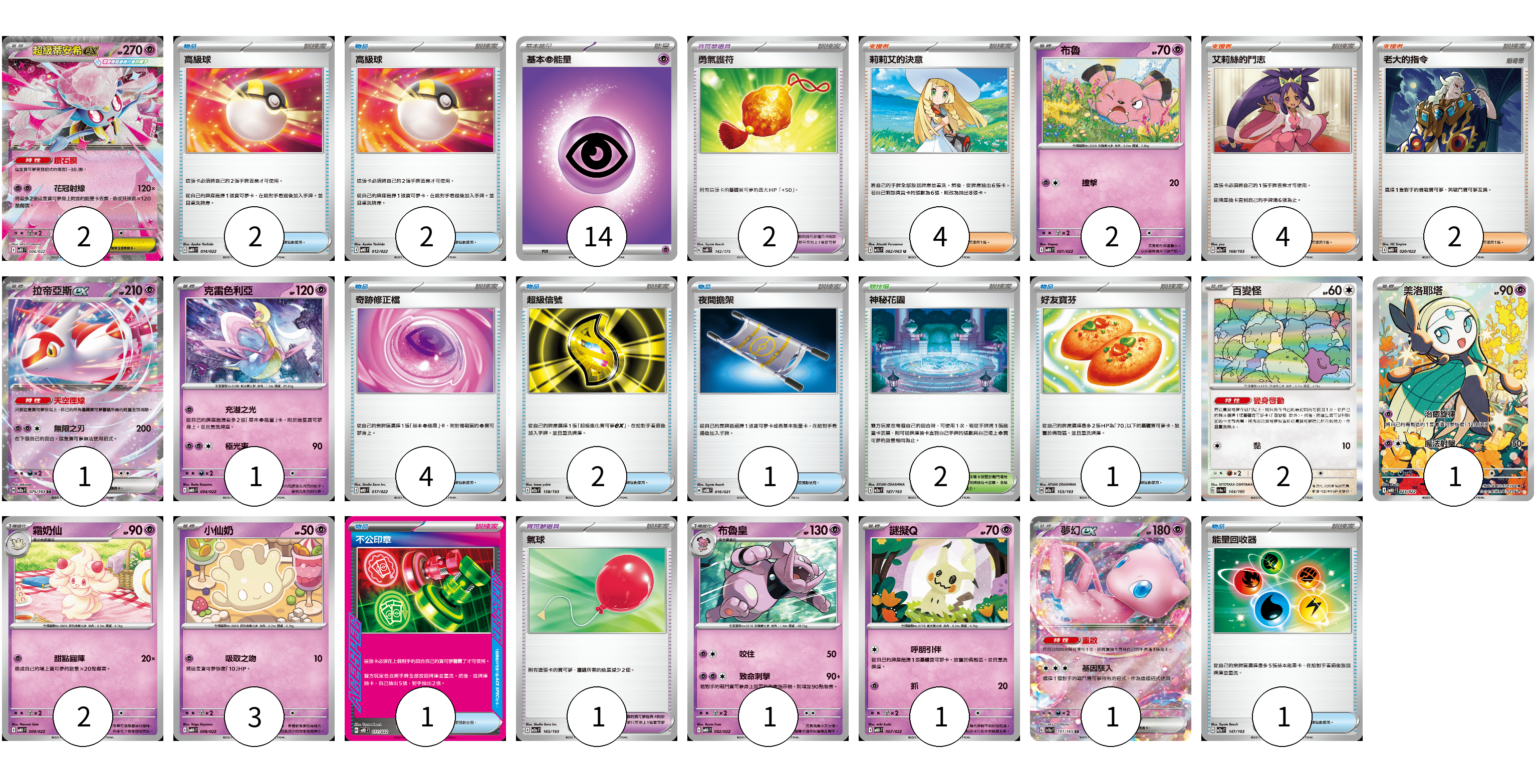 牌組構築方案 以此牌組為基礎新構築牌組 顯示卡面 顯示列表 寶可夢卡(17) 2 2 1 1 2 1 2 3 1 1 1 寶可夢道具(3) 2 1 物品卡(14) 2 2 4 2 1 1 1 1 支援者卡(10) 4 4 2 競技場卡(2) 2 能量卡(14) 14 寶可夢卡(17) 卡牌名稱 張數 卡牌名稱 張數 超級蒂安希ex MBD 006/022 02 布魯 MBD 001/022 02 拉帝亞斯ex M2a 075/193 01 克雷色利亞 MBD 004/022 01 百變怪 SV4a 144/190 02 美洛耶塔 MBD 023/022 01 霜奶仙 MBD 009/022 02 小仙奶 MBD 008/022 03 布魯皇 MBD 002/022 01 謎擬Q MBD 007/022 01 夢幻ex SV2a 151/165 01 寶可夢道具(3) 卡牌名稱 張數 卡牌名稱 張數 勇氣護符 SVM 142/175 02 氣球 M2a 165/193 01 物品卡(14) 卡牌名稱 張數 卡牌名稱 張數 高級球 MBD 014/022 02 高級球 MBG 012/022 02 奇跡修正檔 MBD 017/022 04 超級信號 M2a 158/193 02 夜間擔架 SVOM 016/021 01 好友寶芬 M2a 153/193 01 不公印章 MBD 011/022 01 能量回收器 M2a 147/193 01 支援者卡(10) 卡牌名稱 張數 卡牌名稱 張數 莉莉艾的決意 M1L 062/063 04 艾莉絲的鬥志 M2a 168/193 04 老大的指令 MBD 020/022 02 競技場卡(2) 卡牌名稱 張數 卡牌名稱 張數 神秘花園 M2a 187/193 02 能量卡(14) 卡牌名稱 張數 卡牌名稱 張數 基本【超】能量 M-P PSY 14 以此牌組為基礎新構築牌組 牌組編碼 RXytzb-TDZBfO-dMyniz copy 列印牌組單 牌組編碼已複製 分享至SNS