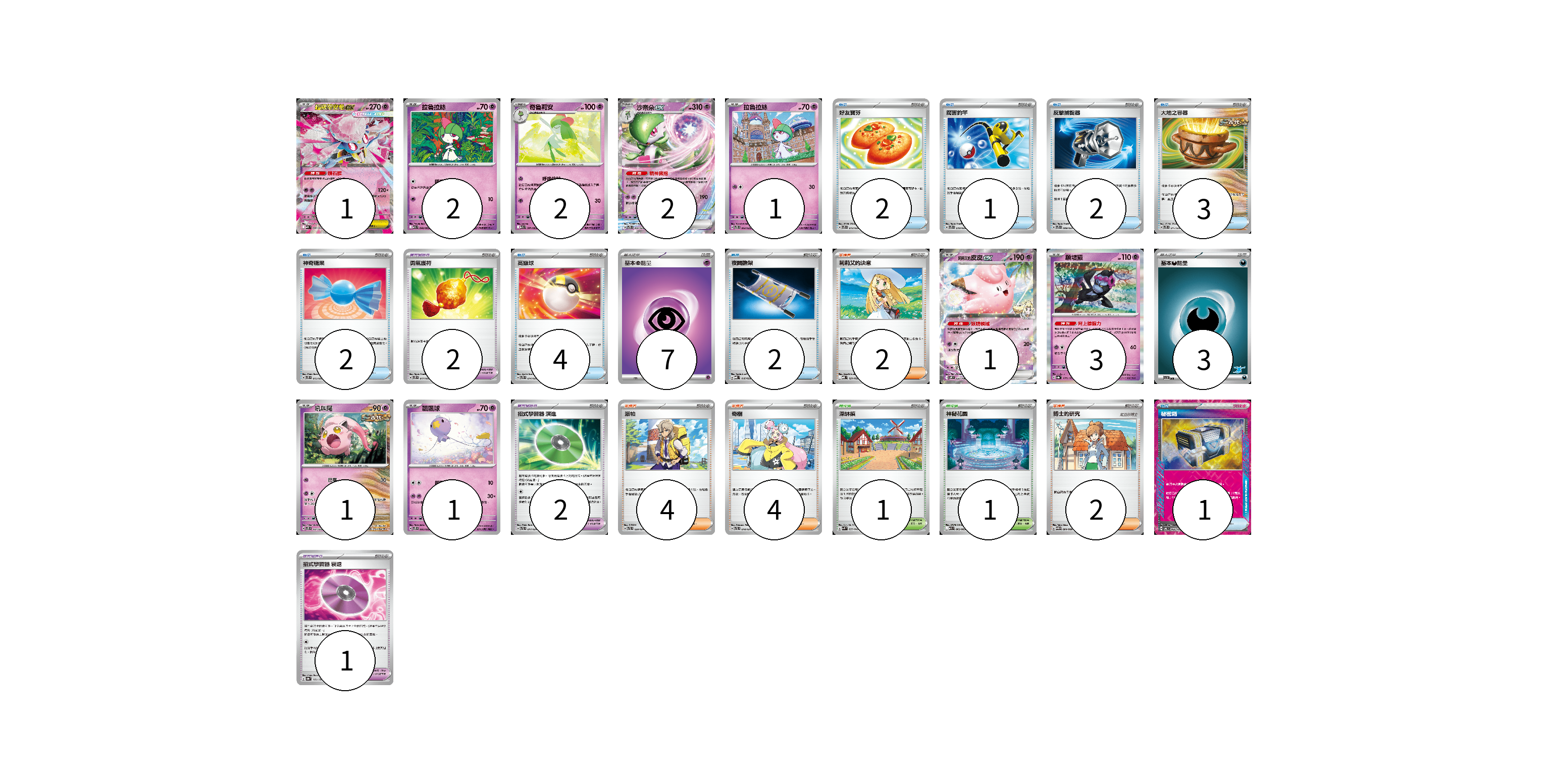 牌組構築方案 以此牌組為基礎新構築牌組 顯示卡面 顯示列表 寶可夢卡(14) 1 2 2 2 1 1 3 1 1 寶可夢道具(9) 2 2 4 1 物品卡(17) 2 1 2 3 2 4 2 1 支援者卡(8) 2 4 2 競技場卡(2) 1 1 能量卡(10) 7 3 寶可夢卡(14) 卡牌名稱 張數 卡牌名稱 張數 超級蒂安希ex MBD 006/022 01 拉魯拉絲 M1S 040/063 02 奇魯莉安 M1S 041/063 02 沙奈朵ex SVTS 004/022 02 拉魯拉絲 SVTS 002/022 01 莉莉艾的皮皮ex SV9 033/100 01 願增猿 SV8a 075/187 03 吼叫尾 SVTS 007/022 01 飄飄球 SVTS 005/022 01 寶可夢道具(9) 卡牌名稱 張數 卡牌名稱 張數 勇氣護符 SVTS 017/022 02 招式學習器 演進 SVTL 017/021 02 奇樹 SVTL 018/021 04 招式學習器 衰退 SV8a 161/187 01 物品卡(17) 卡牌名稱 張數 卡牌名稱 張數 好友寶芬 SVTS 012/022 02 厲害釣竿 SVTS 010/022 01 反擊捕捉器 SVTS 009/022 02 大地之容器 SVTS 011/022 03 神奇糖果 SVTS 015/022 02 高級球 SVTS 014/022 04 夜間擔架 MBD 016/022 02 秘密箱 SV6 092/101 01 支援者卡(8) 卡牌名稱 張數 卡牌名稱 張數 莉莉艾的決意 MBD 021/022 02 派帕 SVTL 020/021 04 博士的研究 SV11B 084/086 02 競技場卡(2) 卡牌名稱 張數 卡牌名稱 張數 深缽鎮 SVK 039/042 01 神秘花園 M1S 063/063 01 能量卡(10) 卡牌名稱 張數 卡牌名稱 張數 基本【超】能量 SVTS PSY 07 基本【惡】能量 SVI DAR 03 以此牌組為基礎新構築牌組 牌組編碼 RYQKXZ-CteJWJ-QpfWLA copy 列印牌組單 牌組編碼已複製 分享至SNS