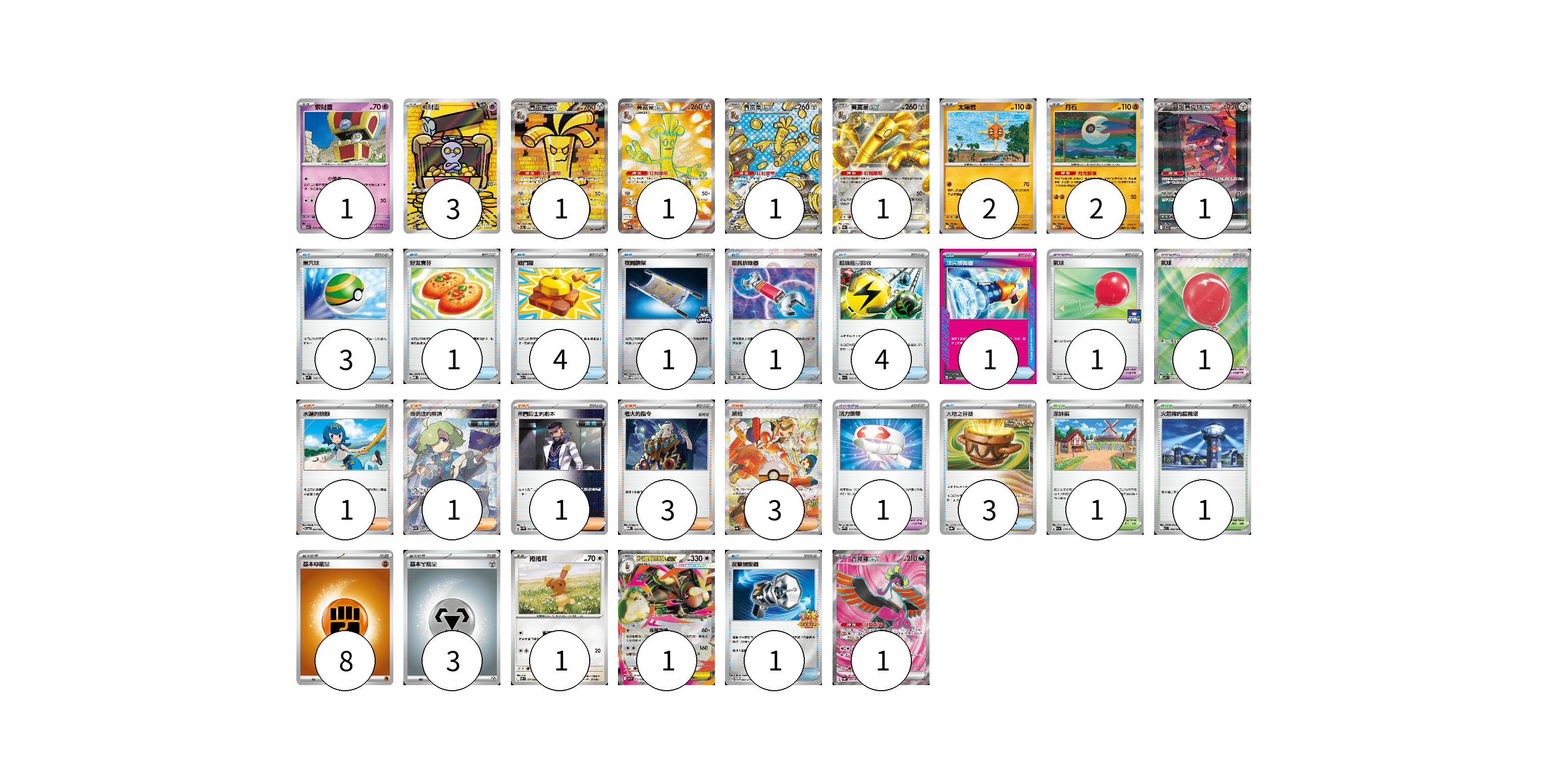 牌組構築方案 以此牌組為基礎新構築牌組 顯示卡面 顯示列表 寶可夢卡(16) 1 3 1 1 1 1 2 2 1 1 1 1 寶可夢道具(3) 1 1 1 物品卡(19) 3 1 4 1 1 4 1 3 1 支援者卡(9) 1 1 1 3 3 競技場卡(2) 1 1 能量卡(11) 8 3 寶可夢卡(16) 卡牌名稱 張數 卡牌名稱 張數 索財靈 SV7a 024/064 01 索財靈 SV3a 068/062 03 賽富豪ex SV3a 087/062 01 賽富豪ex SV3a 079/062 01 賽富豪ex SV8a 220/187 01 賽富豪ex SV3a 050/062 01 太陽岩 M1L 027/063 02 月石 M1L 026/063 02 蓋諾賽克特ex SV11B 172/086 01 捲捲耳 M2 071/080 01 超級長耳兔ex M2 072/080 01 吉雉雞ex SV6a 081/064 01 寶可夢道具(3) 卡牌名稱 張數 卡牌名稱 張數 氣球 M-P 047/M-P 01 氣球 M1L 084/063 01 活力頭帶 SVAW 019/023 01 物品卡(19) 卡牌名稱 張數 卡牌名稱 張數 巢穴球 SVM 133/175 03 好友寶芬 MBD 013/022 01 戰鬥鑼 M1L 059/063 04 夜間擔架 SV-P 204/SV-P 01 道具拆除器 SV11W 080/086 01 超級能量回收 SV1a 064/073 04 頂尖捕捉器 MBG 014/022 01 大地之容器 SV8a 143/187 03 反擊捕捉器 SV-P 083/SV-P 01 支援者卡(9) 卡牌名稱 張數 卡牌名稱 張數 水蓮的照顧 SV5a 064/066 01 暗碼迷的解讀 SV5M 090/071 01 弗圖博士的劇本 SV4M 065/066 01 老大的指令 MBD 020/022 03 派帕 SV4a 353/190 03 競技場卡(2) 卡牌名稱 張數 卡牌名稱 張數 深缽鎮 SV1a 070/073 01 火箭隊的監視塔 SV10 096/098 01 能量卡(11) 卡牌名稱 張數 卡牌名稱 張數 基本【鬥】能量 M-P FIG 08 基本【鋼】能量 M-P MET 03 以此牌組為基礎新構築牌組 牌組編碼 RbCMKi-SkNbWf-dYTsbF copy 列印牌組單 牌組編碼已複製 分享至SNS