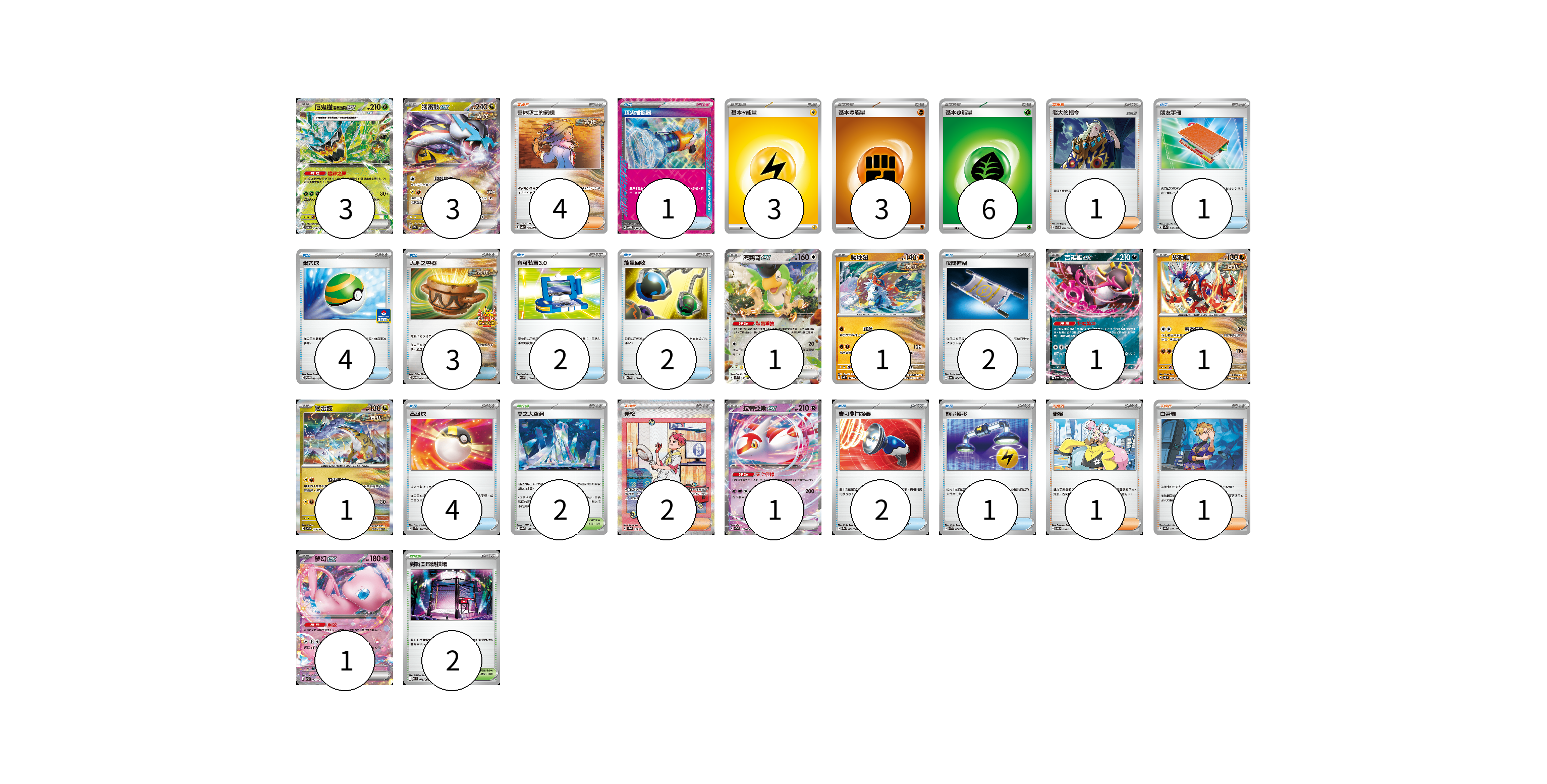 牌組構築方案 以此牌組為基礎新構築牌組 顯示卡面 顯示列表 寶可夢卡(13) 3 3 1 1 1 1 1 1 1 物品卡(22) 1 1 4 3 2 2 2 4 2 1 支援者卡(9) 4 1 2 1 1 競技場卡(4) 2 2 能量卡(12) 3 3 6 寶可夢卡(13) 卡牌名稱 張數 卡牌名稱 張數 厄鬼椪 碧草面具ex SV6 016/101 03 猛雷鼓ex SV5K 053/071 03 怒鸚哥ex SV2P 065/071 01 爬地翅 SV4K 041/066 01 吉雉雞ex SV6a 038/064 01 故勒頓 SV8 069/106 01 猛雷鼓 SV7 075/102 01 拉帝亞斯ex SV7a 019/064 01 夢幻ex SVK 001/042 01 物品卡(22) 卡牌名稱 張數 卡牌名稱 張數 頂尖捕捉器 SV5M 062/071 01 朋友手冊 SV1S 069/078 01 巢穴球 SV-P 091/SV-P 04 大地之容器 SV-P 084/SV-P 03 寶可裝置3.0 SVAM 017/023 02 能量回收 SVAW 011/023 02 夜間擔架 SV6a 056/064 02 高級球 SVK 018/042 04 寶可夢捕捉器 SV9a 059/063 02 能量轉移 SVK 008/042 01 支援者卡(9) 卡牌名稱 張數 卡牌名稱 張數 奧琳博士的氣魄 SV4K 064/066 04 老大的指令 SVF 032/038 01 赤松 SV8a 227/187 02 奇樹 SVOD 016/020 01 白蕾雅 SV8a 176/187 01 競技場卡(4) 卡牌名稱 張數 卡牌名稱 張數 零之大空洞 SV8a 182/187 02 對戰圓形競技場 M2 079/080 02 能量卡(12) 卡牌名稱 張數 卡牌名稱 張數 基本【雷】能量 SVF LIG 03 基本【鬥】能量 SVF FIG 03 基本【草】能量 SVF GRA 06 以此牌組為基礎新構築牌組 牌組編碼 RbvyTi-QaYFUN-HImpbr copy 列印牌組單 牌組編碼已複製 分享至SNS