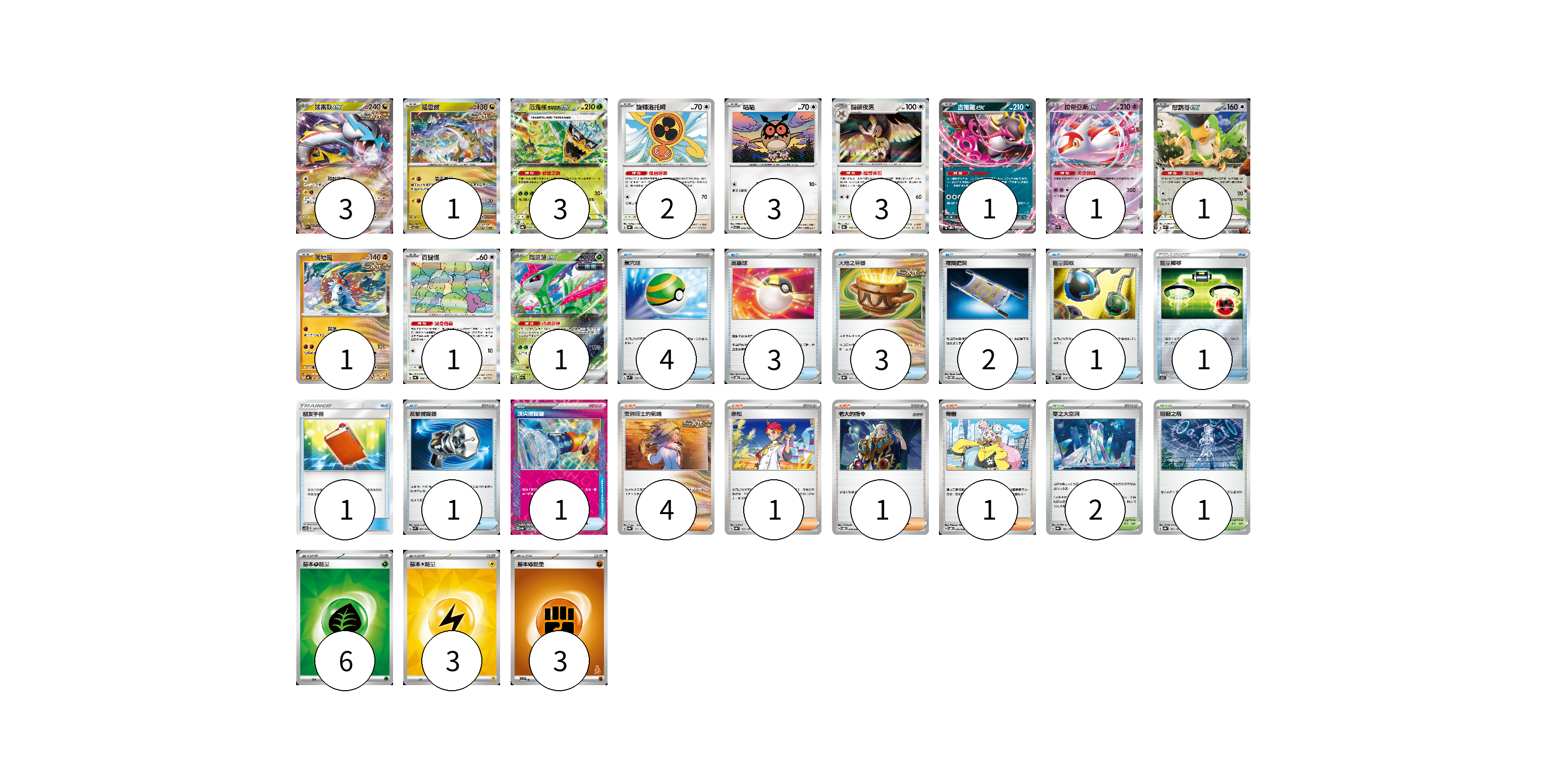 牌組構築方案 以此牌組為基礎新構築牌組 顯示卡面 顯示列表 寶可夢卡(21) 3 1 3 2 3 3 1 1 1 1 1 1 物品卡(17) 4 3 3 2 1 1 1 1 1 支援者卡(7) 4 1 1 1 競技場卡(3) 2 1 能量卡(12) 6 3 3 寶可夢卡(21) 卡牌名稱 張數 卡牌名稱 張數 猛雷鼓ex SV5K 053/071 03 猛雷鼓 SV7 075/102 01 厄鬼椪 碧草面具ex SV8a 020/187 03 旋轉洛托姆 SV8a 131/187 02 咕咕 SV7 076/102 03 貓頭夜鷹 SV8a 128/187 03 吉雉雞ex SVOD 004/020 01 拉帝亞斯ex SV7a 019/064 01 怒鸚哥ex SVK 006/042 01 爬地翅 SV4K 041/066 01 百變怪 SV4a 144/190 01 鐵斑葉ex SV5M 016/071 01 物品卡(17) 卡牌名稱 張數 卡牌名稱 張數 巢穴球 SVM 133/175 04 高級球 SVOD 012/020 03 大地之容器 SV8a 143/187 03 夜間擔架 SVOM 016/021 02 能量回收 SVM 125/175 01 能量轉移 SO 017/030 01 朋友手冊 AC2D 145/176 01 反擊捕捉器 SVK 009/042 01 頂尖捕捉器 SV8a 148/187 01 支援者卡(7) 卡牌名稱 張數 卡牌名稱 張數 奧琳博士的氣魄 SV8a 167/187 04 赤松 SV8a 163/187 01 老大的指令 SVOD 019/020 01 奇樹 SVOD 016/020 01 競技場卡(3) 卡牌名稱 張數 卡牌名稱 張數 零之大空洞 SV8a 182/187 02 阻礙之塔 SV8a 181/187 01 能量卡(12) 卡牌名稱 張數 卡牌名稱 張數 基本【草】能量 SVK GRA 06 基本【雷】能量 SVK LIG 03 基本【鬥】能量 SVI FIG 03 以此牌組為基礎新構築牌組 牌組編碼 RcDfdt-MJkcGP-laXpzS copy 列印牌組單 牌組編碼已複製 分享至SNS