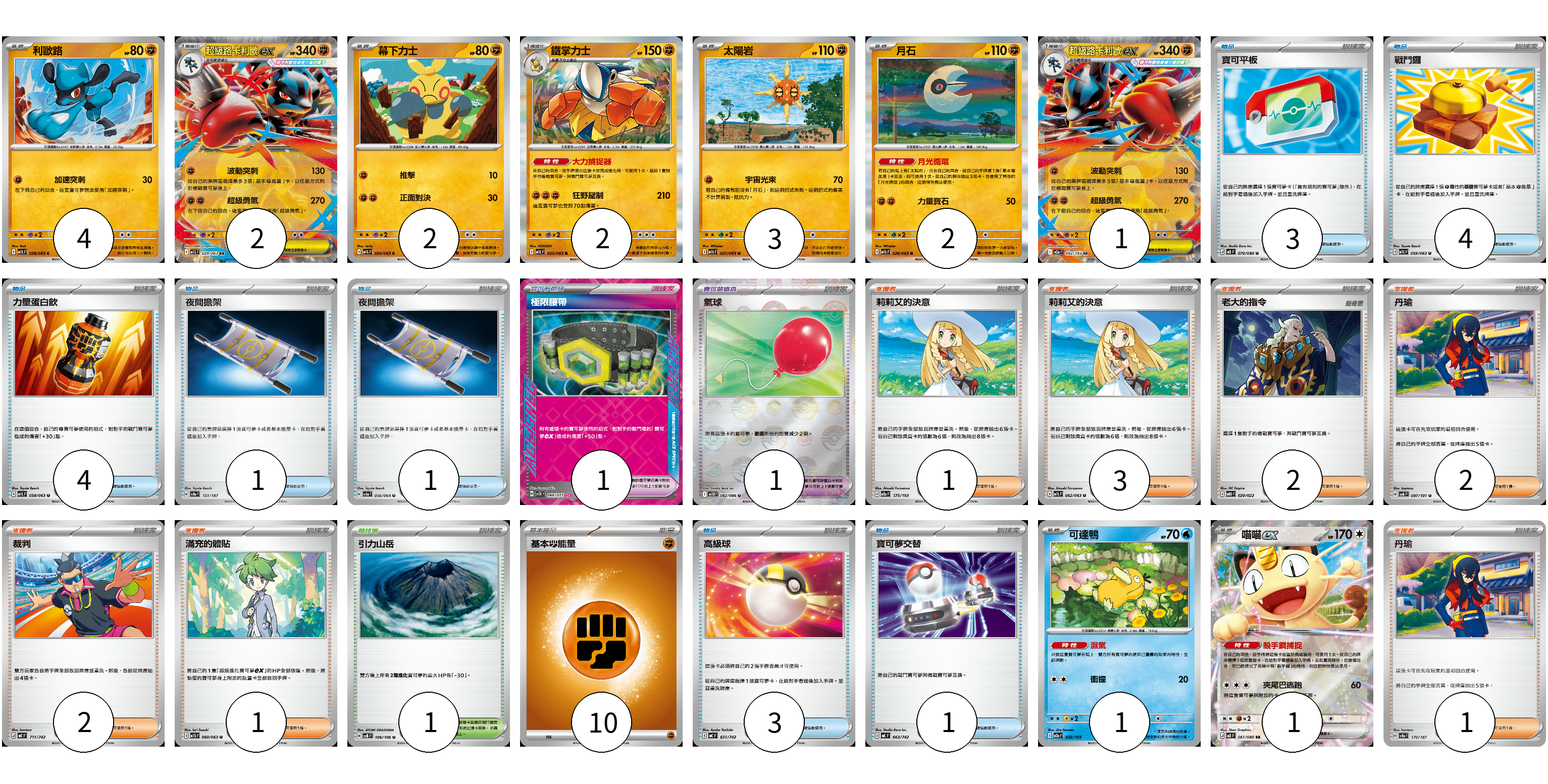 牌組構築方案 以此牌組為基礎新構築牌組 顯示卡面 顯示列表 寶可夢卡(18) 4 2 2 2 3 2 1 1 1 寶可夢道具(2) 1 1 物品卡(17) 3 4 4 1 1 3 1 支援者卡(12) 1 3 2 2 2 1 1 競技場卡(1) 1 能量卡(10) 10 寶可夢卡(18) 卡牌名稱 張數 卡牌名稱 張數 利歐路 M1L 028/063 04 超級路卡利歐ex M1L 029/063 02 幕下力士 M1L 024/063 02 鐵掌力士 M1L 025/063 02 太陽岩 M1L 027/063 03 月石 M1L 026/063 02 超級路卡利歐ex M2a 092/193 01 可達鴨 M2a 032/193 01 喵喵ex M3 061/080 01 寶可夢道具(2) 卡牌名稱 張數 卡牌名稱 張數 極限腰帶 SV5K 066/071 01 氣球 SV11B 082/086 01 物品卡(17) 卡牌名稱 張數 卡牌名稱 張數 寶可平板 M3 070/080 03 戰鬥鑼 M1L 059/063 04 力量蛋白飲 M1L 058/063 04 夜間擔架 SV8a 151/187 01 夜間擔架 SV6a 056/064 01 高級球 MC 651/742 03 寶可夢交替 MC 663/742 01 支援者卡(12) 卡牌名稱 張數 卡牌名稱 張數 莉莉艾的決意 M2a 175/193 01 莉莉艾的決意 M1L 062/063 03 老大的指令 MBD 020/022 02 丹瑜 SV6 097/101 02 裁判 MC 711/742 02 滿充的體貼 M1S 060/063 01 丹瑜 SV8a 170/187 01 競技場卡(1) 卡牌名稱 張數 卡牌名稱 張數 引力山岳 SV8 106/106 01 能量卡(10) 卡牌名稱 張數 卡牌名稱 張數 基本【鬥】能量 MC FIG 10 以此牌組為基礎新構築牌組 牌組編碼 RcnQgG-pgYzQk-iroWqO copy 列印牌組單 牌組編碼已複製 分享至SNS