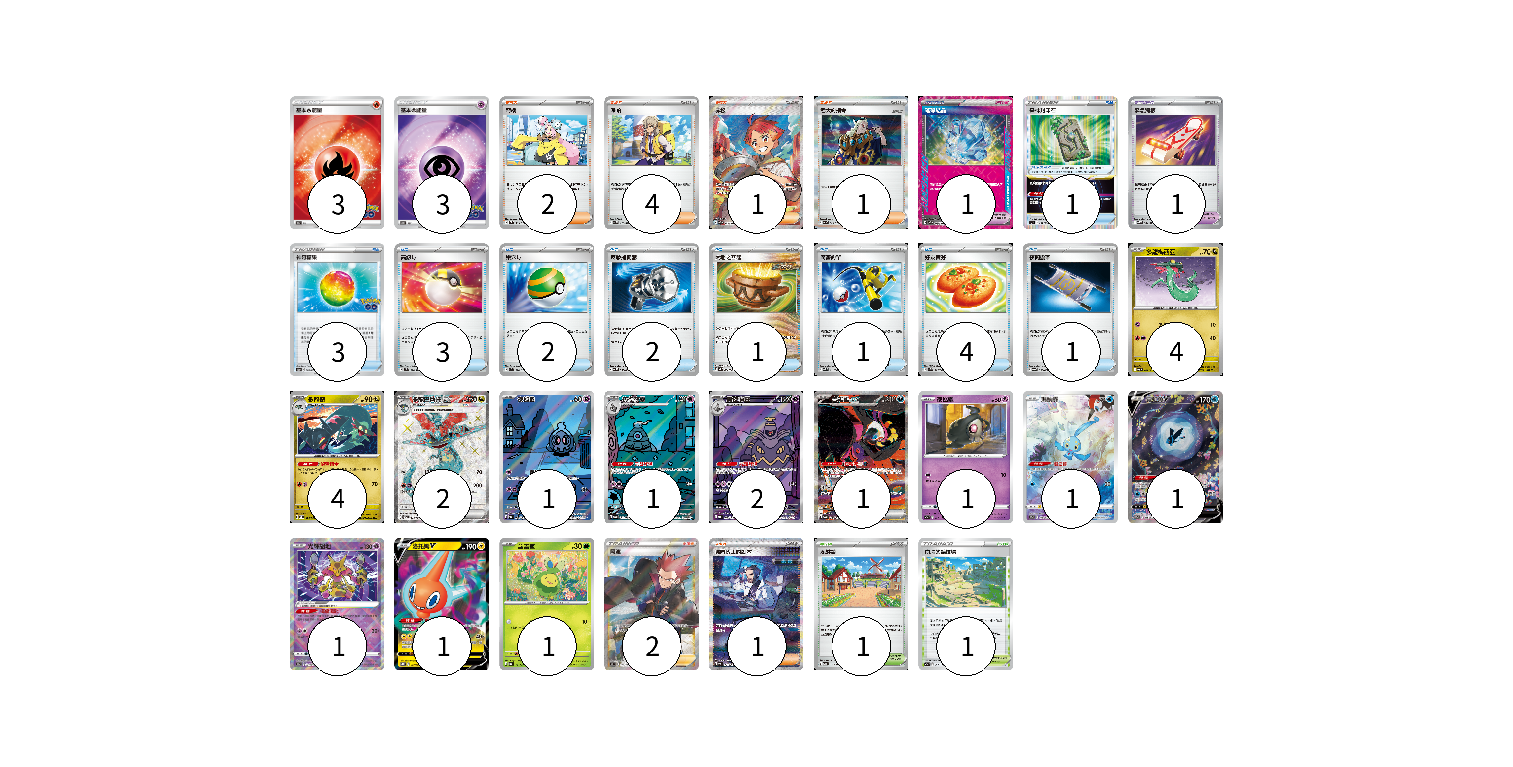 牌組構築方案 以此牌組為基礎新構築牌組 顯示卡面 顯示列表 寶可夢卡(21) 4 4 2 1 1 2 1 1 1 1 1 1 1 寶可夢道具(3) 1 1 1 物品卡(17) 3 3 2 2 1 1 4 1 支援者卡(11) 2 4 1 1 2 1 競技場卡(2) 1 1 能量卡(6) 3 3 寶可夢卡(21) 卡牌名稱 張數 卡牌名稱 張數 多龍梅西亞 SV6 079/101 04 多龍奇 SV6 080/101 04 多龍巴魯托ex SV6 120/101 02 夜巡靈 SV6a 068/064 01 彷徨夜靈 SV6a 069/064 01 黑夜魔靈 SV6a 070/064 02 吉雉雞ex SV6a 089/064 01 夜巡靈 S12a 057/172 01 瑪納霏 S12a 178/172 01 霓虹魚V S12a 216/172 01 光輝胡地 S11a 031/068 01 洛托姆V S11 037/100 01 含羞苞 SV8a 001/187 01 寶可夢道具(3) 卡牌名稱 張數 卡牌名稱 張數 璀璨結晶 SV7 094/102 01 森林封印石 S12 092/098 01 緊急滑板 SV5K 064/071 01 物品卡(17) 卡牌名稱 張數 卡牌名稱 張數 神奇糖果 S10b 066/071 03 高級球 SV1V 070/078 03 巢穴球 SV1S 070/078 02 反擊捕捉器 SV4M 059/066 02 大地之容器 SV4K 060/066 01 厲害釣竿 SVK 011/042 01 好友寶芬 SVK 015/042 04 夜間擔架 SV6a 056/064 01 支援者卡(11) 卡牌名稱 張數 卡牌名稱 張數 奇樹 SV2D 069/071 02 派帕 SV1V 076/078 04 赤松 SV7 123/102 01 老大的指令 SV1a 069/073 01 阿渡 S12 114/098 02 弗圖博士的劇本 SV4M 091/066 01 競技場卡(2) 卡牌名稱 張數 卡牌名稱 張數 深缽鎮 SV4a 185/190 01 崩塌的競技場 S12a 167/172 01 能量卡(6) 卡牌名稱 張數 卡牌名稱 張數 基本火能量 S10b FIR 03 基本超能量 S10b PSY 03 以此牌組為基礎新構築牌組 牌組編碼 RcxGPO-ytwBQw-NQUiOj copy 列印牌組單 牌組編碼已複製 分享至SNS
