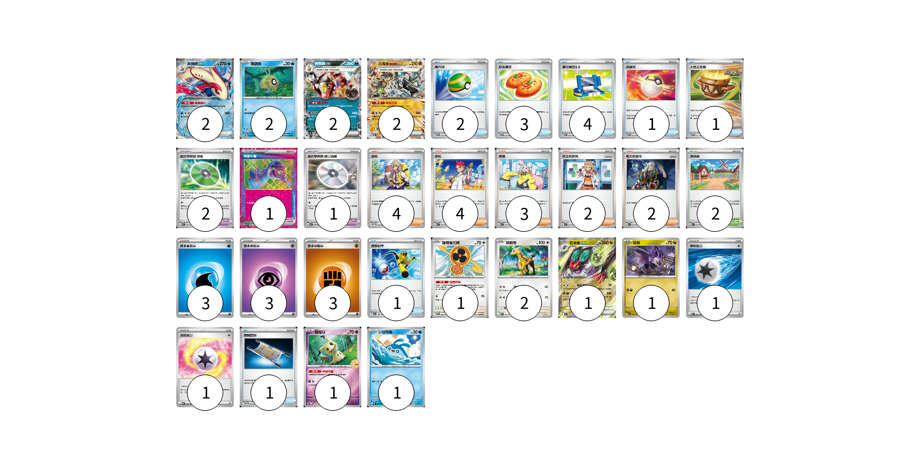 牌組構築方案 以此牌組為基礎新構築牌組 顯示卡面 顯示列表 寶可夢卡(15) 2 2 2 2 1 2 1 1 1 1 寶可夢道具(4) 2 1 1 物品卡(13) 2 3 4 1 1 1 1 支援者卡(15) 4 4 3 2 2 競技場卡(2) 2 能量卡(11) 3 3 3 1 1 寶可夢卡(15) 卡牌名稱 張數 卡牌名稱 張數 美納斯ex SV8 026/106 02 醜醜魚 SV8 025/106 02 奇麒麟ex SV5M 042/071 02 厄鬼椪 礎石面具ex SV8a 091/187 02 旋轉洛托姆 SV7 080/102 01 麒麟奇 SV2D 059/071 02 音波龍ex SV4a 135/190 01 嗡蝠 SV4a 134/190 01 謎擬Q SV-P 170/SV-P 01 小球飛魚 SV3a 007/062 01 寶可夢道具(4) 卡牌名稱 張數 卡牌名稱 張數 招式學習器 演進 SVK 025/042 02 英雄斗篷 SV5M 064/071 01 招式學習器 能量渦輪 SV3a 056/062 01 物品卡(13) 卡牌名稱 張數 卡牌名稱 張數 巢穴球 SVTS 013/022 02 好友寶芬 SVTS 012/022 03 寶可裝置3.0 SVTL 014/021 04 高級球 SVTS 014/022 01 大地之容器 SVTS 011/022 01 厲害釣竿 SV4a 158/190 01 夜間擔架 SVOM 016/021 01 支援者卡(15) 卡牌名稱 張數 卡牌名稱 張數 派帕 SVOD 018/020 04 赤松 SVK 027/042 04 奇樹 SVK 031/042 03 博士的研究 SVK 032/042 02 老大的指令 SVK 036/042 02 競技場卡(2) 卡牌名稱 張數 卡牌名稱 張數 深缽鎮 SVK 039/042 02 能量卡(11) 卡牌名稱 張數 卡牌名稱 張數 基本【水】能量 SVF WAT 03 基本【超】能量 SVF PSY 03 基本【鬥】能量 SVF FIG 03 噴射能量 SV8a 185/187 01 薄霧能量 SV8a 186/187 01 以此牌組為基礎新構築牌組 牌組編碼 RdejVa-rVuIMO-tCwAco copy 列印牌組單 牌組編碼已複製 分享至SNS
