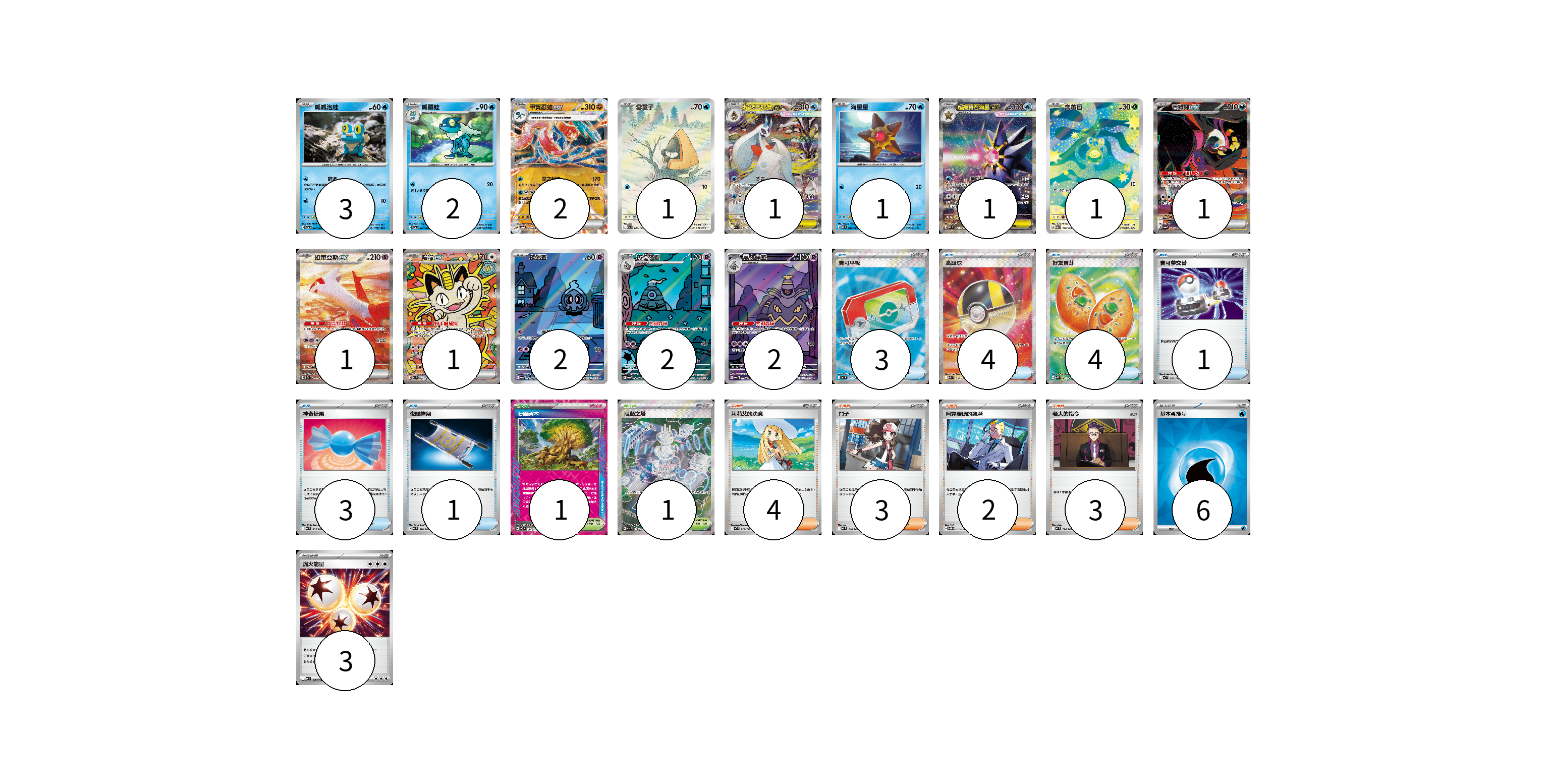牌組構築方案 以此牌組為基礎新構築牌組 顯示卡面 顯示列表 寶可夢卡(21) 3 2 2 1 1 1 1 1 1 1 1 2 2 2 物品卡(16) 3 4 4 1 3 1 支援者卡(12) 4 3 2 3 競技場卡(2) 1 1 能量卡(9) 6 3 寶可夢卡(21) 卡牌名稱 張數 卡牌名稱 張數 呱呱泡蛙 SV5a 023/066 03 呱頭蛙 SV5a 024/066 02 甲賀忍蛙ex SV5a 045/066 02 雪童子 M2a 200/193 01 超級雪妖女ex M2a 233/193 01 海星星 M3 020/080 01 超級寶石海星ex M3 111/080 01 含羞苞 M2a 196/193 01 吉雉雞ex SV6a 089/064 01 拉帝亞斯ex SV7a 087/064 01 喵喵ex M3 114/080 01 夜巡靈 SV6a 068/064 02 彷徨夜靈 SV6a 069/064 02 黑夜魔靈 SV6a 070/064 02 物品卡(16) 卡牌名稱 張數 卡牌名稱 張數 寶可平板 M3 103/080 03 高級球 M2a 216/193 04 好友寶芬 M1S 081/063 04 寶可夢交替 MC 663/742 01 神奇糖果 MC 655/742 03 夜間擔架 MC 670/742 01 支援者卡(12) 卡牌名稱 張數 卡牌名稱 張數 莉莉艾的決意 MC 729/742 04 鬥子 MC 718/742 03 阿克羅瑪的執著 SVOM 017/021 02 老大的指令 MC 724/742 03 競技場卡(2) 卡牌名稱 張數 卡牌名稱 張數 壯偉碩木 SV7 101/102 01 阻礙之塔 M2a 222/193 01 能量卡(9) 卡牌名稱 張數 卡牌名稱 張數 基本【水】能量 SVM WAT 06 燃火能量 MC 736/742 03 以此牌組為基礎新構築牌組 牌組編碼 RjXLBN-mkaImT-GhxQSJ copy 列印牌組單 牌組編碼已複製 分享至SNS
