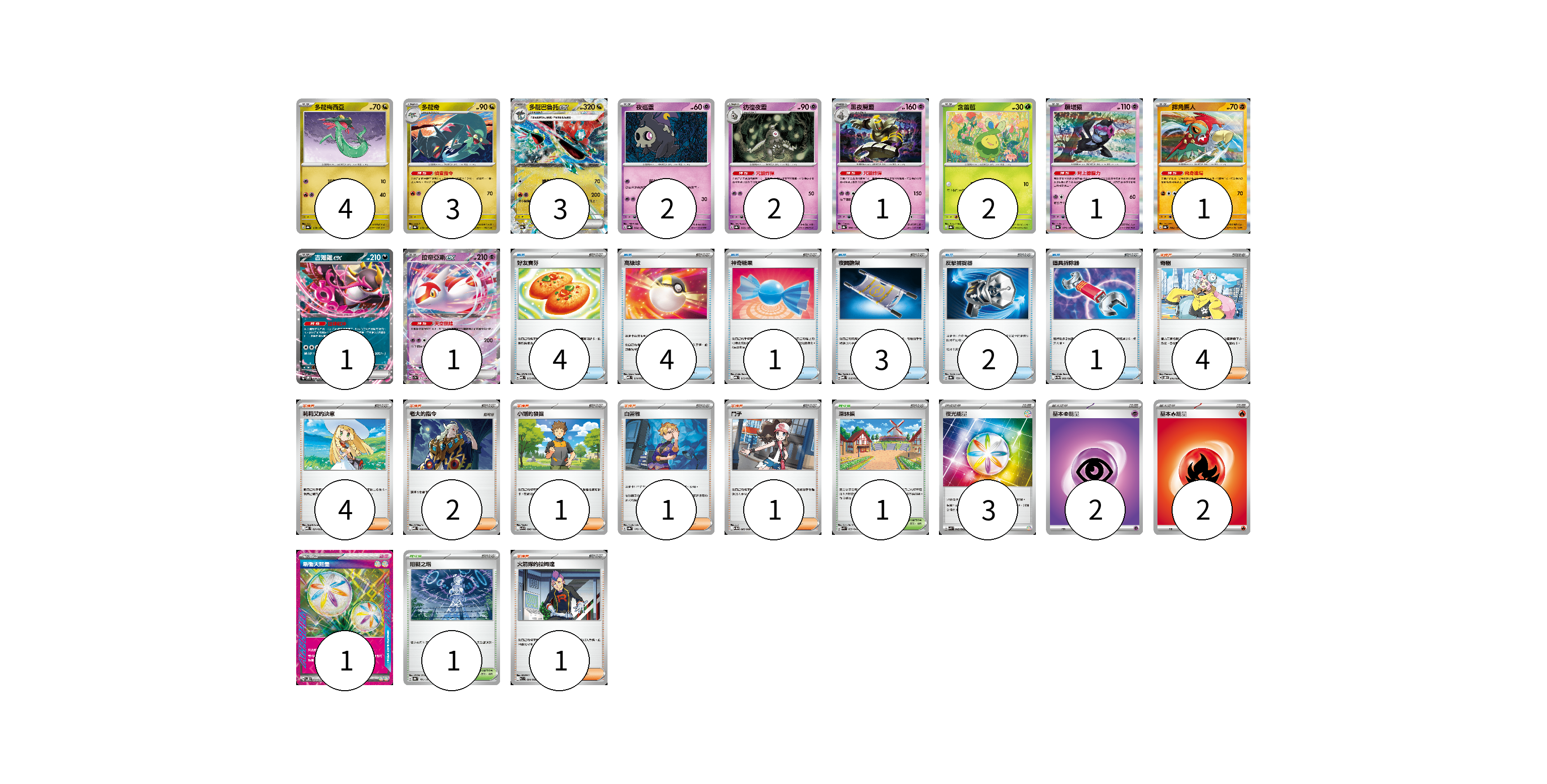 牌組構築方案 以此牌組為基礎新構築牌組 顯示卡面 顯示列表 寶可夢卡(21) 4 3 3 2 2 1 2 1 1 1 1 物品卡(15) 4 4 1 3 2 1 支援者卡(14) 4 4 2 1 1 1 1 競技場卡(2) 1 1 能量卡(8) 3 2 2 1 寶可夢卡(21) 卡牌名稱 張數 卡牌名稱 張數 多龍梅西亞 SV8a 118/187 04 多龍奇 SV8a 119/187 03 多龍巴魯托ex SV8a 120/187 03 夜巡靈 SV8a 064/187 02 彷徨夜靈 SV8a 065/187 02 黑夜魔靈 SV8a 066/187 01 含羞苞 SV8a 001/187 02 願增猿 SV8a 075/187 01 摔角鷹人 SV8a 084/187 01 吉雉雞ex SVOM 009/021 01 拉帝亞斯ex SV7a 019/064 01 物品卡(15) 卡牌名稱 張數 卡牌名稱 張數 好友寶芬 MBD 013/022 04 高級球 MBD 014/022 04 神奇糖果 MBG 013/022 01 夜間擔架 MBD 016/022 03 反擊捕捉器 SV8a 139/187 02 道具拆除器 SV11W 080/086 01 支援者卡(14) 卡牌名稱 張數 卡牌名稱 張數 奇樹 SVOD 016/020 04 莉莉艾的決意 MBD 021/022 04 老大的指令 MBD 020/022 02 小剛的發掘 SV9 096/100 01 白蕾雅 SV8a 176/187 01 鬥子 SV11W 085/086 01 火箭隊的拉姆達 SV10 094/098 01 競技場卡(2) 卡牌名稱 張數 卡牌名稱 張數 深缽鎮 SVK 039/042 01 阻礙之塔 SV8a 181/187 01 能量卡(8) 卡牌名稱 張數 卡牌名稱 張數 夜光能量 SVK 042/042 03 基本【超】能量 SVTS PSY 02 基本【火】能量 SVHK FIR 02 新衝天能量 SV5K 071/071 01 以此牌組為基礎新構築牌組 牌組編碼 RkwjFN-JOzbcn-ZzKMFm copy 列印牌組單 牌組編碼已複製 分享至SNS