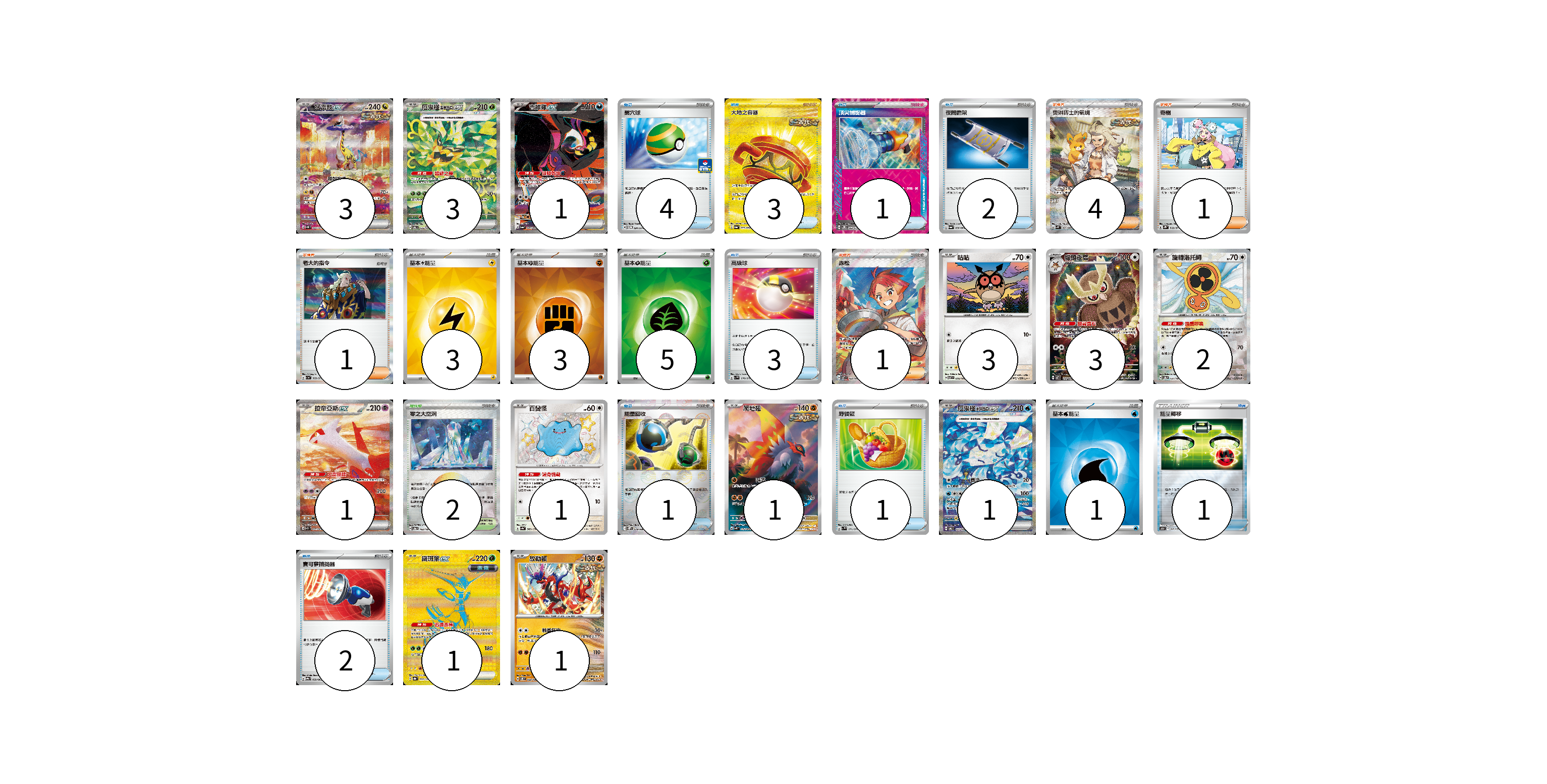 牌組構築方案 以此牌組為基礎新構築牌組 顯示卡面 顯示列表 寶可夢卡(21) 3 3 1 3 3 2 1 1 1 1 1 1 物品卡(18) 4 3 1 2 3 1 1 1 2 支援者卡(7) 4 1 1 1 競技場卡(2) 2 能量卡(12) 3 3 5 1 寶可夢卡(21) 卡牌名稱 張數 卡牌名稱 張數 猛雷鼓ex SV5K 095/071 03 厄鬼椪 碧草面具ex SV6 125/101 03 吉雉雞ex SV6a 089/064 01 咕咕 SV7 076/102 03 貓頭夜鷹 SV7 114/102 03 旋轉洛托姆 SV8a 131/187 02 拉帝亞斯ex SV7a 087/064 01 百變怪 SV4a 309/190 01 爬地翅 SV4K 074/066 01 厄鬼椪 水井面具ex SV6 127/101 01 鐵斑葉ex SV8a 233/187 01 故勒頓 SV8 069/106 01 物品卡(18) 卡牌名稱 張數 卡牌名稱 張數 巢穴球 SV-P 091/SV-P 04 大地之容器 SV6a 093/064 03 頂尖捕捉器 SV5M 062/071 01 夜間擔架 SV6a 056/064 02 高級球 SV1V 070/078 03 能量回收 SV11W 079/086 01 野餐籃 SV1V 071/078 01 能量轉移 SO 017/030 01 寶可夢捕捉器 SV9a 059/063 02 支援者卡(7) 卡牌名稱 張數 卡牌名稱 張數 奧琳博士的氣魄 SV4K 091/066 04 奇樹 SV2D 069/071 01 老大的指令 SV1a 069/073 01 赤松 SV7 123/102 01 競技場卡(2) 卡牌名稱 張數 卡牌名稱 張數 零之大空洞 SV8a 182/187 02 能量卡(12) 卡牌名稱 張數 卡牌名稱 張數 基本【雷】能量 SVK LIG 03 基本【鬥】能量 SVK FIG 03 基本【草】能量 SVK GRA 05 基本【水】能量 SVM WAT 01 以此牌組為基礎新構築牌組 牌組編碼 RmsKMQ-QFpdfs-vydqry copy 列印牌組單 牌組編碼已複製 分享至SNS