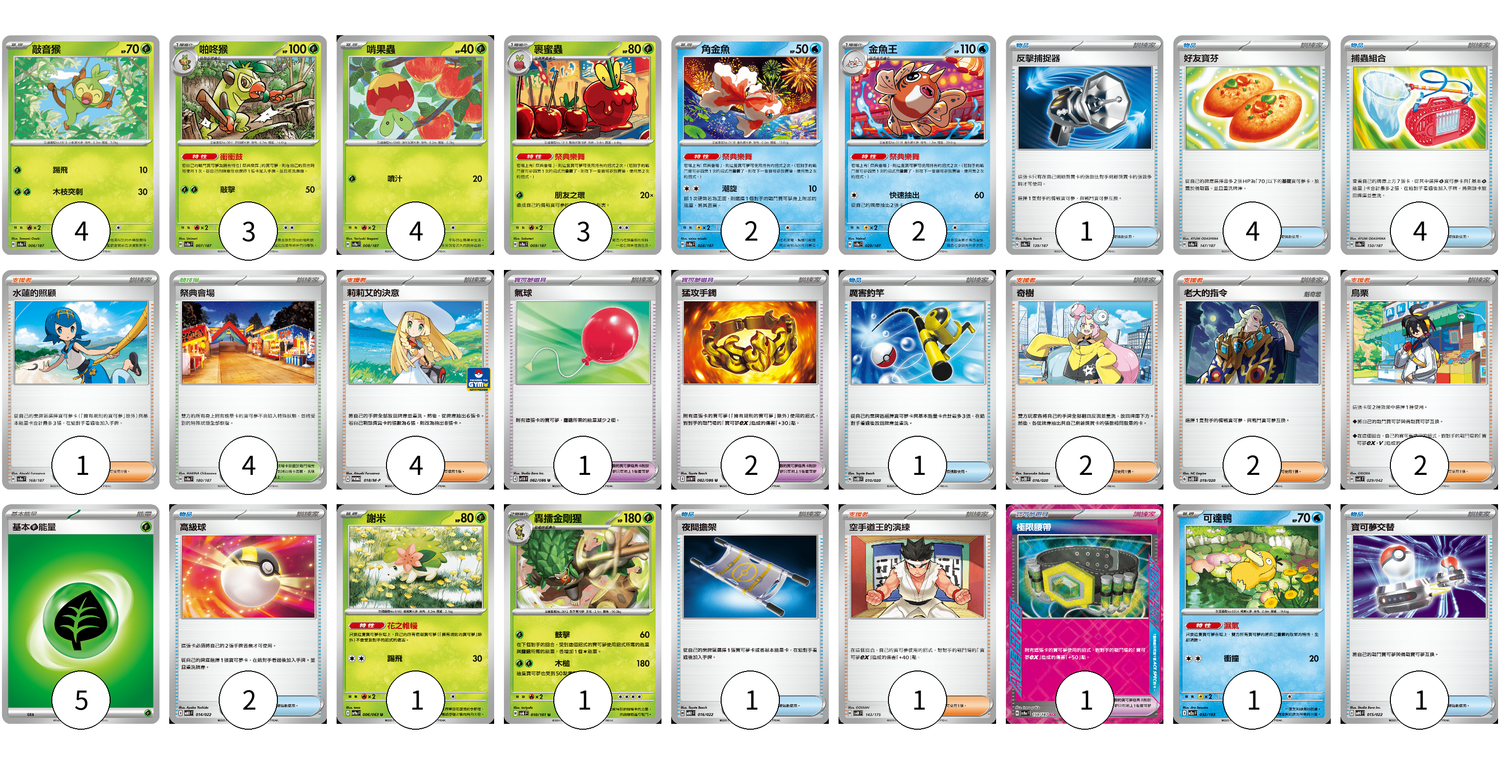 牌組構築方案 以此牌組為基礎新構築牌組 顯示卡面 顯示列表 寶可夢卡(21) 4 3 4 3 2 2 1 1 1 寶可夢道具(4) 1 2 1 物品卡(14) 1 4 4 1 2 1 1 支援者卡(12) 1 4 2 2 2 1 競技場卡(4) 4 能量卡(5) 5 寶可夢卡(21) 卡牌名稱 張數 卡牌名稱 張數 敲音猴 SV8a 006/187 04 啪咚猴 SV8a 007/187 03 啃果蟲 SV8a 008/187 04 裹蜜蟲 SV8a 009/187 03 角金魚 SV8a 028/187 02 金魚王 SV8a 029/187 02 謝米 SV9a 006/063 01 轟擂金剛猩 SV6 010/101 01 可達鴨 M2a 032/193 01 寶可夢道具(4) 卡牌名稱 張數 卡牌名稱 張數 氣球 SV11B 082/086 01 猛攻手鐲 SV11W 082/086 02 極限腰帶 SV8a 159/187 01 物品卡(14) 卡牌名稱 張數 卡牌名稱 張數 反擊捕捉器 SV8a 139/187 01 好友寶芬 SV8a 147/187 04 捕蟲組合 SV8a 150/187 04 厲害釣竿 SVOD 010/020 01 高級球 MBD 014/022 02 夜間擔架 MBD 016/022 01 寶可夢交替 MBG 015/022 01 支援者卡(12) 卡牌名稱 張數 卡牌名稱 張數 水蓮的照顧 SV8a 168/187 01 莉莉艾的決意 M-P 018/M-P 04 奇樹 SVOD 016/020 02 老大的指令 SVOD 019/020 02 烏栗 SVK 029/042 02 空手道王的演練 SVM 143/175 01 競技場卡(4) 卡牌名稱 張數 卡牌名稱 張數 祭典會場 SV8a 180/187 04 能量卡(5) 卡牌名稱 張數 卡牌名稱 張數 基本【草】能量 SVF GRA 05 以此牌組為基礎新構築牌組 牌組編碼 RmvtmS-QprLhS-dMdNFZ copy 列印牌組單 牌組編碼已複製 分享至SNS