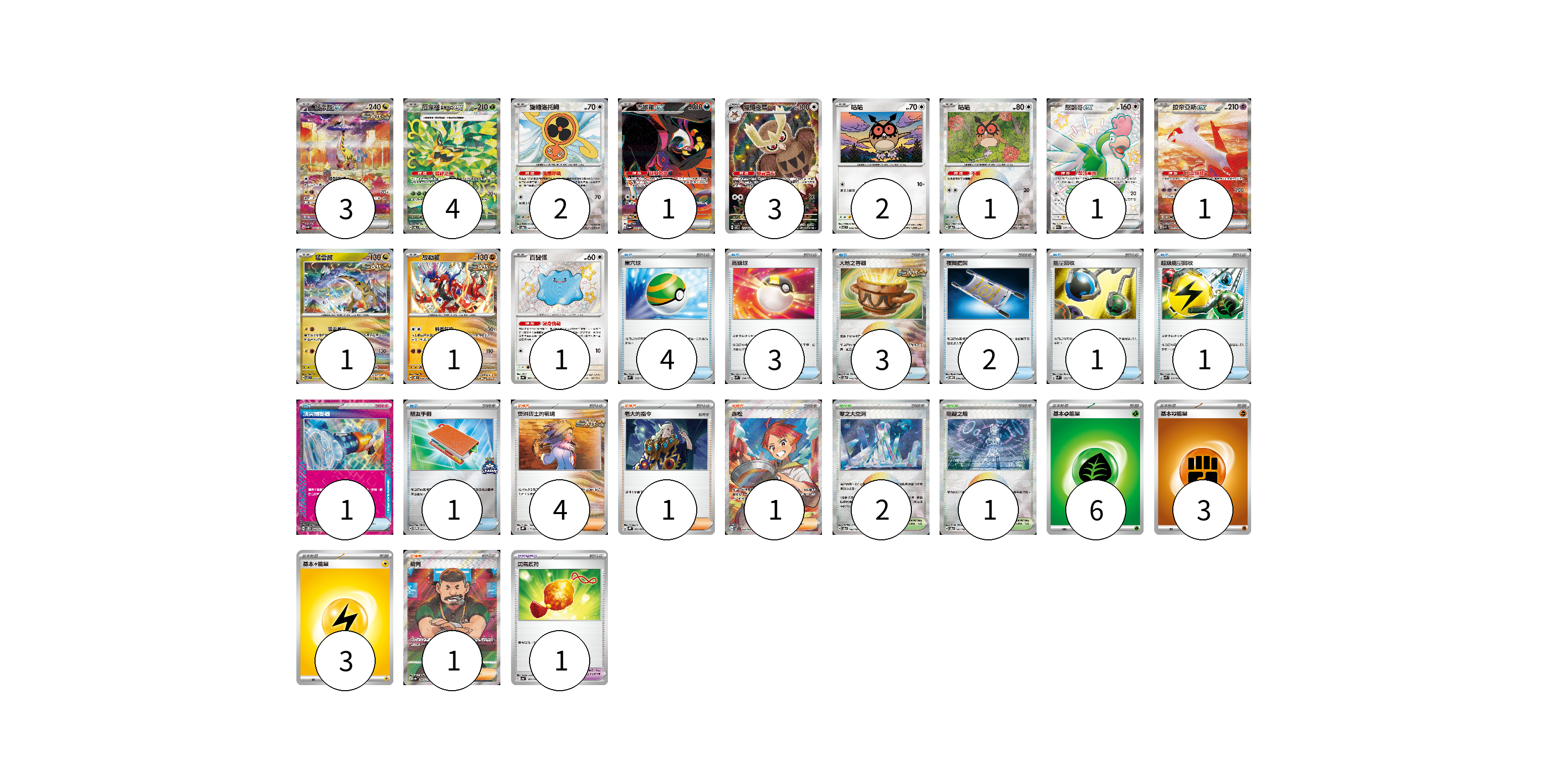 牌組構築方案 以此牌組為基礎新構築牌組 顯示卡面 顯示列表 寶可夢卡(21) 3 4 2 1 3 2 1 1 1 1 1 1 寶可夢道具(1) 1 物品卡(16) 4 3 3 2 1 1 1 1 支援者卡(7) 4 1 1 1 競技場卡(3) 2 1 能量卡(12) 6 3 3 寶可夢卡(21) 卡牌名稱 張數 卡牌名稱 張數 猛雷鼓ex SV5K 095/071 03 厄鬼椪 碧草面具ex SV6 125/101 04 旋轉洛托姆 SV8a 131/187 02 吉雉雞ex SV6a 089/064 01 貓頭夜鷹 SV7 114/102 03 咕咕 SV7 076/102 02 咕咕 SV8a 127/187 01 怒鸚哥ex SV4a 337/190 01 拉帝亞斯ex SV7a 087/064 01 猛雷鼓 SV7 075/102 01 故勒頓 SV8 069/106 01 百變怪 SV4a 309/190 01 寶可夢道具(1) 卡牌名稱 張數 卡牌名稱 張數 勇氣護符 SV4a 169/190 01 物品卡(16) 卡牌名稱 張數 卡牌名稱 張數 巢穴球 SVM 133/175 04 高級球 SVM 134/175 03 大地之容器 SV8a 143/187 03 夜間擔架 SVOM 016/021 02 能量回收 SVM 125/175 01 超級能量回收 SVK 010/042 01 頂尖捕捉器 SV5M 062/071 01 朋友手冊 SV-P 182/SV-P 01 支援者卡(7) 卡牌名稱 張數 卡牌名稱 張數 奧琳博士的氣魄 SVHK 017/022 04 老大的指令 SVHK 022/022 01 赤松 SV7 123/102 01 裁判 SV4a 342/190 01 競技場卡(3) 卡牌名稱 張數 卡牌名稱 張數 零之大空洞 SV8a 182/187 02 阻礙之塔 SV8a 181/187 01 能量卡(12) 卡牌名稱 張數 卡牌名稱 張數 基本【草】能量 SVAM GRA 06 基本【鬥】能量 SVAM FIG 03 基本【雷】能量 SVAL LIG 03 以此牌組為基礎新構築牌組 牌組編碼 RskfVA-gscqJt-OFHFmo copy 列印牌組單 牌組編碼已複製 分享至SNS
