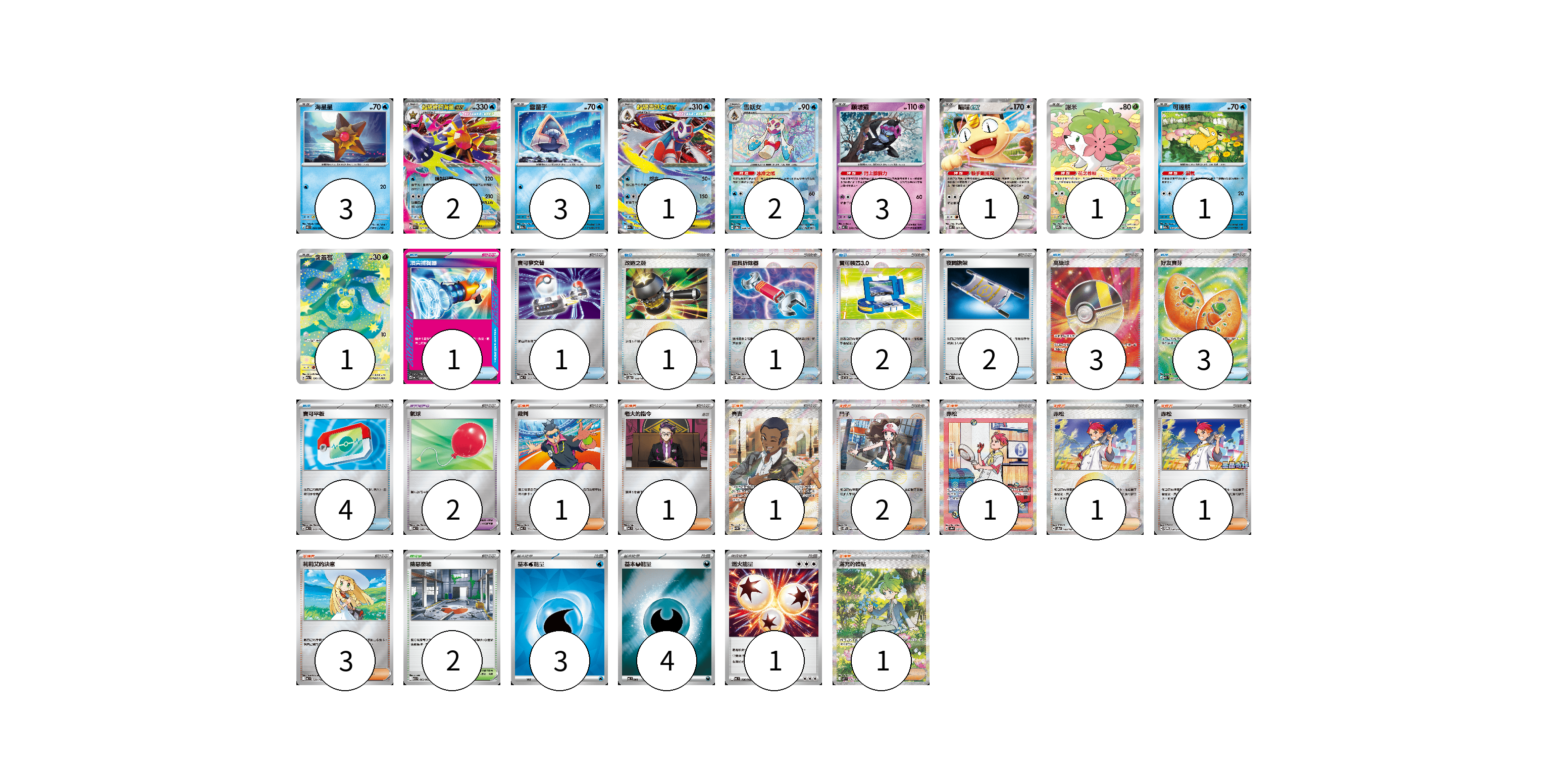 牌組構築方案 以此牌組為基礎新構築牌組 顯示卡面 顯示列表 寶可夢卡(18) 3 2 3 1 2 3 1 1 1 1 寶可夢道具(2) 2 物品卡(18) 1 1 1 1 2 2 3 3 4 支援者卡(12) 1 1 1 2 1 1 1 3 1 競技場卡(2) 2 能量卡(8) 3 4 1 寶可夢卡(18) 卡牌名稱 張數 卡牌名稱 張數 海星星 M3 020/080 03 超級寶石海星ex M3 021/080 02 雪童子 M2a 035/193 03 超級雪妖女ex M2a 036/193 01 雪妖女 SV8a 038/187 02 願增猿 MC 358/742 03 喵喵ex M3 061/080 01 謝米 SV9a 066/063 01 可達鴨 M2a 032/193 01 含羞苞 M2a 196/193 01 寶可夢道具(2) 卡牌名稱 張數 卡牌名稱 張數 氣球 MC 688/742 02 物品卡(18) 卡牌名稱 張數 卡牌名稱 張數 頂尖捕捉器 MC 656/742 01 寶可夢交替 MC 663/742 01 改造之錘 SV8a 138/187 01 道具拆除器 SV11W 080/086 01 寶可裝置3.0 SV11B 081/086 02 夜間擔架 MC 670/742 02 高級球 M2a 216/193 03 好友寶芬 M1S 081/063 03 寶可平板 MC 662/742 04 支援者卡(12) 卡牌名稱 張數 卡牌名稱 張數 裁判 MC 711/742 01 老大的指令 MC 724/742 01 賽吉 SV5M 091/071 01 鬥子 SV11W 085/086 02 赤松 SV8a 227/187 01 赤松 SV8a 163/187 01 赤松 SV-P 150/SV-P 01 莉莉艾的決意 MC 729/742 03 滿充的體貼 M1S 091/063 01 競技場卡(2) 卡牌名稱 張數 卡牌名稱 張數 險惡廢墟 M1L 063/063 02 能量卡(8) 卡牌名稱 張數 卡牌名稱 張數 基本【水】能量 SVM WAT 03 基本【惡】能量 MC DAR 04 燃火能量 MC 736/742 01 以此牌組為基礎新構築牌組 牌組編碼 RxBRYz-HvuuHq-qrDSPT copy 列印牌組單 牌組編碼已複製 分享至SNS