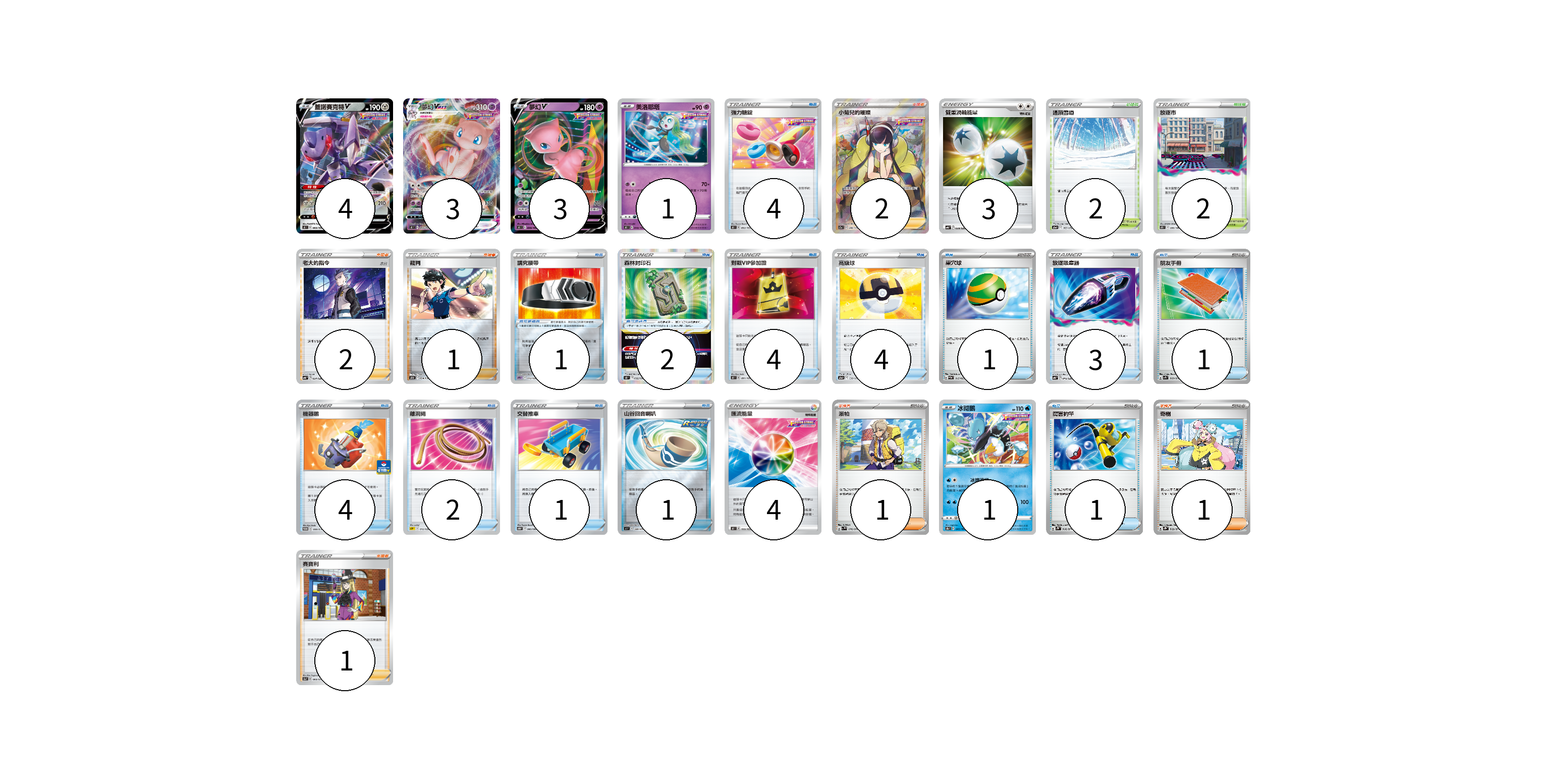 牌組構築方案 以此牌組為基礎新構築牌組 顯示卡面 顯示列表 寶可夢卡(12) 4 3 3 1 1 寶可夢道具(3) 1 2 物品卡(26) 4 4 4 1 3 1 4 2 1 1 1 支援者卡(8) 2 2 1 1 1 1 競技場卡(4) 2 2 能量卡(7) 3 4 寶可夢卡(12) 卡牌名稱 張數 卡牌名稱 張數 蓋諾賽克特V S8 069/100 04 夢幻VMAX S8 040/100 03 夢幻V S8 039/100 03 美洛耶塔 S8 048/100 01 冰砌鵝 S8b 041/184 01 寶可夢道具(3) 卡牌名稱 張數 卡牌名稱 張數 講究腰帶 SPD 012/020 01 森林封印石 S12 092/098 02 物品卡(26) 卡牌名稱 張數 卡牌名稱 張數 強力糖錠 S8 092/100 04 對戰VIP參加證 S8 091/100 04 高級球 S12a 138/172 04 巢穴球 SVAM 015/023 01 放逐吸塵器 SVB 016/028 03 朋友手冊 SV1S 069/078 01 機器鶘 S-P 099/S-P 04 離洞繩 SDP 012/022 02 交替推車 S10D 060/067 01 山谷回音喇叭 SI 380/414 01 厲害釣竿 SV2P 066/071 01 支援者卡(8) 卡牌名稱 張數 卡牌名稱 張數 小菊兒的璀璨 S12a 246/172 02 老大的指令(赤日) SVB 024/028 02 裁判 SO 024/030 01 派帕 SV1V 076/078 01 奇樹 SV2D 069/071 01 賽寶利 S5a 068/070 01 競技場卡(4) 卡牌名稱 張數 卡牌名稱 張數 通頂雪道 S12a 165/172 02 放逐市 S11 099/100 02 能量卡(7) 卡牌名稱 張數 卡牌名稱 張數 雙重渦輪能量 SVB 028/028 03 匯流能量 S8 100/100 04 以此牌組為基礎新構築牌組 牌組編碼 SBplhy-XRnAmz-oqBDSw copy 列印牌組單 牌組編碼已複製 分享至SNS