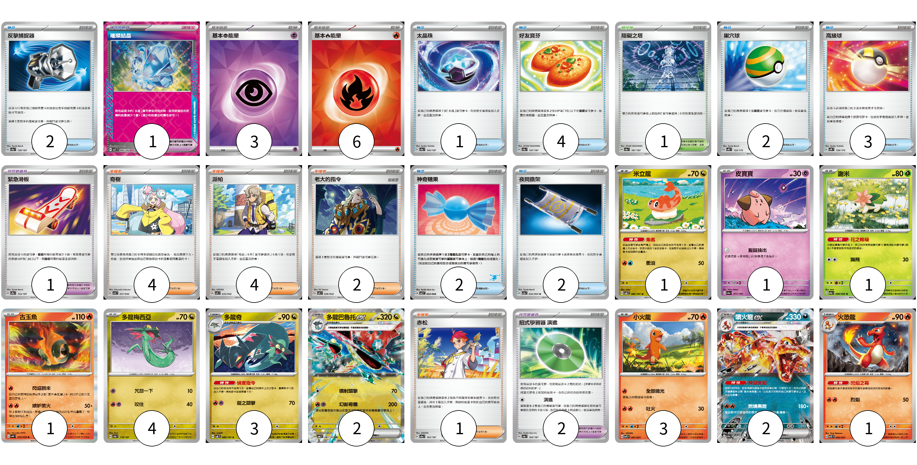 牌組構築方案 以此牌組為基礎新構築牌組 顯示卡面 顯示列表 寶可夢卡(19) 1 1 1 1 4 3 2 3 2 1 寶可夢道具(4) 1 1 2 物品卡(16) 2 1 4 2 3 2 2 支援者卡(11) 4 4 2 1 競技場卡(1) 1 能量卡(9) 3 6 寶可夢卡(19) 卡牌名稱 張數 卡牌名稱 張數 米立龍 SV6 082/101 01 皮寶寶 SV4a 077/190 01 謝米 SV9a 006/063 01 古玉魚 SV4K 016/066 01 多龍梅西亞 SV8a 118/187 04 多龍奇 SV6 080/101 03 多龍巴魯托ex SV6 081/101 02 小火龍 SVTL 001/021 03 噴火龍ex SV4a 115/190 02 火恐龍 SVTL 002/021 01 寶可夢道具(4) 卡牌名稱 張數 卡牌名稱 張數 璀璨結晶 SV7 094/102 01 緊急滑板 SV8a 153/187 01 招式學習器 演進 SV8a 160/187 02 物品卡(16) 卡牌名稱 張數 卡牌名稱 張數 反擊捕捉器 SV8a 139/187 02 太晶珠 SV8a 145/187 01 好友寶芬 SV8a 147/187 04 巢穴球 SVM 133/175 02 高級球 SVM 134/175 03 神奇糖果 SVI 053/066 02 夜間擔架 SV6a 056/064 02 支援者卡(11) 卡牌名稱 張數 卡牌名稱 張數 奇樹 SVK 031/042 04 派帕 SVK 035/042 04 老大的指令 SVK 036/042 02 赤松 SV8a 163/187 01 競技場卡(1) 卡牌名稱 張數 卡牌名稱 張數 阻礙之塔 SV8a 181/187 01 能量卡(9) 卡牌名稱 張數 卡牌名稱 張數 基本【超】能量 SVOD PSY 03 基本【火】能量 SVK FIR 06 以此牌組為基礎新構築牌組 牌組編碼 SJXOsL-yJxUwF-lkjrmm copy 列印牌組單 牌組編碼已複製 分享至SNS