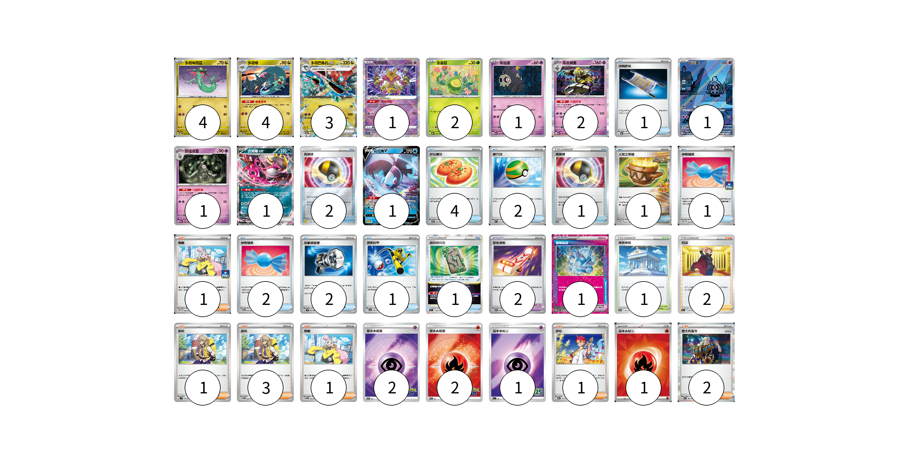 牌組構築方案 以此牌組為基礎新構築牌組 顯示卡面 顯示列表 寶可夢卡(21) 4 4 3 1 2 1 2 1 1 1 1 寶可夢道具(5) 1 2 1 1 物品卡(17) 1 2 4 2 1 1 1 2 2 1 支援者卡(10) 1 2 1 3 1 2 競技場卡(1) 1 能量卡(6) 2 2 1 1 寶可夢卡(21) 卡牌名稱 張數 卡牌名稱 張數 多龍梅西亞 SV6 079/101 04 多龍奇 SV6 080/101 04 多龍巴魯托ex SV6 081/101 03 光輝胡地 S11a 031/068 01 含羞苞 SV8a 001/187 02 夜巡靈 SV6a 018/064 01 黑夜魔靈 SV6a 020/064 02 夜巡靈 SV6a 068/064 01 彷徨夜靈 SV8a 065/187 01 吉雉雞ex SV6a 038/064 01 霓虹魚V SPZ 001/020 01 寶可夢道具(5) 卡牌名稱 張數 卡牌名稱 張數 森林封印石 S12 092/098 01 緊急滑板 SV5K 064/071 02 璀璨結晶 SV7 094/102 01 奇樹 SVTL 018/021 01 物品卡(17) 卡牌名稱 張數 卡牌名稱 張數 夜間擔架 SV6a 056/064 01 高級球 SPZ 009/020 02 好友寶芬 SV5K 063/071 04 巢穴球 SVK 016/042 02 高級球 S-P 148/S-P 01 大地之容器 SV-P 084/SV-P 01 神奇糖果 SV-P 104/SV-P 01 神奇糖果 SVTL 013/021 02 反擊捕捉器 SV4M 059/066 02 厲害釣竿 SV4a 158/190 01 支援者卡(10) 卡牌名稱 張數 卡牌名稱 張數 奇樹 SV-P 106/SV-P 01 阿渡 S12 096/098 02 派帕 SV1V 076/078 01 派帕 SVTL 020/021 03 赤松 SV8a 163/187 01 老大的指令 SV4a 181/190 02 競技場卡(1) 卡牌名稱 張數 卡牌名稱 張數 神奧神殿 S10P 067/067 01 能量卡(6) 卡牌名稱 張數 卡牌名稱 張數 基本超能量 S10b PSY 02 基本火能量 S10b FIR 02 基本超能量 S8a PSY 01 基本【火】能量 SVK FIR 01 以此牌組為基礎新構築牌組 牌組編碼 SKonYH-eddVuQ-bRWERD copy 列印牌組單 牌組編碼已複製 分享至SNS