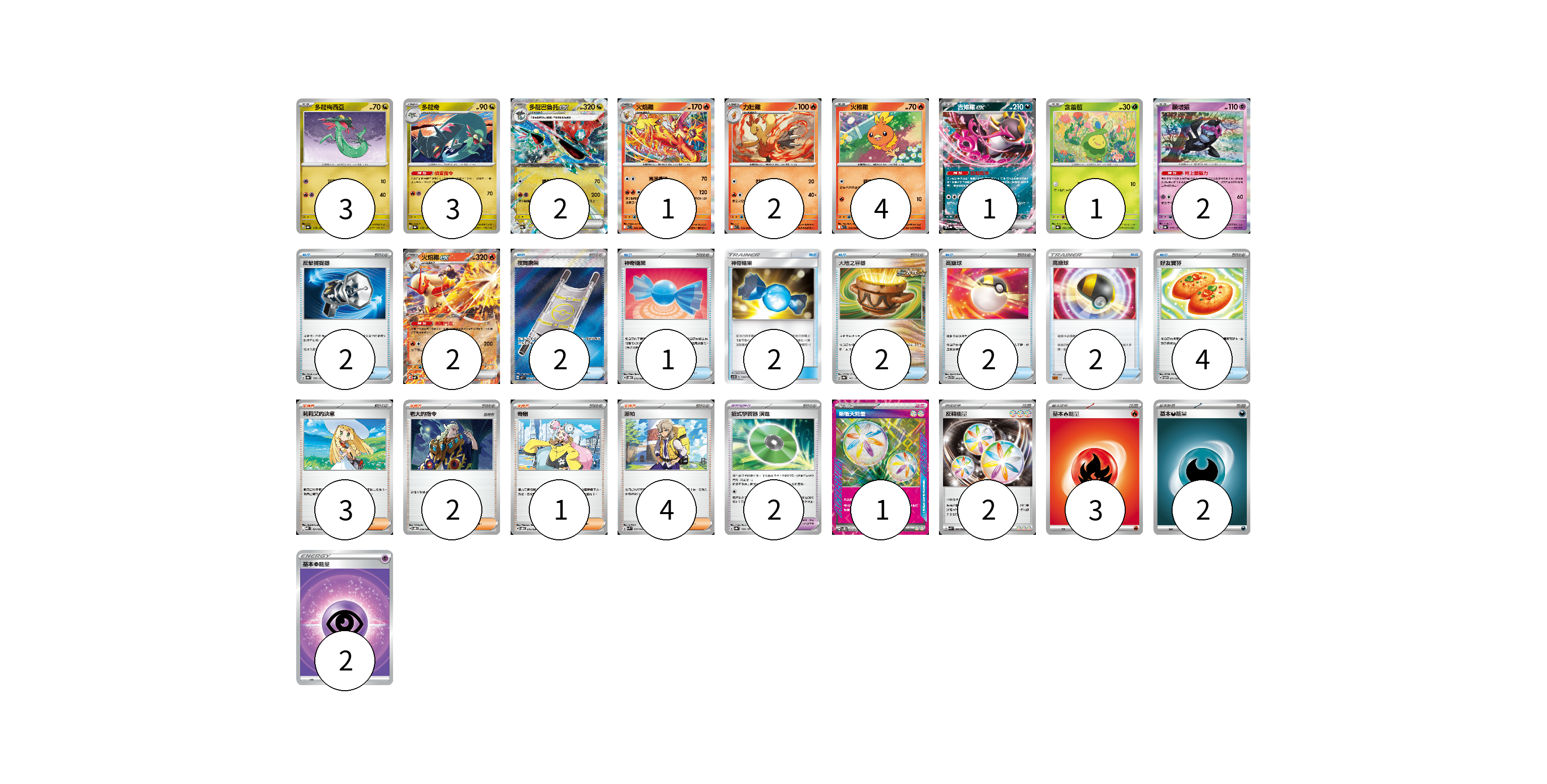 牌組構築方案 以此牌組為基礎新構築牌組 顯示卡面 顯示列表 寶可夢卡(21) 3 3 2 1 2 4 1 1 2 2 寶可夢道具(2) 2 物品卡(17) 2 2 1 2 2 2 2 4 支援者卡(10) 3 2 1 4 能量卡(10) 1 2 3 2 2 寶可夢卡(21) 卡牌名稱 張數 卡牌名稱 張數 多龍梅西亞 SV8a 118/187 03 多龍奇 SV8a 119/187 03 多龍巴魯托ex SV8a 120/187 02 火焰雞 SV10 020/098 01 力壯雞 SV10 019/098 02 火稚雞 SV10 018/098 04 吉雉雞ex SV8a 104/187 01 含羞苞 SV8a 001/187 01 願增猿 SV8a 075/187 02 火焰雞ex SVM 016/175 02 寶可夢道具(2) 卡牌名稱 張數 卡牌名稱 張數 招式學習器 演進 SV8a 160/187 02 物品卡(17) 卡牌名稱 張數 卡牌名稱 張數 反擊捕捉器 SV8a 139/187 02 夜間擔架 M1L 083/063 02 神奇糖果 SVOD 013/020 01 神奇糖果 AC1D 140/157 02 大地之容器 SV8a 143/187 02 高級球 SVTG 013/019 02 高級球 SLL 013/021 02 好友寶芬 SVTM 011/022 04 支援者卡(10) 卡牌名稱 張數 卡牌名稱 張數 莉莉艾的決意 MBD 021/022 03 老大的指令 SVOD 019/020 02 奇樹 SVOD 016/020 01 派帕 SVK 035/042 04 能量卡(10) 卡牌名稱 張數 卡牌名稱 張數 新衝天能量 SV5K 071/071 01 反轉能量 SVK 041/042 02 基本【火】能量 SVTL FIR 03 基本【惡】能量 SVF DAR 02 基本【超】能量 SI PSY 02 以此牌組為基礎新構築牌組 牌組編碼 SKwXyr-KbwFUT-lyKJiQ copy 列印牌組單 牌組編碼已複製 分享至SNS