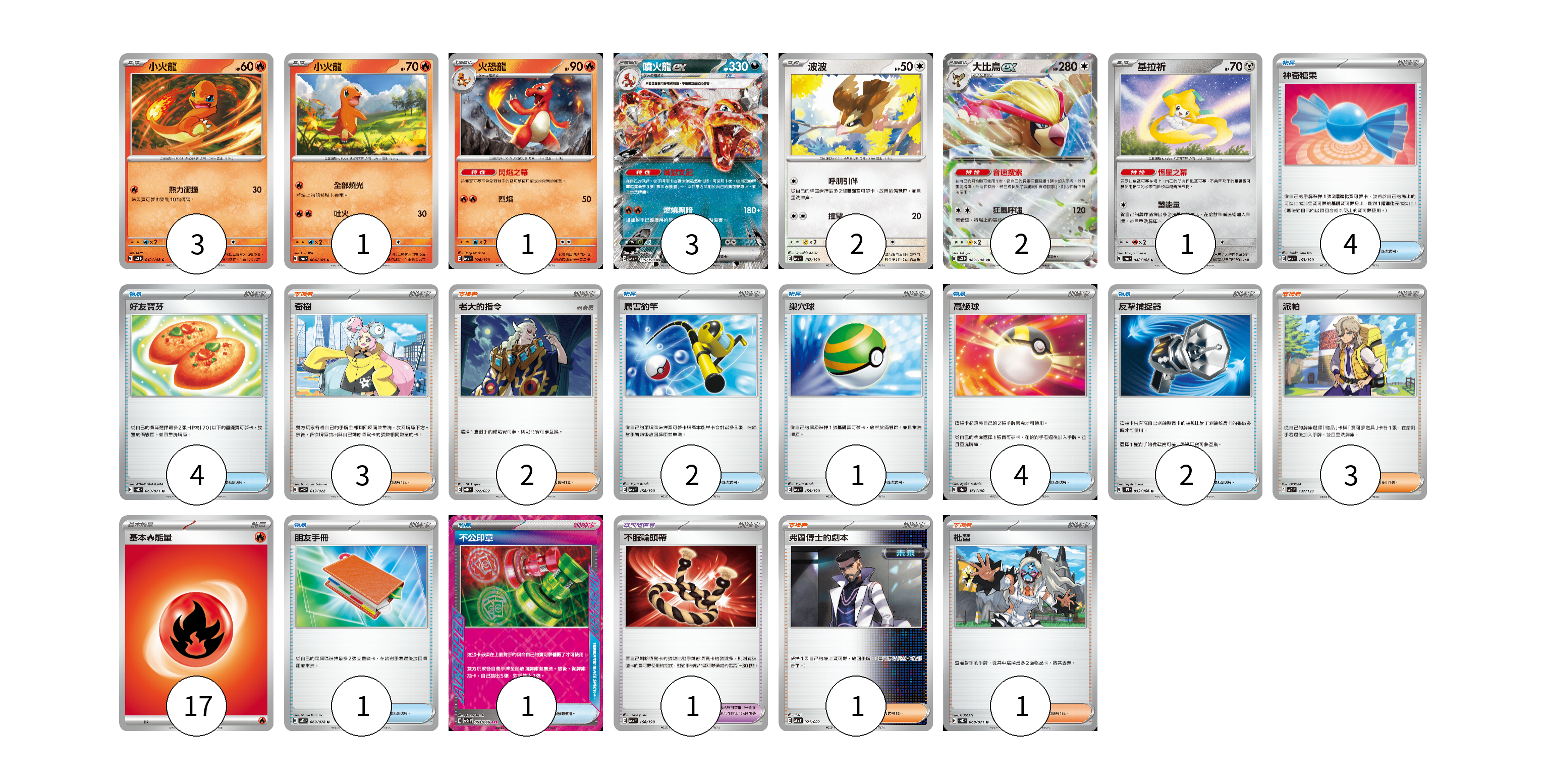 牌組構築方案 以此牌組為基礎新構築牌組 顯示卡面 顯示列表 寶可夢卡(13) 3 1 1 3 2 2 1 寶可夢道具(1) 1 物品卡(19) 4 4 2 1 4 2 1 1 支援者卡(10) 3 2 3 1 1 能量卡(17) 17 寶可夢卡(13) 卡牌名稱 張數 卡牌名稱 張數 小火龍 SV3 012/108 03 小火龍 SV2a 004/165 01 火恐龍 SV4a 026/190 01 噴火龍ex SV4a 115/190 03 波波 SV4a 137/190 02 大比鳥ex SV3 089/108 02 基拉祈 SV3a 042/062 01 寶可夢道具(1) 卡牌名稱 張數 卡牌名稱 張數 不服輸頭帶 SV4a 168/190 01 物品卡(19) 卡牌名稱 張數 卡牌名稱 張數 神奇糖果 SV4a 163/190 04 好友寶芬 SV5K 063/071 04 厲害釣竿 SV4a 158/190 02 巢穴球 SV4a 159/190 01 高級球 SV4a 161/190 04 反擊捕捉器 SV4M 059/066 02 朋友手冊 SV1S 069/078 01 不公印章 SV5a 053/066 01 支援者卡(10) 卡牌名稱 張數 卡牌名稱 張數 奇樹 SVHK 019/022 03 老大的指令 SVHK 022/022 02 派帕 SVD 137/139 03 弗圖博士的劇本 SVHM 021/022 01 枇琶 SV5K 068/071 01 能量卡(17) 卡牌名稱 張數 卡牌名稱 張數 基本【火】能量 SVEL FIR 17 以此牌組為基礎新構築牌組 牌組編碼 SMvmqW-tjZyVJ-dEvYrl copy 列印牌組單 牌組編碼已複製 分享至SNS