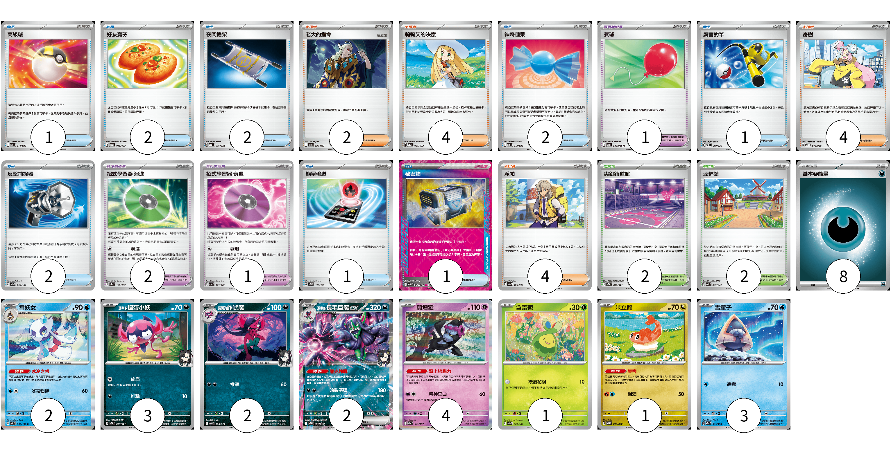 牌組構築方案 以此牌組為基礎新構築牌組 顯示卡面 顯示列表 寶可夢卡(18) 2 3 2 2 4 1 1 3 寶可夢道具(4) 1 2 1 物品卡(12) 1 2 2 2 1 2 1 1 支援者卡(14) 2 4 4 4 競技場卡(4) 2 2 能量卡(8) 8 寶可夢卡(18) 卡牌名稱 張數 卡牌名稱 張數 雪妖女 SV6 033/101 02 <瑪俐的>搗蛋小妖 SVOM 005/021 03 <瑪俐的>詐唬魔 SVOM 006/021 02 <瑪俐的>長毛巨魔ex SVOM 007/021 02 願增猿 SV8a 075/187 04 含羞苞 SV8a 001/187 01 米立龍 MBD 010/022 01 雪童子 M2a 035/193 03 寶可夢道具(4) 卡牌名稱 張數 卡牌名稱 張數 氣球 SV11B 082/086 01 招式學習器 演進 SV8a 160/187 02 招式學習器 衰退 SV8a 161/187 01 物品卡(12) 卡牌名稱 張數 卡牌名稱 張數 高級球 MBD 014/022 01 好友寶芬 MBD 013/022 02 夜間擔架 MBD 016/022 02 神奇糖果 MBG 013/022 02 厲害釣竿 SVOD 010/020 01 反擊捕捉器 SV8a 139/187 02 能量輸送 SVM 128/175 01 秘密箱 SV6 092/101 01 支援者卡(14) 卡牌名稱 張數 卡牌名稱 張數 老大的指令 MBD 020/022 02 莉莉艾的決意 MBD 021/022 04 奇樹 SVOD 016/020 04 派帕 SV4a 180/190 04 競技場卡(4) 卡牌名稱 張數 卡牌名稱 張數 尖釘鎮道館 SVOM 021/021 02 深缽鎮 SVK 039/042 02 能量卡(8) 卡牌名稱 張數 卡牌名稱 張數 基本【惡】能量 MBG DAR 08 以此牌組為基礎新構築牌組 牌組編碼 STBCcn-pTlDqj-UmNmnA copy 列印牌組單 牌組編碼已複製 分享至SNS