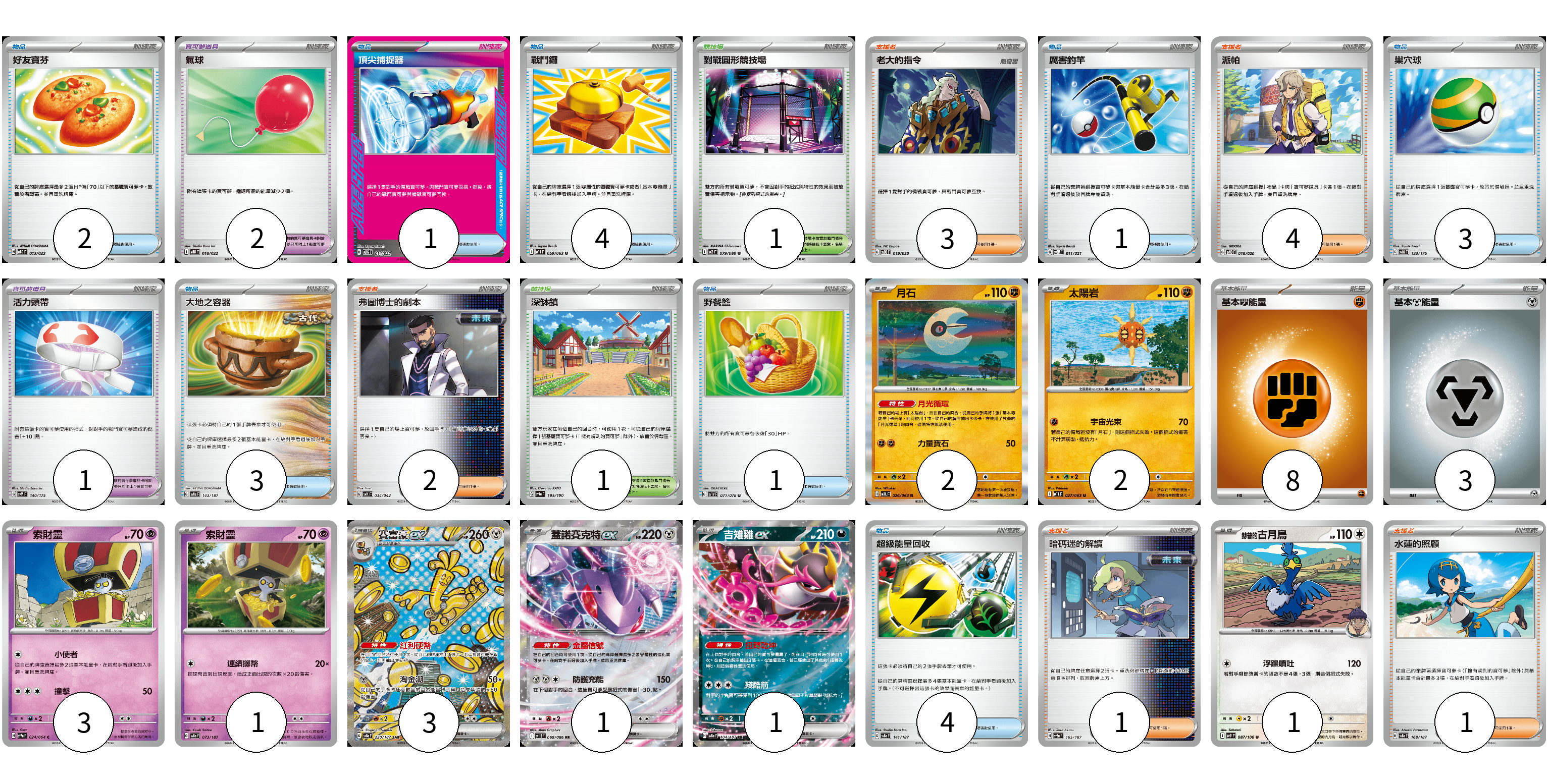 牌組構築方案 以此牌組為基礎新構築牌組 顯示卡面 顯示列表 寶可夢卡(14) 2 2 3 1 3 1 1 1 寶可夢道具(1) 1 物品卡(21) 2 2 1 4 1 3 3 1 4 支援者卡(11) 3 4 2 1 1 競技場卡(2) 1 1 能量卡(11) 8 3 寶可夢卡(14) 卡牌名稱 張數 卡牌名稱 張數 月石 M1L 026/063 02 太陽岩 M1L 027/063 02 索財靈 SV7a 024/064 03 索財靈 SV8a 073/187 01 賽富豪ex SV8a 220/187 03 蓋諾賽克特ex SV11B 069/086 01 吉雉雞ex SV8a 104/187 01 赫普的古月鳥 SV9 087/100 01 寶可夢道具(1) 卡牌名稱 張數 卡牌名稱 張數 活力頭帶 SVM 140/175 01 物品卡(21) 卡牌名稱 張數 卡牌名稱 張數 好友寶芬 MBD 013/022 02 氣球 MBD 018/022 02 頂尖捕捉器 MBG 014/022 01 戰鬥鑼 M1L 059/063 04 厲害釣竿 SVOM 011/021 01 巢穴球 SVM 133/175 03 大地之容器 SV8a 143/187 03 野餐籃 SV1V 071/078 01 超級能量回收 SV8a 141/187 04 支援者卡(11) 卡牌名稱 張數 卡牌名稱 張數 老大的指令 SVOD 019/020 03 派帕 SVOD 018/020 04 弗圖博士的劇本 SVK 034/042 02 暗碼迷的解讀 SV8a 165/187 01 水蓮的照顧 SV8a 168/187 01 競技場卡(2) 卡牌名稱 張數 卡牌名稱 張數 對戰圓形競技場 M2 079/080 01 深缽鎮 SV4a 185/190 01 能量卡(11) 卡牌名稱 張數 卡牌名稱 張數 基本【鬥】能量 M-P FIG 08 基本【鋼】能量 M-P MET 03 以此牌組為基礎新構築牌組 牌組編碼 STHZvH-VCxdQp-XOLFXf copy 列印牌組單 牌組編碼已複製 分享至SNS