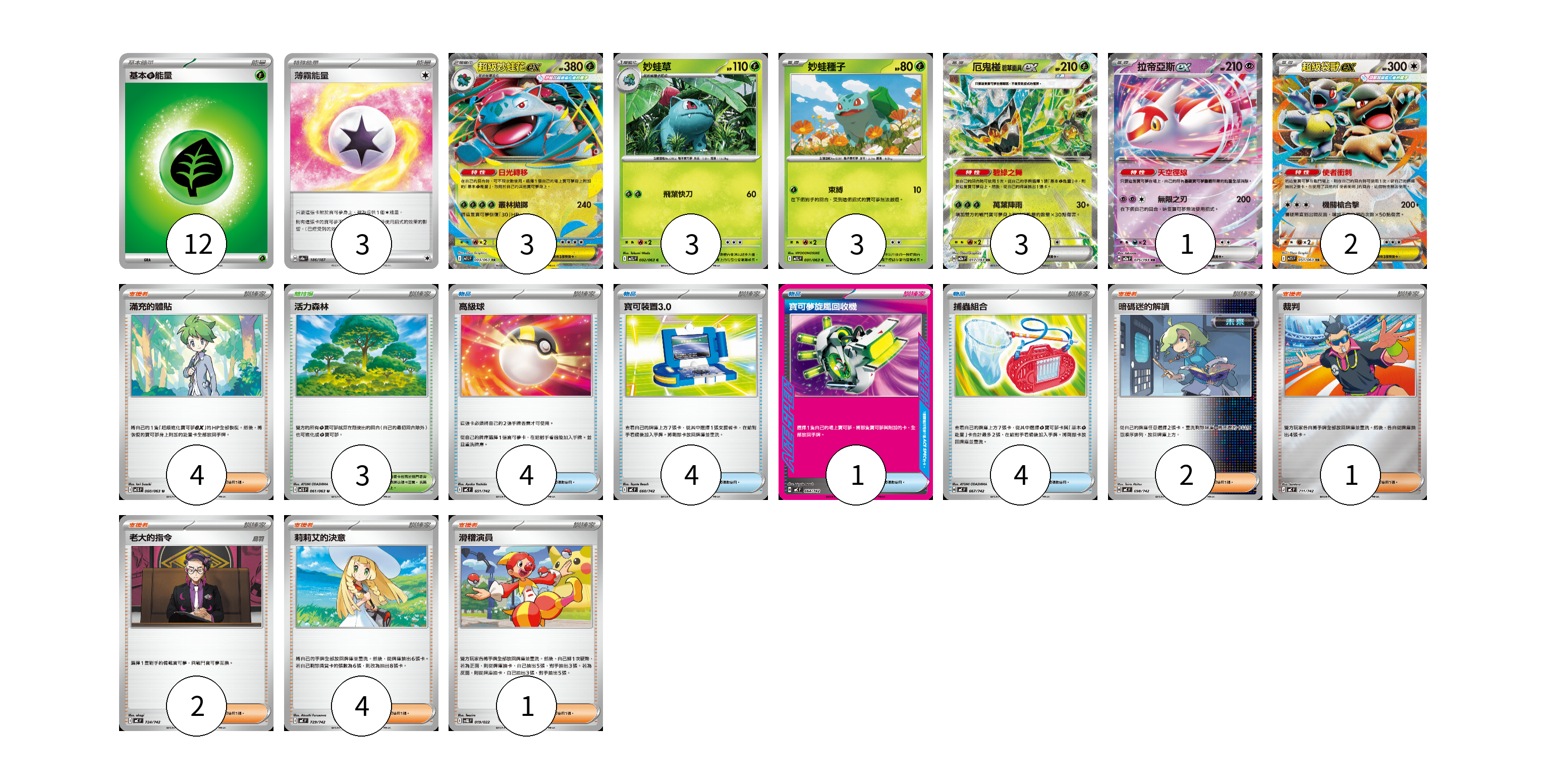 牌組構築方案 以此牌組為基礎新構築牌組 顯示卡面 顯示列表 寶可夢卡(15) 3 3 3 3 1 2 物品卡(13) 4 4 1 4 支援者卡(14) 4 2 1 2 4 1 競技場卡(3) 3 能量卡(15) 12 3 寶可夢卡(15) 卡牌名稱 張數 卡牌名稱 張數 超級妙蛙花ex M1L 003/063 03 妙蛙草 M1L 002/063 03 妙蛙種子 M1L 001/063 03 厄鬼椪 碧草面具ex M2a 017/193 03 拉帝亞斯ex M2a 075/193 01 超級袋獸ex M1S 051/063 02 物品卡(13) 卡牌名稱 張數 卡牌名稱 張數 高級球 MC 651/742 04 寶可裝置3.0 MC 660/742 04 寶可夢旋風回收機 MC 664/742 01 捕蟲組合 MC 667/742 04 支援者卡(14) 卡牌名稱 張數 卡牌名稱 張數 滿充的體貼 M1S 060/063 04 暗碼迷的解讀 MC 698/742 02 裁判 MC 711/742 01 老大的指令 MC 724/742 02 莉莉艾的決意 MC 729/742 04 滑稽演員 SVQL 019/022 01 競技場卡(3) 卡牌名稱 張數 卡牌名稱 張數 活力森林 M1S 061/063 03 能量卡(15) 卡牌名稱 張數 卡牌名稱 張數 基本【草】能量 MJ GRA 12 薄霧能量 SV8a 186/187 03 以此牌組為基礎新構築牌組 牌組編碼 STTkDj-YVqZYs-iaGFOp copy 列印牌組單 牌組編碼已複製 分享至SNS