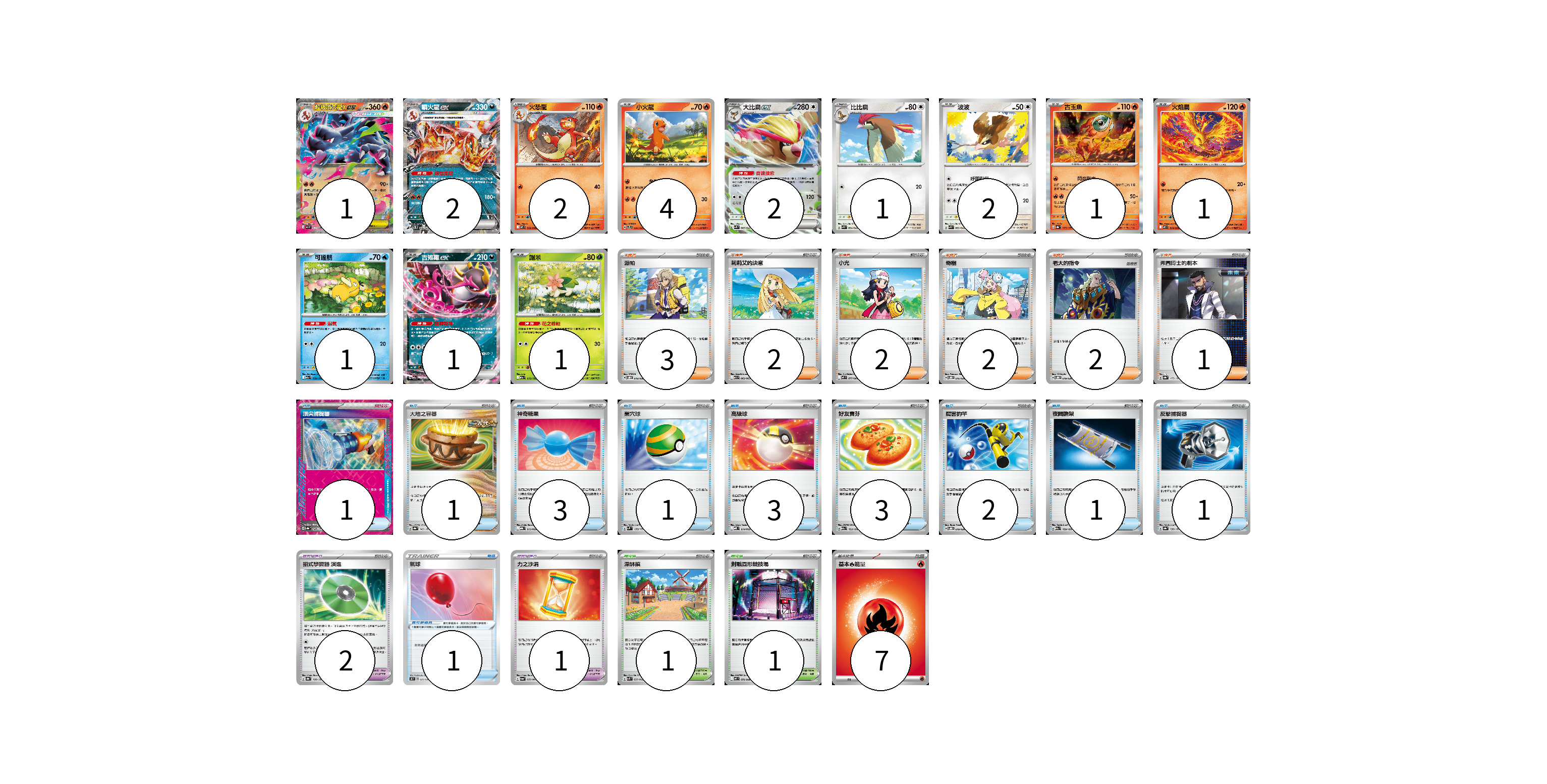 牌組構築方案 以此牌組為基礎新構築牌組 顯示卡面 顯示列表 寶可夢卡(19) 1 2 2 4 2 1 2 1 1 1 1 1 寶可夢道具(4) 2 1 1 物品卡(16) 1 1 3 1 3 3 2 1 1 支援者卡(12) 3 2 2 2 2 1 競技場卡(2) 1 1 能量卡(7) 7 寶可夢卡(19) 卡牌名稱 張數 卡牌名稱 張數 超級噴火龍Xex M2 013/080 01 噴火龍ex SVTL 006/021 02 火恐龍 M2 012/080 02 小火龍 SVTL 001/021 04 大比鳥ex SVK 005/042 02 比比鳥 SVK 004/042 01 波波 SVK 003/042 02 古玉魚 SV8a 025/187 01 火焰鳥 M2 014/080 01 可達鴨 M2a 032/193 01 吉雉雞ex M2a 114/193 01 謝米 M2a 012/193 01 寶可夢道具(4) 卡牌名稱 張數 卡牌名稱 張數 招式學習器 演進 SV8a 160/187 02 氣球 SK 021/030 01 力之沙漏 SV6a 058/064 01 物品卡(16) 卡牌名稱 張數 卡牌名稱 張數 頂尖捕捉器 SV8a 148/187 01 大地之容器 SV8a 143/187 01 神奇糖果 MBG 013/022 03 巢穴球 SVM 133/175 01 高級球 MBD 014/022 03 好友寶芬 M2a 153/193 03 厲害釣竿 SVOD 010/020 02 夜間擔架 M2a 159/193 01 反擊捕捉器 SV8a 139/187 01 支援者卡(12) 卡牌名稱 張數 卡牌名稱 張數 派帕 SVOD 018/020 03 莉莉艾的決意 M1L 062/063 02 小光 M2 077/080 02 奇樹 SVOD 016/020 02 老大的指令 SVOD 019/020 02 弗圖博士的劇本 SV8a 175/187 01 競技場卡(2) 卡牌名稱 張數 卡牌名稱 張數 深缽鎮 SVK 039/042 01 對戰圓形競技場 M2 079/080 01 能量卡(7) 卡牌名稱 張數 卡牌名稱 張數 基本【火】能量 M-P FIR 07 以此牌組為基礎新構築牌組 牌組編碼 SYtAIP-QJRckL-ccPeSp copy 列印牌組單 牌組編碼已複製 分享至SNS