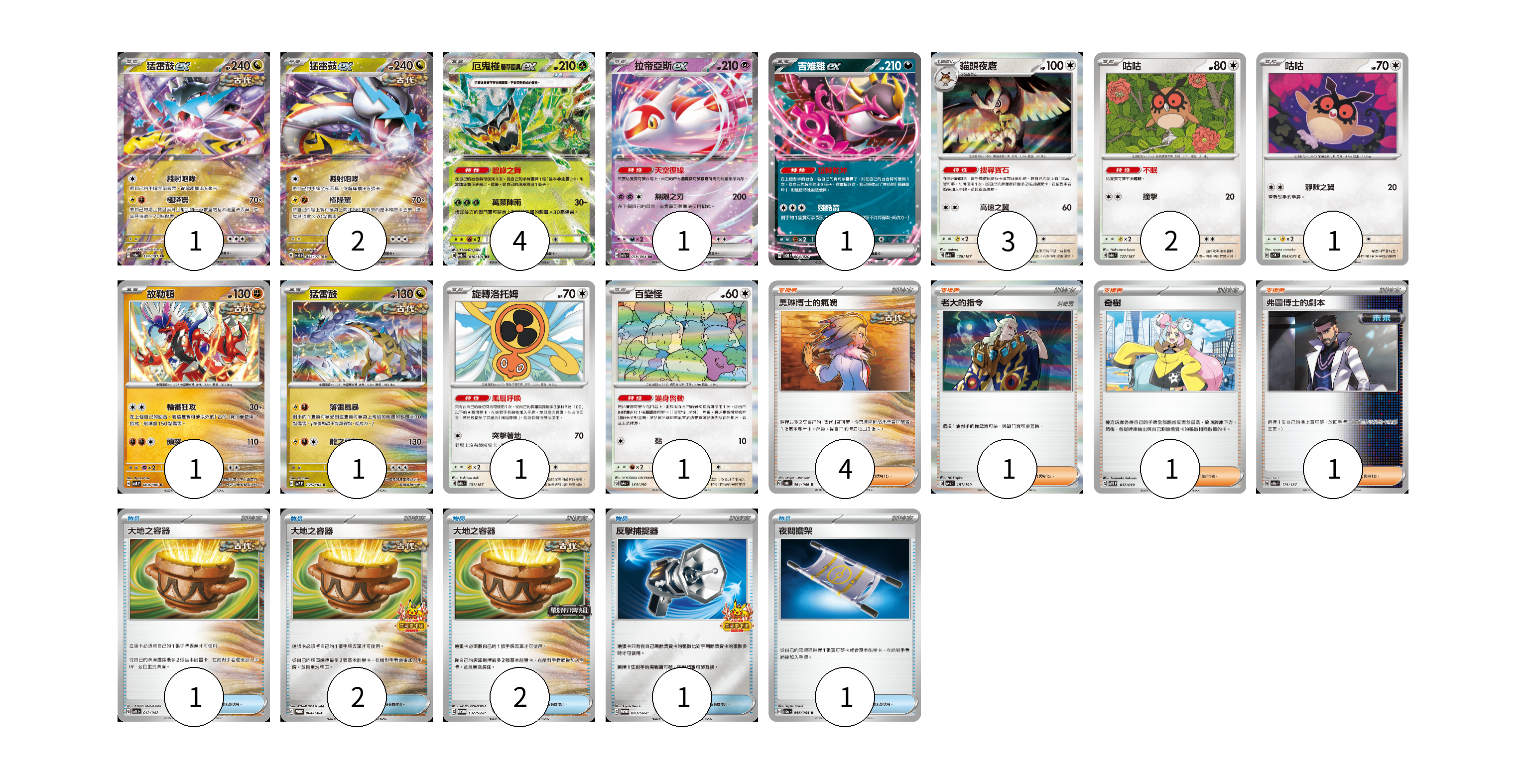 牌組構築方案 以此牌組為基礎新構築牌組 顯示卡面 顯示列表 寶可夢卡(19) 1 2 4 1 1 3 2 1 1 1 1 1 物品卡(7) 1 2 2 1 1 支援者卡(7) 4 1 1 1 寶可夢卡(19) 卡牌名稱 張數 卡牌名稱 張數 猛雷鼓ex SV8a 124/187 01 猛雷鼓ex SV5K 053/071 02 厄鬼椪 碧草面具ex SV6 016/101 04 拉帝亞斯ex SV7a 019/064 01 吉雉雞ex SVOD 004/020 01 貓頭夜鷹 SV8a 128/187 03 咕咕 SV8a 127/187 02 咕咕 SV5K 054/071 01 故勒頓 SV8 069/106 01 猛雷鼓 SV7 075/102 01 旋轉洛托姆 SV8a 131/187 01 百變怪 SV4a 144/190 01 物品卡(7) 卡牌名稱 張數 卡牌名稱 張數 大地之容器 SVK 012/042 01 大地之容器 SV-P 084/SV-P 02 大地之容器 SV-P 137/SV-P 02 反擊捕捉器 SV-P 083/SV-P 01 夜間擔架 SV6a 056/064 01 支援者卡(7) 卡牌名稱 張數 卡牌名稱 張數 奧琳博士的氣魄 SV4K 064/066 04 老大的指令 SV4a 181/190 01 奇樹 SVTG 017/019 01 弗圖博士的劇本 SV8a 175/187 01 以此牌組為基礎新構築牌組 牌組編碼 SZSfPf-MPRezq-spKOSK copy 列印牌組單 牌組編碼已複製 分享至SNS