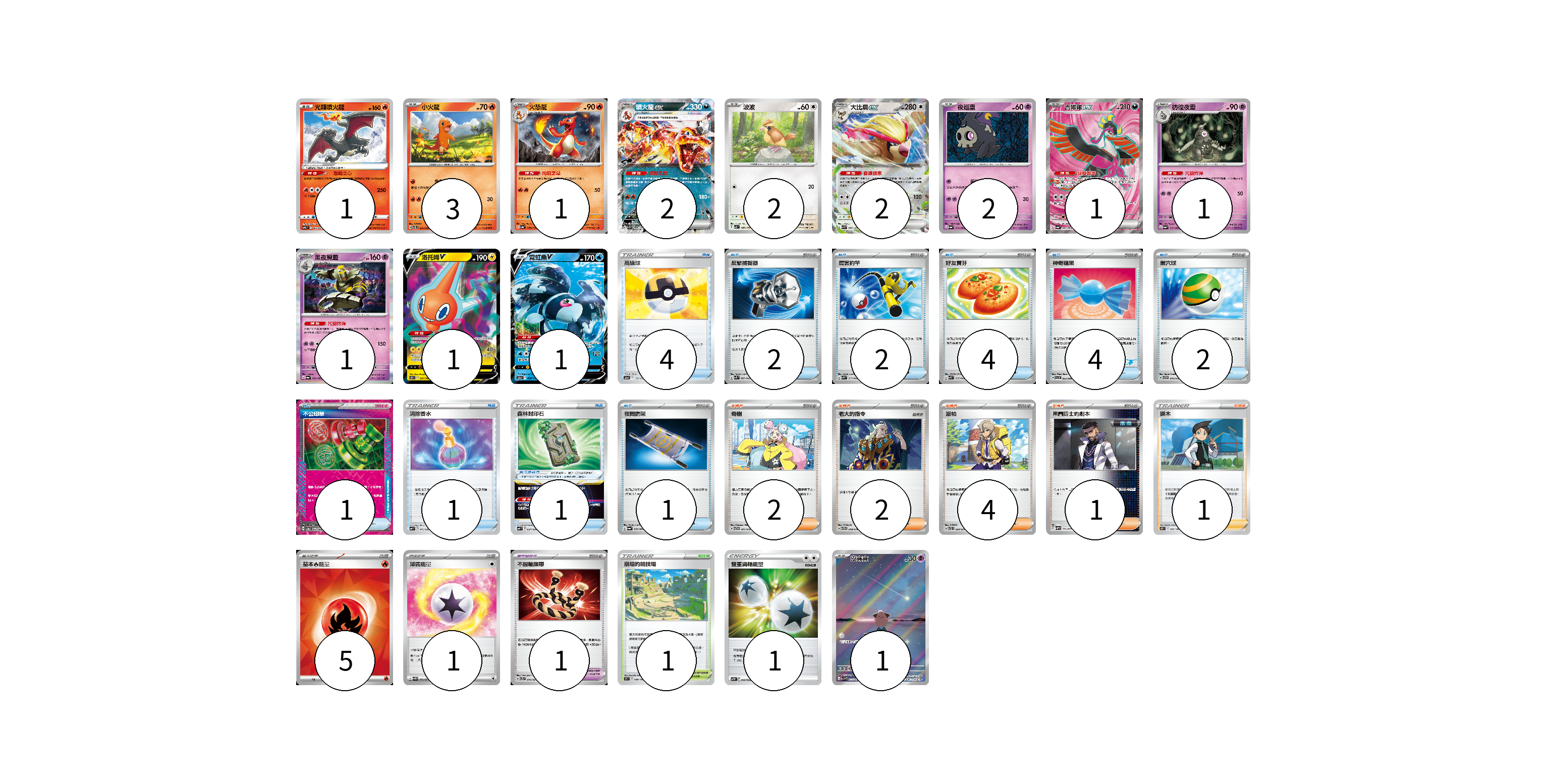 牌組構築方案 以此牌組為基礎新構築牌組 顯示卡面 顯示列表 寶可夢卡(19) 1 3 1 2 2 2 2 1 1 1 1 1 1 寶可夢道具(1) 1 物品卡(22) 4 2 2 4 4 2 1 1 1 1 支援者卡(10) 2 2 4 1 1 競技場卡(1) 1 能量卡(7) 5 1 1 寶可夢卡(19) 卡牌名稱 張數 卡牌名稱 張數 光輝噴火龍 SVTL 003/021 01 小火龍 SVTL 001/021 03 火恐龍 SV4a 026/190 01 噴火龍ex SV3 066/108 02 波波 SV3 087/108 02 大比鳥ex SV3 089/108 02 夜巡靈 SV6a 018/064 02 吉雉雞ex SV6a 081/064 01 彷徨夜靈 SV6a 019/064 01 黑夜魔靈 SV6a 020/064 01 洛托姆V S11 037/100 01 霓虹魚V S12a 026/172 01 皮寶寶 SV3 113/108 01 寶可夢道具(1) 卡牌名稱 張數 卡牌名稱 張數 不服輸頭帶 SVTL 016/021 01 物品卡(22) 卡牌名稱 張數 卡牌名稱 張數 高級球 S12a 138/172 04 反擊捕捉器 SVK 009/042 02 厲害釣竿 SVK 011/042 02 好友寶芬 SVK 015/042 04 神奇糖果 SVI 053/066 04 巢穴球 SVTH 010/018 02 不公印章 SV5a 053/066 01 消除香水 SVF 011/038 01 森林封印石 SVF 024/038 01 夜間擔架 SV6a 056/064 01 支援者卡(10) 卡牌名稱 張數 卡牌名稱 張數 奇樹 SVTG 017/019 02 老大的指令 SVTG 019/019 02 派帕 SVTL 020/021 04 弗圖博士的劇本 SVHM 021/022 01 捩木 S11 097/100 01 競技場卡(1) 卡牌名稱 張數 卡牌名稱 張數 崩塌的競技場 S9 098/100 01 能量卡(7) 卡牌名稱 張數 卡牌名稱 張數 基本【火】能量 SVK FIR 05 薄霧能量 SV5M 071/071 01 雙重渦輪能量 SVTM 022/022 01 以此牌組為基礎新構築牌組 牌組編碼 SZzKWI-BPVgMR-kuFDaj copy 列印牌組單 牌組編碼已複製 分享至SNS