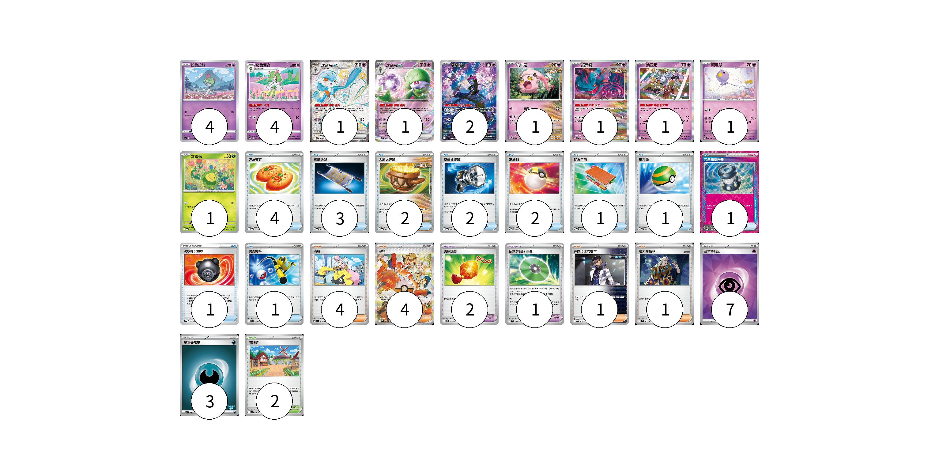 牌組構築方案 以此牌組為基礎新構築牌組 顯示卡面 顯示列表 寶可夢卡(17) 4 4 1 1 2 1 1 1 1 1 寶可夢道具(3) 2 1 物品卡(18) 4 3 2 2 2 1 1 1 1 1 支援者卡(10) 4 4 1 1 競技場卡(2) 2 能量卡(10) 7 3 寶可夢卡(17) 卡牌名稱 張數 卡牌名稱 張數 拉魯拉絲 S9a 032/067 04 奇魯莉安 SVTS 003/022 04 沙奈朵ex SV4a 328/190 01 沙奈朵ex SV1S 028/078 01 願增猿 SV6 107/101 02 吼叫尾 SVTS 007/022 01 振翼髮 SV8a 072/187 01 鑰圈兒 SV4a 087/190 01 飄飄球 SV4a 083/190 01 含羞苞 SV8a 001/187 01 寶可夢道具(3) 卡牌名稱 張數 卡牌名稱 張數 勇氣護符 SVTR 015/021 02 招式學習器 演進 SV8a 160/187 01 物品卡(18) 卡牌名稱 張數 卡牌名稱 張數 好友寶芬 SV8a 147/187 04 夜間擔架 SV8a 151/187 03 大地之容器 SV8a 143/187 02 反擊捕捉器 SV8a 139/187 02 高級球 SVTS 014/022 02 朋友手冊 SV1S 069/078 01 巢穴球 SVK 016/042 01 完全體攪拌器 SVK 017/042 01 洗翠的沉重球 SVF 019/038 01 厲害釣竿 SVF 013/038 01 支援者卡(10) 卡牌名稱 張數 卡牌名稱 張數 奇樹 SVF 029/038 04 派帕 SV4a 353/190 04 弗圖博士的劇本 SVHM 021/022 01 老大的指令 SVM 172/175 01 競技場卡(2) 卡牌名稱 張數 卡牌名稱 張數 深缽鎮 SVK 039/042 02 能量卡(10) 卡牌名稱 張數 卡牌名稱 張數 基本【超】能量 SVK PSY 07 基本【惡】能量 SVI DAR 03 以此牌組為基礎新構築牌組 牌組編碼 SavcBE-nBSqTi-XrqtwW copy 列印牌組單 牌組編碼已複製 分享至SNS