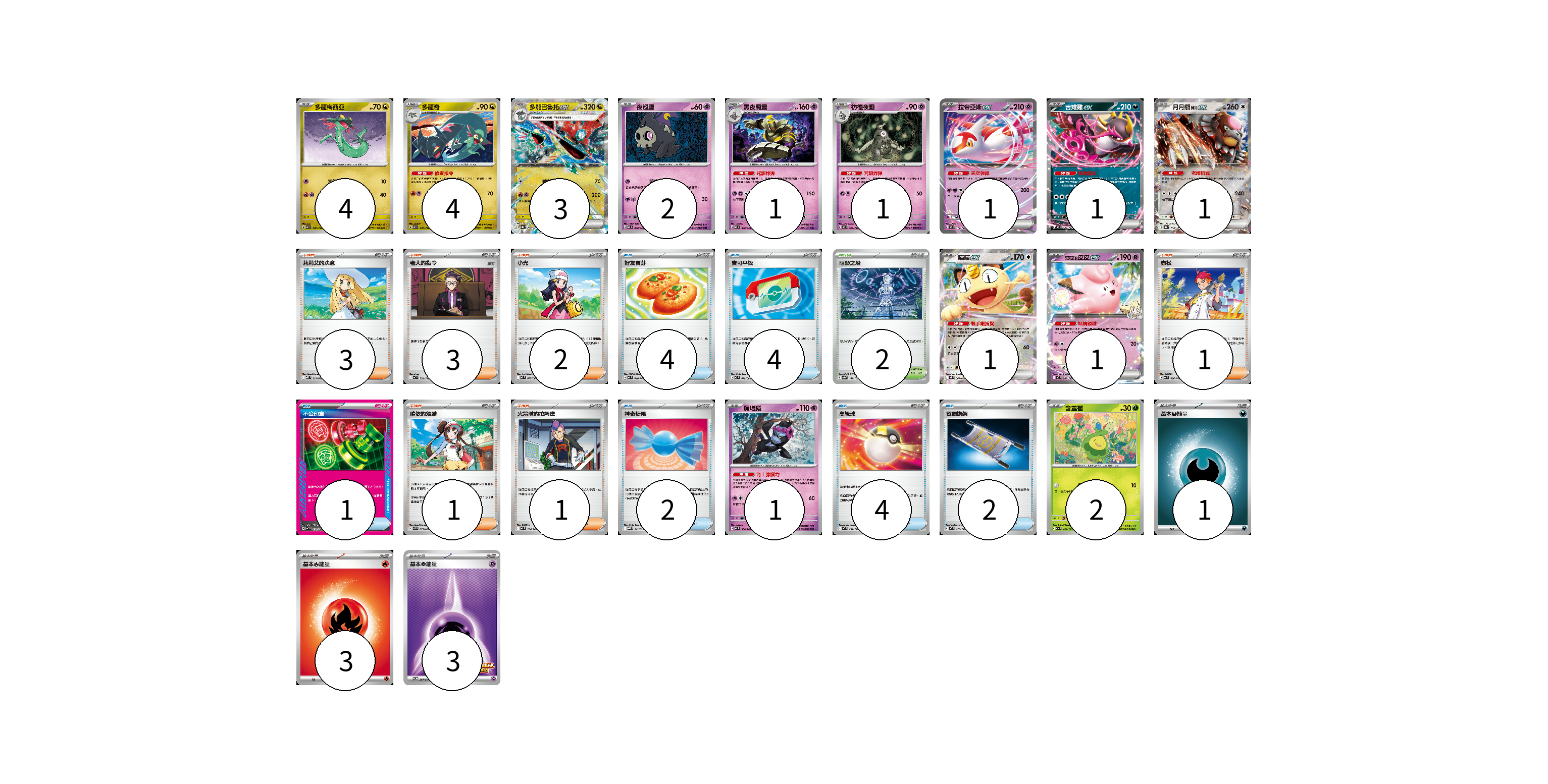 牌組構築方案 以此牌組為基礎新構築牌組 顯示卡面 顯示列表 寶可夢卡(23) 4 4 3 2 1 1 1 1 1 1 1 1 2 物品卡(17) 4 4 1 2 4 2 支援者卡(11) 3 3 2 1 1 1 競技場卡(2) 2 能量卡(7) 1 3 3 寶可夢卡(23) 卡牌名稱 張數 卡牌名稱 張數 多龍梅西亞 MC 546/742 04 多龍奇 MC 547/742 04 多龍巴魯托ex SV8a 120/187 03 夜巡靈 MC 308/742 02 黑夜魔靈 MC 310/742 01 彷徨夜靈 MC 309/742 01 拉帝亞斯ex MC 312/742 01 吉雉雞ex MC 489/742 01 月月熊 赫月ex SV8a 134/187 01 喵喵ex M3 061/080 01 莉莉艾的皮皮ex MC 287/742 01 願增猿 MC 358/742 01 含羞苞 M2a 011/193 02 物品卡(17) 卡牌名稱 張數 卡牌名稱 張數 好友寶芬 MC 648/742 04 寶可平板 M3 070/080 04 不公印章 MC 633/742 01 神奇糖果 MBG 013/022 02 高級球 MC 651/742 04 夜間擔架 MC 670/742 02 支援者卡(11) 卡牌名稱 張數 卡牌名稱 張數 莉莉艾的決意 MBD 021/022 03 老大的指令 MC 724/742 03 小光 M2 077/080 02 赤松 MC 696/742 01 鳴依的勉勵 M3 075/080 01 火箭隊的拉姆達 MC 734/742 01 競技場卡(2) 卡牌名稱 張數 卡牌名稱 張數 阻礙之塔 SV8a 181/187 02 能量卡(7) 卡牌名稱 張數 卡牌名稱 張數 基本【惡】能量 MC DAR 01 基本【火】能量 MC FIR 03 基本【超】能量 SV-P 261/SV-P 03 以此牌組為基礎新構築牌組 牌組編碼 SeHAdY-Lnecmv-IVnbzT copy 列印牌組單 牌組編碼已複製 分享至SNS