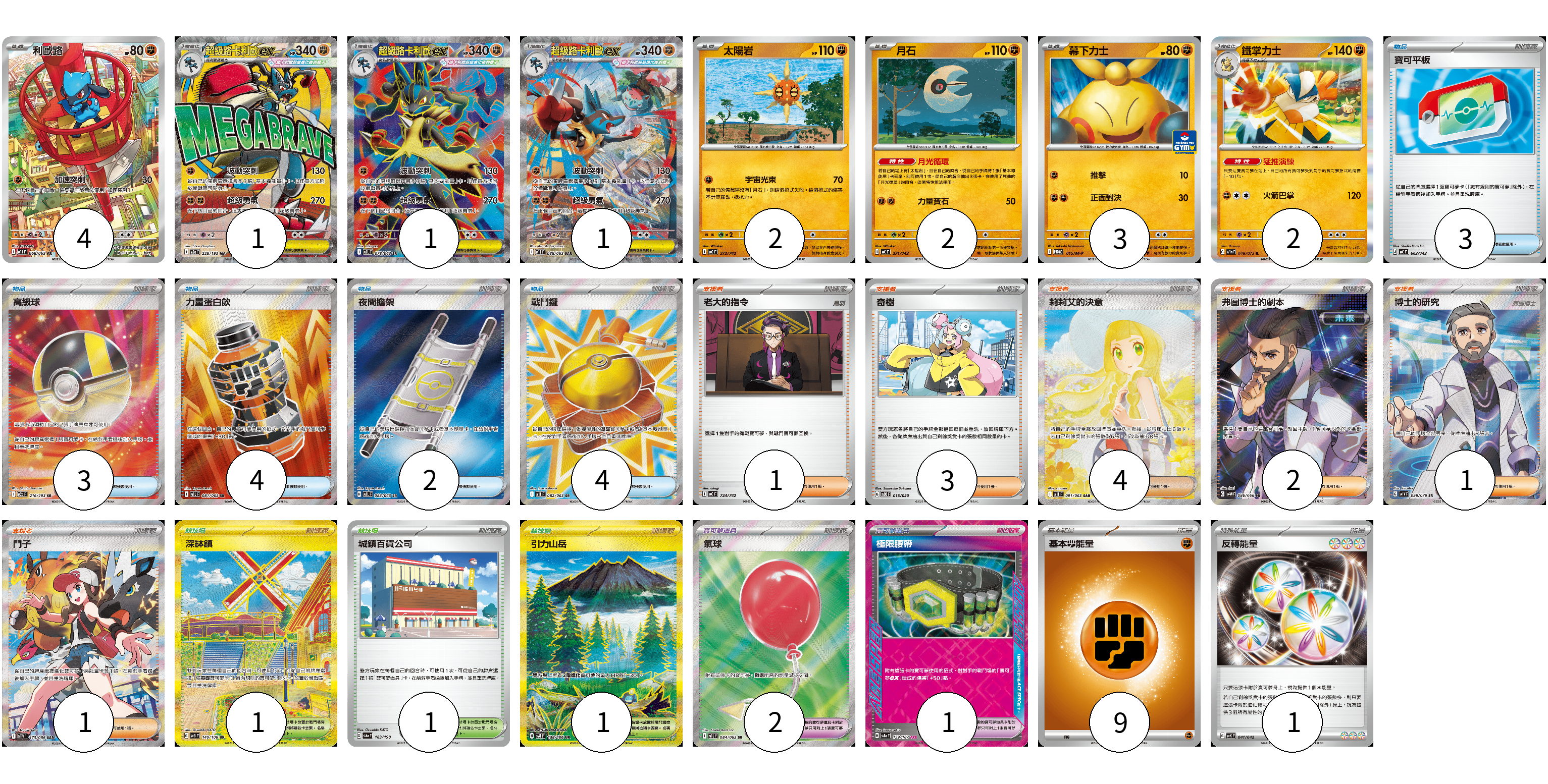 牌組構築方案 以此牌組為基礎新構築牌組 顯示卡面 顯示列表 寶可夢卡(16) 4 1 1 1 2 2 3 2 寶可夢道具(3) 2 1 物品卡(16) 3 3 4 2 4 支援者卡(12) 1 3 4 2 1 1 競技場卡(3) 1 1 1 能量卡(10) 9 1 寶可夢卡(16) 卡牌名稱 張數 卡牌名稱 張數 利歐路 M1L 068/063 04 超級路卡利歐ex M2a 228/193 01 超級路卡利歐ex M1L 078/063 01 超級路卡利歐ex M1L 088/063 01 太陽岩 MC 372/742 02 月石 MC 371/742 02 幕下力士 M-P 015/M-P 03 鐵掌力士 SV1a 048/073 02 寶可夢道具(3) 卡牌名稱 張數 卡牌名稱 張數 氣球 M1L 084/063 02 極限腰帶 SV8a 159/187 01 物品卡(16) 卡牌名稱 張數 卡牌名稱 張數 寶可平板 MC 662/742 03 高級球 M2a 216/193 03 力量蛋白飲 M1L 081/063 04 夜間擔架 M1L 083/063 02 戰鬥鑼 M1L 082/063 04 支援者卡(12) 卡牌名稱 張數 卡牌名稱 張數 老大的指令 MC 724/742 01 奇樹 SVOD 016/020 03 莉莉艾的決意 M1L 091/063 04 弗圖博士的劇本 SV4M 086/066 02 博士的研究(弗圖博士) SV1V 098/078 01 鬥子 SV11W 173/086 01 競技場卡(3) 卡牌名稱 張數 卡牌名稱 張數 深缽鎮 SV3 140/108 01 城鎮百貨公司 SV4a 183/190 01 引力山岳 SV8 138/106 01 能量卡(10) 卡牌名稱 張數 卡牌名稱 張數 基本【鬥】能量 MC FIG 09 反轉能量 SVK 041/042 01 以此牌組為基礎新構築牌組 牌組編碼 SebTTP-povAvb-OPVDPh copy 列印牌組單 牌組編碼已複製 分享至SNS