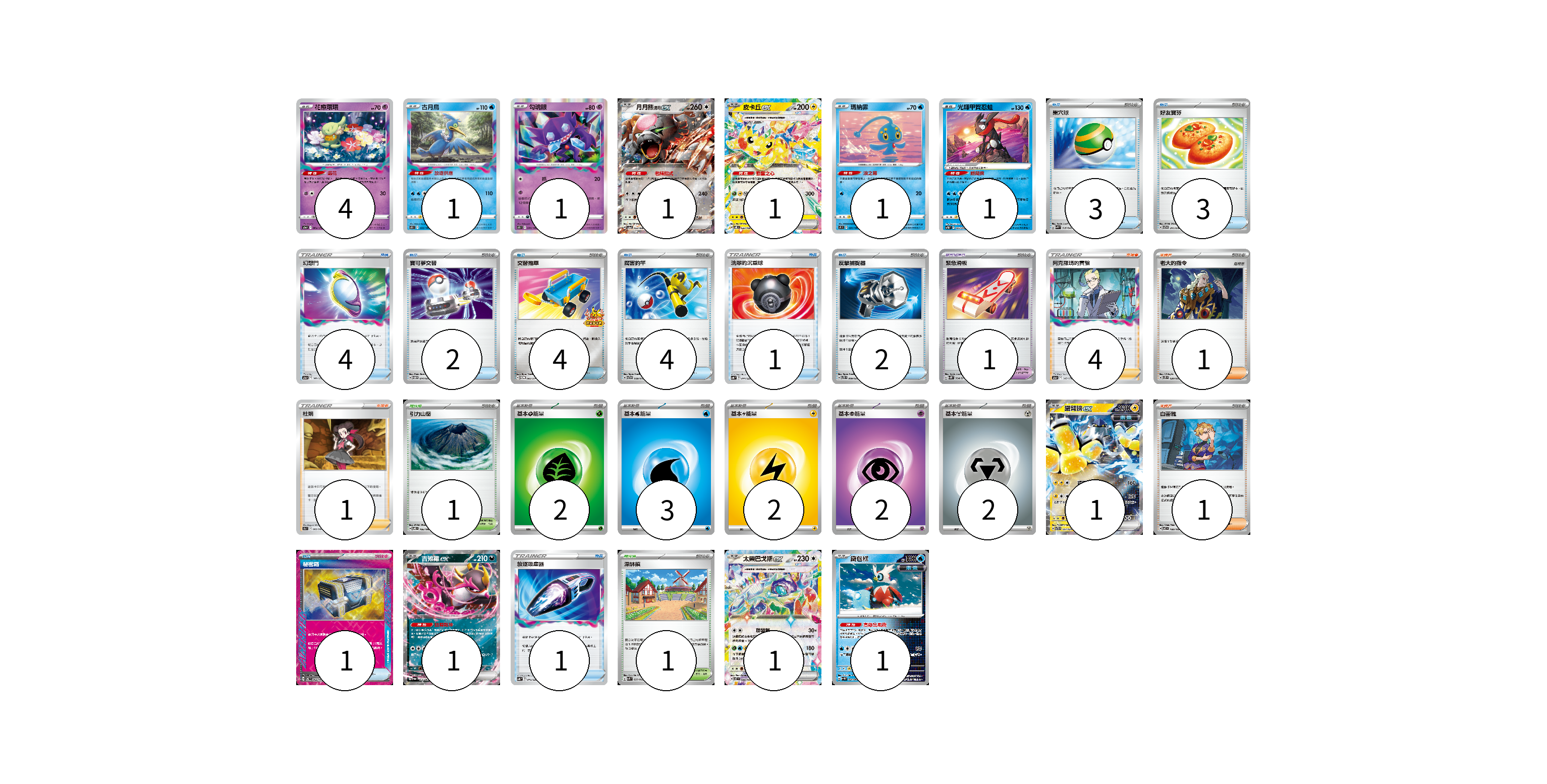 牌組構築方案 以此牌組為基礎新構築牌組 顯示卡面 顯示列表 寶可夢卡(14) 4 1 1 1 1 1 1 1 1 1 1 寶可夢道具(1) 1 物品卡(25) 3 3 4 2 4 4 1 2 1 1 支援者卡(7) 4 1 1 1 競技場卡(2) 1 1 能量卡(11) 2 3 2 2 2 寶可夢卡(14) 卡牌名稱 張數 卡牌名稱 張數 花療環環 S12a 064/172 04 古月鳥 S11 033/100 01 勾魂眼 S11 044/100 01 月月熊 赫月 ex SV5a 052/066 01 皮卡丘ex SV8 033/106 01 瑪納霏 S9 031/100 01 光輝甲賀忍蛙 SVTG 002/019 01 鐵臂膀ex SVTR 007/021 01 吉雉雞ex SV6a 038/064 01 太樂巴戈斯ex SV7 088/102 01 鐵包袱 SV4M 020/066 01 寶可夢道具(1) 卡牌名稱 張數 卡牌名稱 張數 緊急滑板 SV5K 064/071 01 物品卡(25) 卡牌名稱 張數 卡牌名稱 張數 巢穴球 SVK 016/042 03 好友寶芬 SVTG 011/019 03 幻想門 S12a 141/172 04 寶可夢交替 SVTM 014/022 02 交替推車 SV-P 082/SV-P 04 厲害釣竿 SVTG 009/019 04 洗翠的沉重球 SVB 014/028 01 反擊捕捉器 SVTS 009/022 02 秘密箱 SV6 092/101 01 放逐吸塵器 SVB 016/028 01 支援者卡(7) 卡牌名稱 張數 卡牌名稱 張數 阿克羅瑪的實驗 S12a 148/172 04 老大的指令 SVTS 020/022 01 杜娟 S9a 065/067 01 白蕾雅 SV7 100/102 01 競技場卡(2) 卡牌名稱 張數 卡牌名稱 張數 引力山岳 SV8 106/106 01 深缽鎮 SVK 039/042 01 能量卡(11) 卡牌名稱 張數 卡牌名稱 張數 基本【草】能量 SVF GRA 02 基本【水】能量 SVF WAT 03 基本【雷】能量 SVF LIG 02 基本【超】能量 SVF PSY 02 基本【鋼】能量 SVF MET 02 以此牌組為基礎新構築牌組 牌組編碼 SpWkJm-YuJbpT-rkSQcq copy 列印牌組單 牌組編碼已複製 分享至SNS