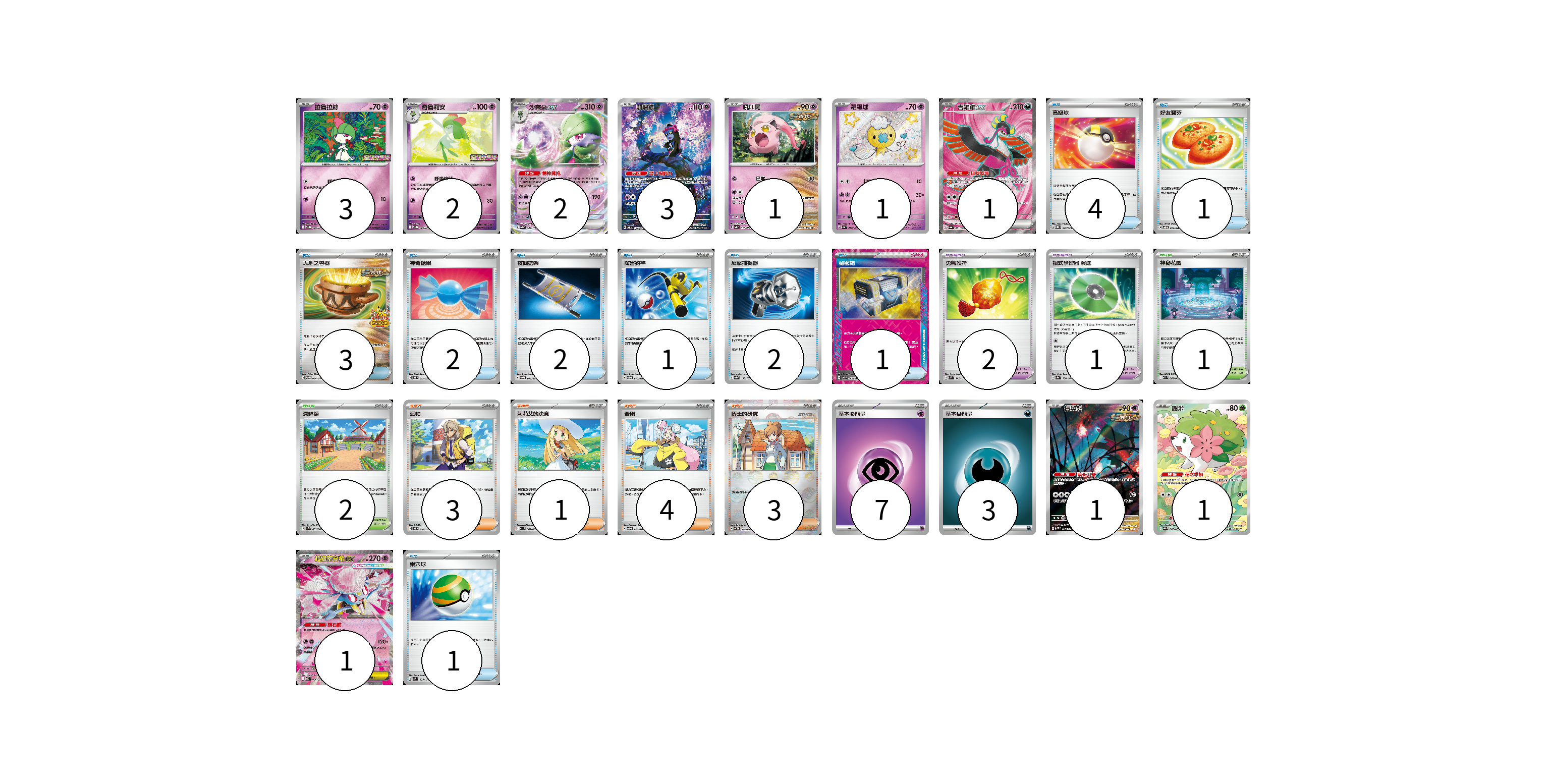 牌組構築方案 以此牌組為基礎新構築牌組 顯示卡面 顯示列表 寶可夢卡(16) 3 2 2 3 1 1 1 1 1 1 寶可夢道具(3) 2 1 物品卡(17) 4 1 3 2 2 1 2 1 1 支援者卡(11) 3 1 4 3 競技場卡(3) 1 2 能量卡(10) 7 3 寶可夢卡(16) 卡牌名稱 張數 卡牌名稱 張數 拉魯拉絲 M-P 005/M-P 03 奇魯莉安 M-P 006/M-P 02 沙奈朵ex SV4a 082/190 02 願增猿 SV6 107/101 03 吼叫尾 SV4K 032/066 01 飄飄球 SV4a 260/190 01 吉雉雞ex SV6a 081/064 01 振翼髮 SV5K 076/071 01 謝米 SV9a 066/063 01 超級蒂安希ex MBD 006/022 01 寶可夢道具(3) 卡牌名稱 張數 卡牌名稱 張數 勇氣護符 SVM 142/175 02 招式學習器 演進 SV8a 160/187 01 物品卡(17) 卡牌名稱 張數 卡牌名稱 張數 高級球 SVQL 015/022 04 好友寶芬 SVOD 011/020 01 大地之容器 SV-P 084/SV-P 03 神奇糖果 SVOD 013/020 02 夜間擔架 SVOM 016/021 02 厲害釣竿 SVOD 010/020 01 反擊捕捉器 SV8a 139/187 02 秘密箱 SV6 092/101 01 巢穴球 SVM 133/175 01 支援者卡(11) 卡牌名稱 張數 卡牌名稱 張數 派帕 SVOD 018/020 03 莉莉艾的決意 M1L 062/063 01 奇樹 SVOD 016/020 04 博士的研究 SV11B 084/086 03 競技場卡(3) 卡牌名稱 張數 卡牌名稱 張數 神秘花園 M1S 063/063 01 深缽鎮 SVK 039/042 02 能量卡(10) 卡牌名稱 張數 卡牌名稱 張數 基本超能量 sv-p PSY 07 基本惡能量 sv-p DAR 03 以此牌組為基礎新構築牌組 牌組編碼 SwPFij-csBszE-XWTQYM copy 列印牌組單 牌組編碼已複製 分享至SNS