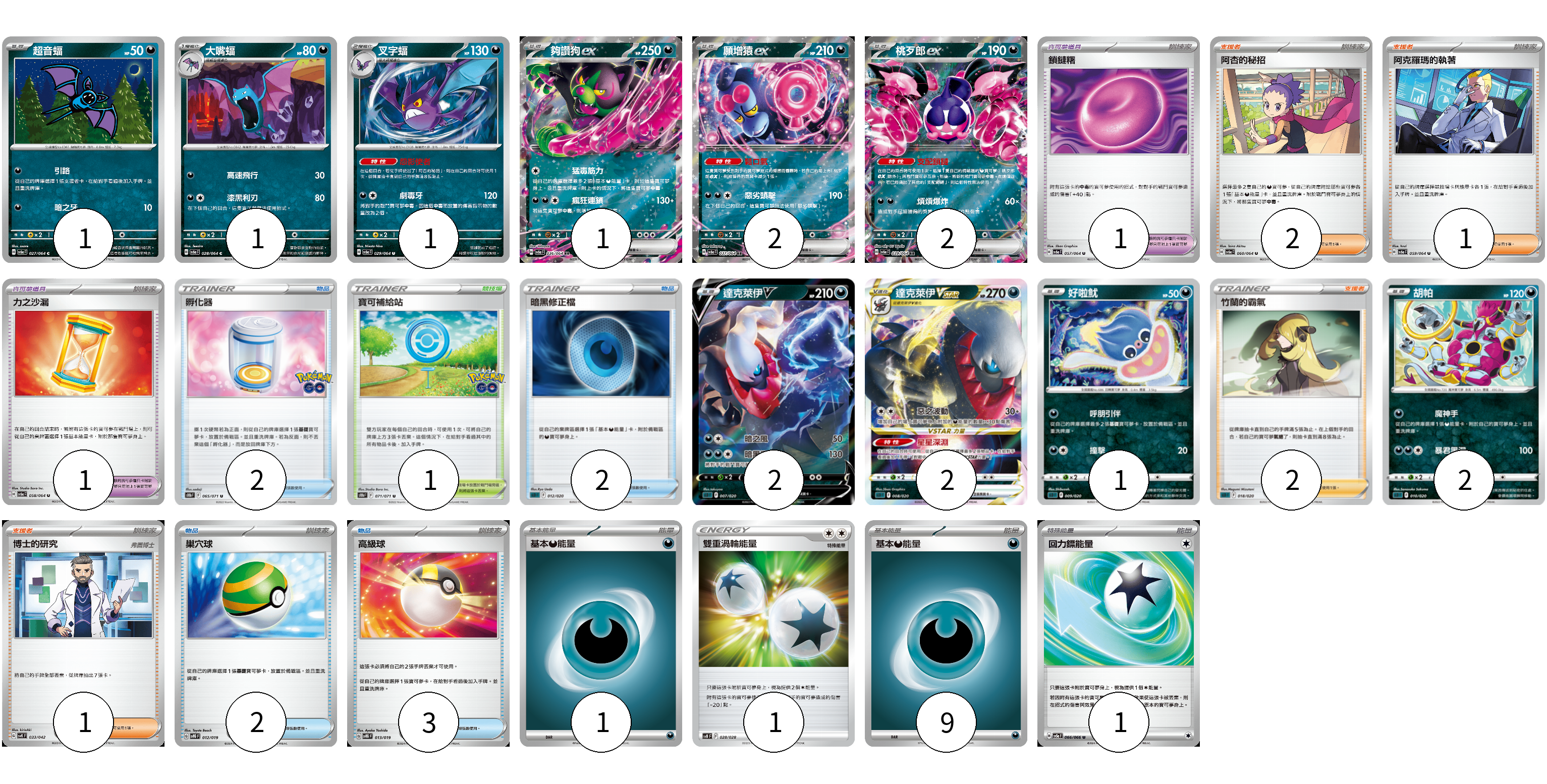 牌組構築方案 以此牌組為基礎新構築牌組 顯示卡面 顯示列表 寶可夢卡(15) 1 1 1 1 2 2 2 2 1 2 寶可夢道具(2) 1 1 物品卡(9) 2 2 2 3 支援者卡(6) 2 1 2 1 競技場卡(1) 1 能量卡(12) 1 1 9 1 寶可夢卡(15) 卡牌名稱 張數 卡牌名稱 張數 超音蝠 SV6a 027/064 01 大嘴蝠 SV6a 028/064 01 叉字蝠 SV6a 029/064 01 夠讚狗ex SV6a 036/064 01 願增猿ex SV6a 037/064 02 桃歹郎ex SV6a 039/064 02 達克萊伊V SLD 007/020 02 達克萊伊VSTAR SLD 008/020 02 好啦魷 SLD 009/020 01 胡帕 SLD 010/020 02 寶可夢道具(2) 卡牌名稱 張數 卡牌名稱 張數 鎖鏈糬 SV6a 057/064 01 力之沙漏 SV6a 058/064 01 物品卡(9) 卡牌名稱 張數 卡牌名稱 張數 孵化器 S10b 065/071 02 暗黑修正檔 SLD 012/020 02 巢穴球 SVTG 012/019 02 高級球 SVTG 013/019 03 支援者卡(6) 卡牌名稱 張數 卡牌名稱 張數 阿杏的秘招 SV6a 060/064 02 阿克羅瑪的執著 SV6a 059/064 01 竹蘭的霸氣 SLD 018/020 02 博士的研究 SVK 033/042 01 競技場卡(1) 卡牌名稱 張數 卡牌名稱 張數 寶可補給站 S10b 071/071 01 能量卡(12) 卡牌名稱 張數 卡牌名稱 張數 基本【惡】能量 SVB DAR 01 雙重渦輪能量 SVB 028/028 01 基本惡能量 sv-p DAR 09 回力鏢能量 SV5a 066/066 01 以此牌組為基礎新構築牌組 牌組編碼 SzmRdr-FjhSIE-mllzqr copy 列印牌組單 牌組編碼已複製 分享至SNS