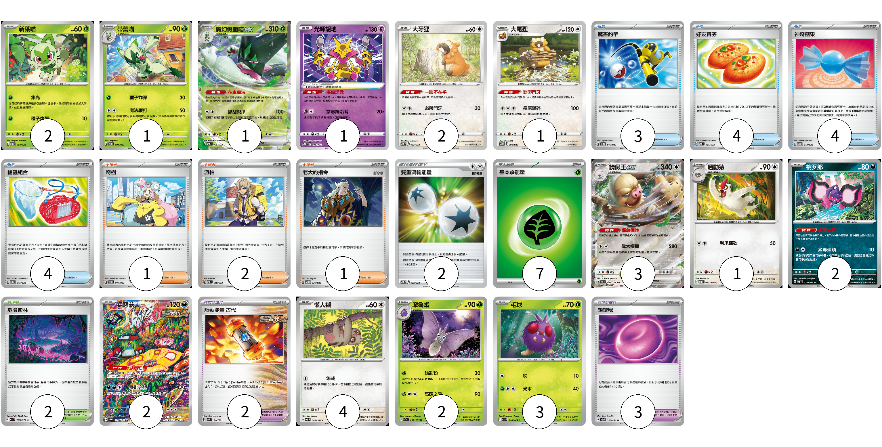 牌組構築方案 以此牌組為基礎新構築牌組 顯示卡面 顯示列表 寶可夢卡(25) 2 1 1 1 2 1 3 1 2 2 4 2 3 寶可夢道具(5) 2 3 物品卡(15) 3 4 4 4 支援者卡(4) 1 2 1 競技場卡(2) 2 能量卡(9) 2 7 寶可夢卡(25) 卡牌名稱 張數 卡牌名稱 張數 新葉喵 SVTM 003/022 02 蒂蕾喵 SVTM 004/022 01 魔幻假面喵ex SVTM 005/022 01 光輝胡地 SVTM 006/022 01 大牙狸 SVTM 007/022 02 大尾狸 SVTM 008/022 01 請假王ex SV8 084/106 03 過動猿 SV8 083/106 01 桃歹郎 SV8 075/106 02 猛惡菇 SV4K 077/066 02 懶人獺 SV8 082/106 04 摩魯蛾 SV2a 049/165 02 毛球 SV2a 048/165 03 寶可夢道具(5) 卡牌名稱 張數 卡牌名稱 張數 驅勁能量 古代 SVHK 016/022 02 鎖鏈糬 SV6a 057/064 03 物品卡(15) 卡牌名稱 張數 卡牌名稱 張數 厲害釣竿 SVTM 010/022 03 好友寶芬 SVTM 011/022 04 神奇糖果 SVTM 013/022 04 捕蟲組合 SVTM 015/022 04 支援者卡(4) 卡牌名稱 張數 卡牌名稱 張數 奇樹 SVTM 017/022 01 派帕 SVTM 019/022 02 老大的指令 SVTM 020/022 01 競技場卡(2) 卡牌名稱 張數 卡牌名稱 張數 危險密林 SV5K 070/071 02 能量卡(9) 卡牌名稱 張數 卡牌名稱 張數 雙重渦輪能量 SVTM 022/022 02 基本【草】能量 SVTM GRA 07 以此牌組為基礎新構築牌組 牌組編碼 SzrAFi-qXamFJ-FXQyCT copy 列印牌組單 牌組編碼已複製 分享至SNS