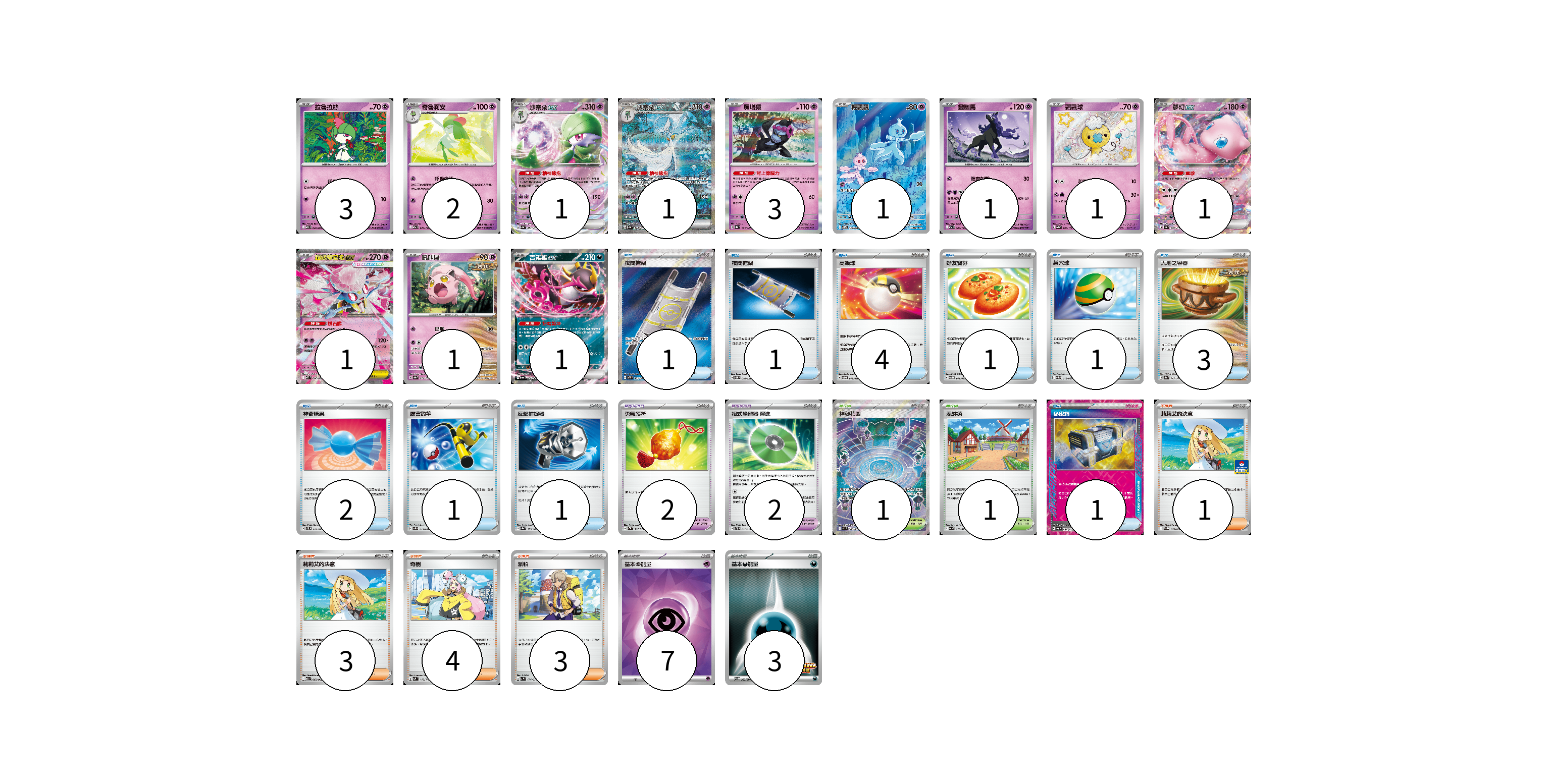牌組構築方案 以此牌組為基礎新構築牌組 顯示卡面 顯示列表 寶可夢卡(17) 3 2 1 1 3 1 1 1 1 1 1 1 寶可夢道具(4) 2 2 物品卡(16) 1 1 4 1 1 3 2 1 1 1 支援者卡(11) 1 3 4 3 競技場卡(2) 1 1 能量卡(10) 7 3 寶可夢卡(17) 卡牌名稱 張數 卡牌名稱 張數 拉魯拉絲 M1S 040/063 03 奇魯莉安 M2a 070/193 02 沙奈朵ex SV4a 082/190 01 沙奈朵ex SV4a 348/190 01 願增猿 SV8a 075/187 03 輕飄飄 SV11W 124/086 01 靈幽馬 M2a 080/193 01 飄飄球 SV4a 260/190 01 夢幻ex SV4a 076/190 01 超級蒂安希ex MBD 006/022 01 吼叫尾 SV8a 071/187 01 吉雉雞ex SV6a 038/064 01 寶可夢道具(4) 卡牌名稱 張數 卡牌名稱 張數 勇氣護符 SV2D 067/071 02 招式學習器 演進 SVTL 017/021 02 物品卡(16) 卡牌名稱 張數 卡牌名稱 張數 夜間擔架 M1L 083/063 01 夜間擔架 SVOM 016/021 01 高級球 SVOD 012/020 04 好友寶芬 SVTM 011/022 01 巢穴球 SVEM 012/020 01 大地之容器 SV8a 143/187 03 神奇糖果 SVTL 013/021 02 厲害釣竿 SVF 013/038 01 反擊捕捉器 SV8a 139/187 01 秘密箱 SV6 092/101 01 支援者卡(11) 卡牌名稱 張數 卡牌名稱 張數 莉莉艾的決意 M-P 018/M-P 01 莉莉艾的決意 M1L 062/063 03 奇樹 SVM 160/175 04 派帕 SV1V 076/078 03 競技場卡(2) 卡牌名稱 張數 卡牌名稱 張數 神秘花園 M1S 086/063 01 深缽鎮 SV1a 070/073 01 能量卡(10) 卡牌名稱 張數 卡牌名稱 張數 基本【超】能量 SVK PSY 07 基本【惡】能量 SV-P 263/SV-P 03 以此牌組為基礎新構築牌組 牌組編碼 TCqatO-UmAnWi-QJCEkU copy 列印牌組單 牌組編碼已複製 分享至SNS