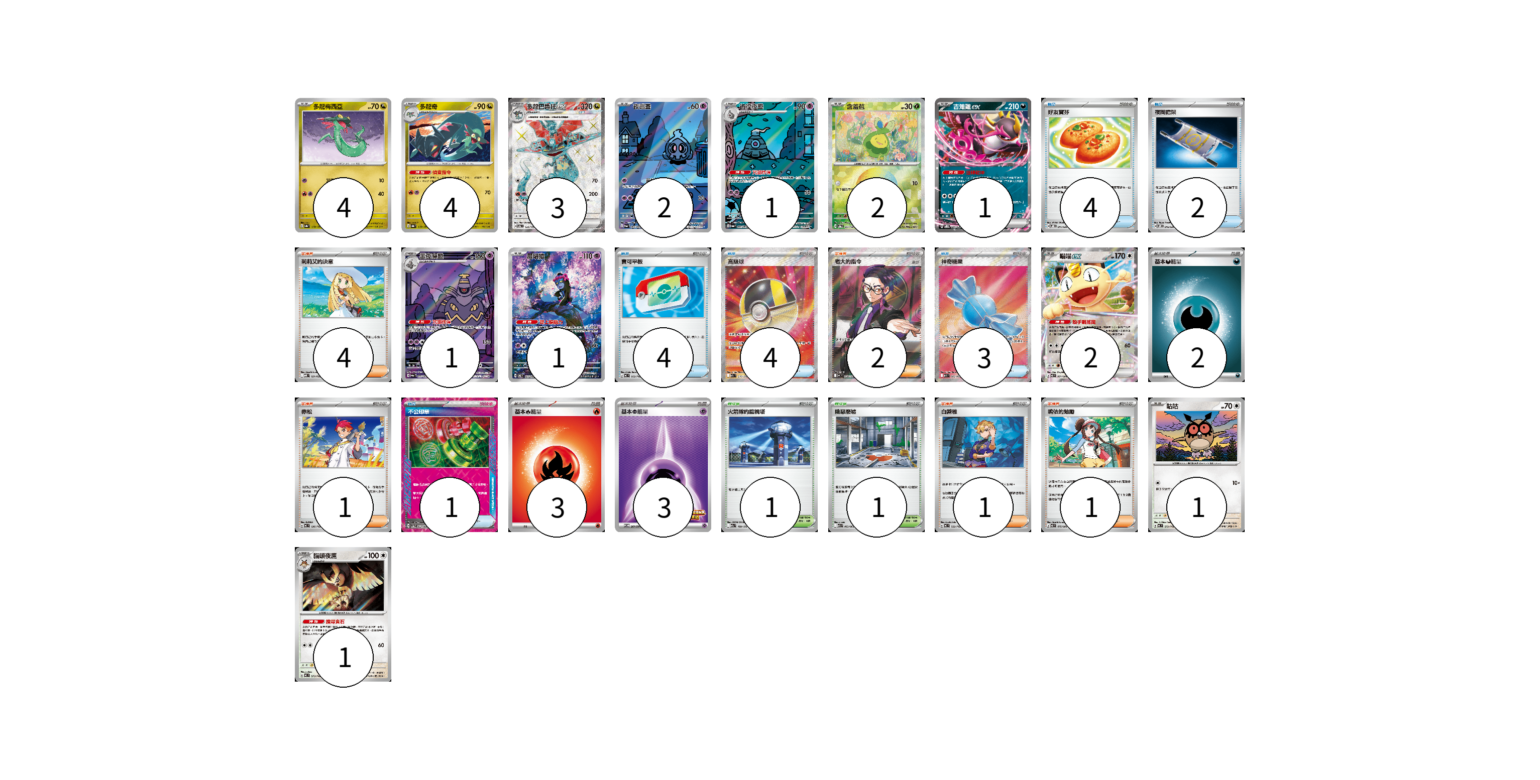 牌組構築方案 以此牌組為基礎新構築牌組 顯示卡面 顯示列表 寶可夢卡(23) 4 4 3 2 1 2 1 1 1 2 1 1 物品卡(18) 4 2 4 4 3 1 支援者卡(9) 4 2 1 1 1 競技場卡(2) 1 1 能量卡(8) 2 3 3 寶可夢卡(23) 卡牌名稱 張數 卡牌名稱 張數 多龍梅西亞 SV8a 118/187 04 多龍奇 SV8a 119/187 04 多龍巴魯托ex SV6 120/101 03 夜巡靈 SV6a 068/064 02 彷徨夜靈 SV6a 069/064 01 含羞苞 SV8a 001/187 02 吉雉雞ex SVOD 004/020 01 黑夜魔靈 SV6a 070/064 01 願增猿 SV6 107/101 01 喵喵ex M3 061/080 02 咕咕 MC 572/742 01 貓頭夜鷹 MC 573/742 01 物品卡(18) 卡牌名稱 張數 卡牌名稱 張數 好友寶芬 SVOD 011/020 04 夜間擔架 SVOM 016/021 02 寶可平板 MC 662/742 04 高級球 M2a 216/193 04 神奇糖果 M1S 082/063 03 不公印章 SV5a 053/066 01 支援者卡(9) 卡牌名稱 張數 卡牌名稱 張數 莉莉艾的決意 MBD 021/022 04 老大的指令(烏羽) MC 760/742 02 赤松 MC 696/742 01 白蕾雅 MC 722/742 01 鳴依的勉勵 M3 075/080 01 競技場卡(2) 卡牌名稱 張數 卡牌名稱 張數 火箭隊的監視塔 M2a 189/193 01 險惡廢墟 M1L 063/063 01 能量卡(8) 卡牌名稱 張數 卡牌名稱 張數 基本【惡】能量 MC DAR 02 基本【火】能量 MC FIR 03 基本【超】能量 SV-P 261/SV-P 03 以此牌組為基礎新構築牌組 牌組編碼 THWFqZ-ZlgRKs-wRVGsd copy 列印牌組單 牌組編碼已複製 分享至SNS