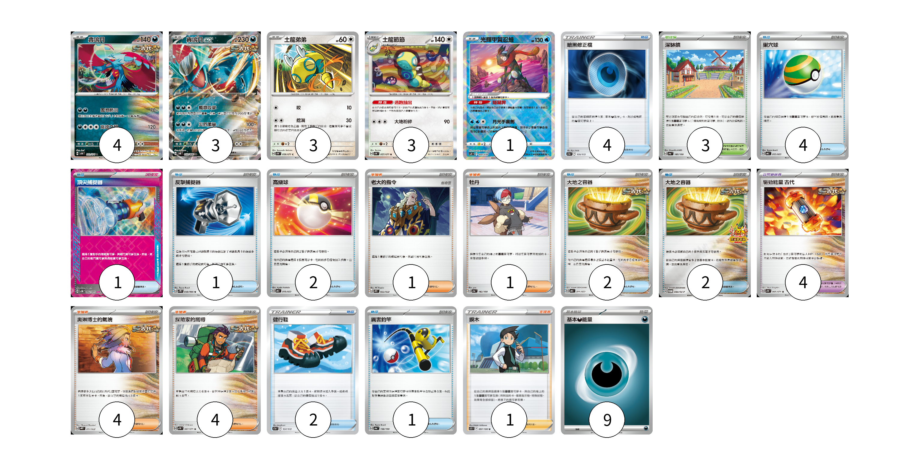 牌組構築方案 以此牌組為基礎新構築牌組 顯示卡面 顯示列表 寶可夢卡(14) 4 3 3 3 1 寶可夢道具(4) 4 物品卡(19) 4 4 1 1 2 2 2 2 1 支援者卡(11) 1 1 4 4 1 競技場卡(3) 3 能量卡(9) 9 寶可夢卡(14) 卡牌名稱 張數 卡牌名稱 張數 轟鳴月 SV5K 051/071 04 轟鳴月ex SV4K 054/066 03 土龍弟弟 SV5K 056/071 03 土龍節節 SV5K 057/071 03 光輝甲賀忍蛙 SVF 004/038 01 寶可夢道具(4) 卡牌名稱 張數 卡牌名稱 張數 驅勁能量 古代 SV5K 065/071 04 物品卡(19) 卡牌名稱 張數 卡牌名稱 張數 暗黑修正檔 S12a 135/172 04 巢穴球 SVHK 012/022 04 頂尖捕捉器 SV5M 062/071 01 反擊捕捉器 SV4M 059/066 01 高級球 SVHK 013/022 02 大地之容器 SVHK 011/022 02 大地之容器 SV-P 084/SV-P 02 健行鞋 S12a 137/172 02 厲害釣竿 SV4a 158/190 01 支援者卡(11) 卡牌名稱 張數 卡牌名稱 張數 老大的指令 SVHK 022/022 01 牡丹 SV4a 182/190 01 奧琳博士的氣魄 SVHK 017/022 04 探險家的嚮導 SV5K 067/071 04 捩木 S11 097/100 01 競技場卡(3) 卡牌名稱 張數 卡牌名稱 張數 深缽鎮 SV4a 185/190 03 能量卡(9) 卡牌名稱 張數 卡牌名稱 張數 基本【惡】能量 SVF DAR 09 以此牌組為基礎新構築牌組 牌組編碼 TJmuaB-zOttGD-WpMisU copy 列印牌組單 牌組編碼已複製 分享至SNS