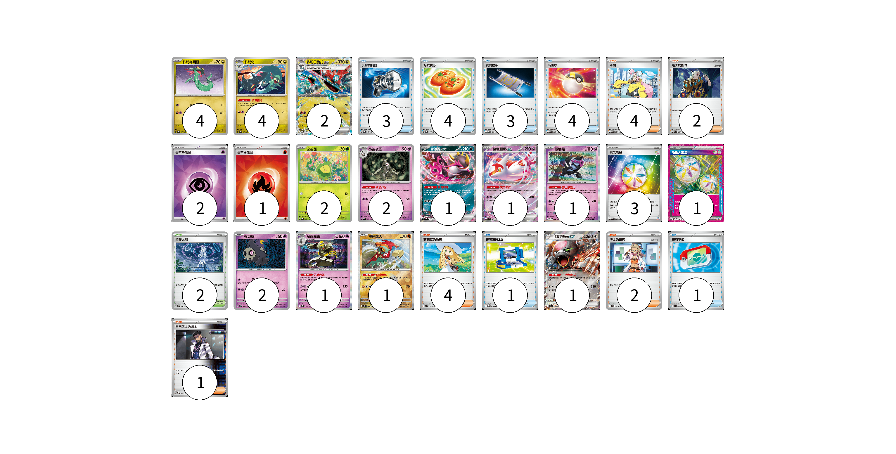 牌組構築方案 以此牌組為基礎新構築牌組 顯示卡面 顯示列表 寶可夢卡(22) 4 4 2 2 2 1 1 1 2 1 1 1 物品卡(16) 3 4 3 4 1 1 支援者卡(13) 4 2 4 2 1 競技場卡(2) 2 能量卡(7) 2 1 3 1 寶可夢卡(22) 卡牌名稱 張數 卡牌名稱 張數 多龍梅西亞 SV8a 118/187 04 多龍奇 SV8a 119/187 04 多龍巴魯托ex SV8a 120/187 02 含羞苞 SV8a 001/187 02 彷徨夜靈 SV6a 019/064 02 吉雉雞ex SV8a 104/187 01 拉帝亞斯ex SV7a 019/064 01 願增猿 SV6 055/101 01 夜巡靈 SV8a 064/187 02 黑夜魔靈 SV8a 066/187 01 摔角鷹人 SV8a 084/187 01 月月熊 赫月 ex SV5a 052/066 01 物品卡(16) 卡牌名稱 張數 卡牌名稱 張數 反擊捕捉器 SV8a 139/187 03 好友寶芬 SV8a 147/187 04 夜間擔架 SV8a 151/187 03 高級球 SVK 018/042 04 寶可裝置3.0 SV11B 081/086 01 寶可平板 MC 662/742 01 支援者卡(13) 卡牌名稱 張數 卡牌名稱 張數 奇樹 SVK 031/042 04 老大的指令 SVK 036/042 02 莉莉艾的決意 M1L 062/063 04 博士的研究 SVF 030/038 02 弗圖博士的劇本 SVK 034/042 01 競技場卡(2) 卡牌名稱 張數 卡牌名稱 張數 阻礙之塔 SV8a 181/187 02 能量卡(7) 卡牌名稱 張數 卡牌名稱 張數 基本【超】能量 SVK PSY 02 基本【火】能量 SVK FIR 01 夜光能量 SVK 042/042 03 新衝天能量 SV5K 071/071 01 以此牌組為基礎新構築牌組 牌組編碼 TLjtuw-OhjBHy-otGacM copy 列印牌組單 牌組編碼已複製 分享至SNS