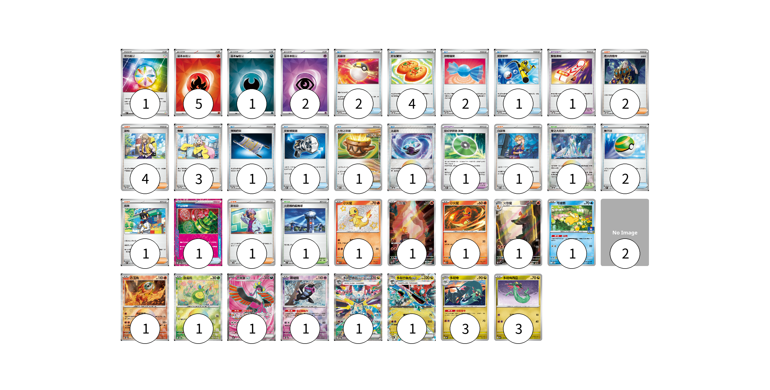牌組構築方案 以此牌組為基礎新構築牌組 顯示卡面 顯示列表 寶可夢卡(17) 1 1 1 1 1 1 1 1 1 1 1 3 3 寶可夢道具(2) 1 1 物品卡(16) 2 4 2 1 1 1 1 1 2 1 支援者卡(12) 2 4 3 1 1 1 競技場卡(2) 1 1 能量卡(9) 1 5 1 2 寶可夢卡(17) 卡牌名稱 張數 卡牌名稱 張數 小火龍 SV4a 210/190 01 小火龍 SV2a 168/165 01 小火龍 SV3 012/108 01 火恐龍 SV2a 169/165 01 可達鴨 SV-P 220/SV-P 01 古玉魚 SV8a 025/187 01 含羞苞 SV8a 001/187 01 吉雉雞ex SV6a 081/064 01 願增猿 SV8a 075/187 01 多龍巴魯托ex SV8a 221/187 01 多龍巴魯托ex SV8a 120/187 01 多龍奇 SV8a 119/187 03 多龍梅西亞 SV8a 118/187 03 寶可夢道具(2) 卡牌名稱 張數 卡牌名稱 張數 緊急滑板 SVOD 015/020 01 招式學習器 演進 SV8a 160/187 01 物品卡(16) 卡牌名稱 張數 卡牌名稱 張數 高級球 SVOD 012/020 02 好友寶芬 SVOD 011/020 04 神奇糖果 SVOD 013/020 02 厲害釣竿 SVOD 010/020 01 夜間擔架 SVOM 016/021 01 反擊捕捉器 SV8a 139/187 01 大地之容器 SV8a 143/187 01 太晶珠 SV8a 145/187 01 巢穴球 SVM 133/175 02 不公印章 SV5a 053/066 01 支援者卡(12) 卡牌名稱 張數 卡牌名稱 張數 老大的指令 SVOD 019/020 02 派帕 SVOD 018/020 04 奇樹 SVOD 016/020 03 白蕾雅 SV8a 176/187 01 烏栗 SVK 029/042 01 吉尼亞 SVD 129/139 01 競技場卡(2) 卡牌名稱 張數 卡牌名稱 張數 零之大空洞 SV8a 182/187 01 火箭隊的監視塔 SV10 096/098 01 能量卡(9) 卡牌名稱 張數 卡牌名稱 張數 夜光能量 SVK 042/042 01 基本【火】能量 SVK FIR 05 基本【惡】能量 SVK DAR 01 基本【超】能量 SVK PSY 02 以此牌組為基礎新構築牌組 牌組編碼 TMzqOd-tRBCtT-TVICim copy 列印牌組單 牌組編碼已複製 分享至SNS