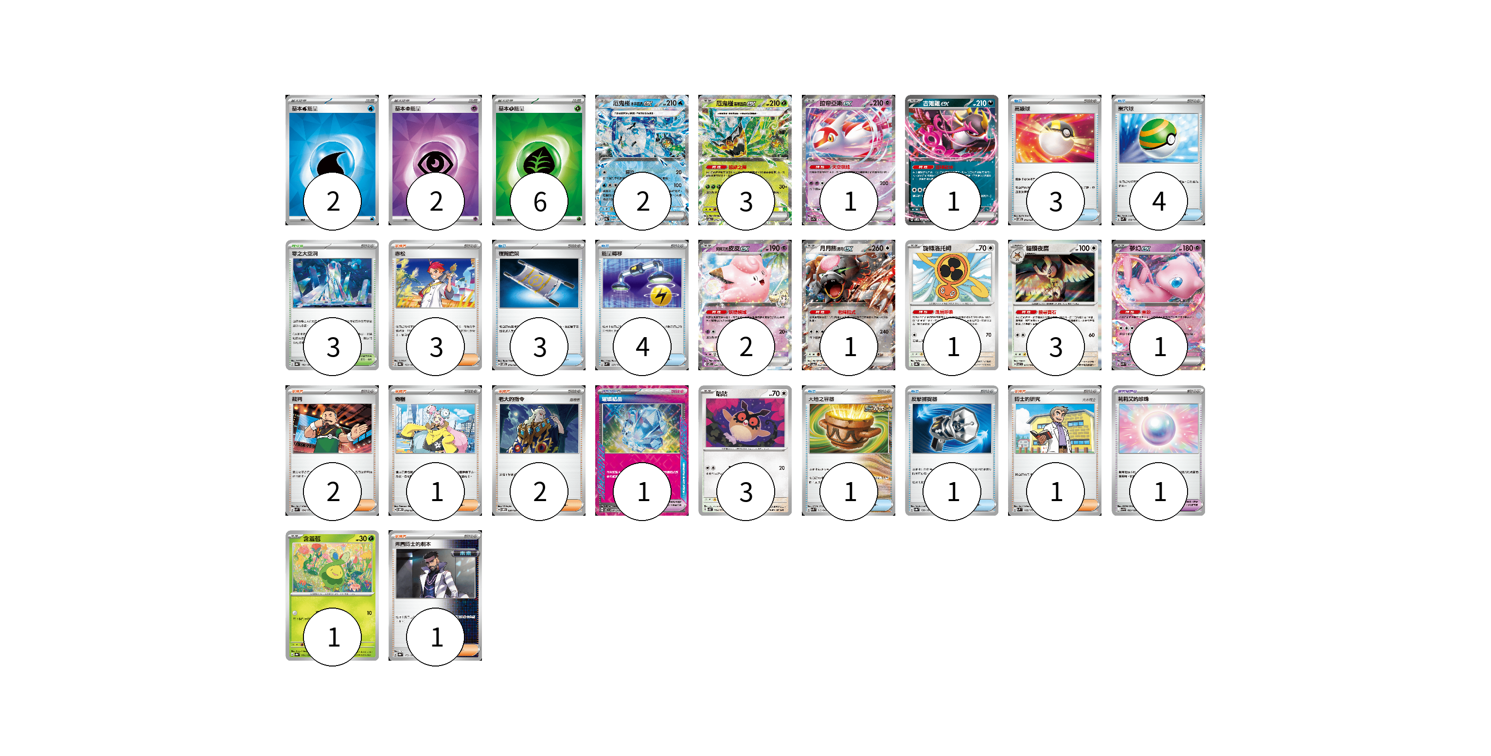 牌組構築方案 以此牌組為基礎新構築牌組 顯示卡面 顯示列表 寶可夢卡(19) 2 3 1 1 2 1 1 3 1 3 1 寶可夢道具(2) 1 1 物品卡(16) 3 4 3 4 1 1 支援者卡(10) 3 2 1 2 1 1 競技場卡(3) 3 能量卡(10) 2 2 6 寶可夢卡(19) 卡牌名稱 張數 卡牌名稱 張數 厄鬼椪 水井面具ex SV8a 050/187 02 厄鬼椪 碧草面具ex SV6 016/101 03 拉帝亞斯ex SV7a 019/064 01 吉雉雞ex SVOM 009/021 01 莉莉艾的皮皮ex SV9 033/100 02 月月熊 赫月 ex SV5a 052/066 01 旋轉洛托姆 SV8a 131/187 01 貓頭夜鷹 SV7 077/102 03 夢幻ex SVK 001/042 01 咕咕 SV5K 054/071 03 含羞苞 SV8a 001/187 01 寶可夢道具(2) 卡牌名稱 張數 卡牌名稱 張數 璀璨結晶 SV7 094/102 01 莉莉艾的珍珠 SV9 093/100 01 物品卡(16) 卡牌名稱 張數 卡牌名稱 張數 高級球 SVOM 013/021 03 巢穴球 SVM 133/175 04 夜間擔架 SVOM 016/021 03 能量轉移 SVM 127/175 04 大地之容器 SVK 012/042 01 反擊捕捉器 SV8a 139/187 01 支援者卡(10) 卡牌名稱 張數 卡牌名稱 張數 赤松 SV8a 163/187 03 裁判 SVM 154/175 02 奇樹 SVOM 018/021 01 老大的指令 SVOM 020/021 02 博士的研究 SVM 162/175 01 弗圖博士的劇本 SV8a 175/187 01 競技場卡(3) 卡牌名稱 張數 卡牌名稱 張數 零之大空洞 SV8a 182/187 03 能量卡(10) 卡牌名稱 張數 卡牌名稱 張數 基本【水】能量 SVK WAT 02 基本【超】能量 SVK PSY 02 基本【草】能量 SVK GRA 06 以此牌組為基礎新構築牌組 牌組編碼 TOTHVp-lWuSse-VrMnxP copy 列印牌組單 牌組編碼已複製 分享至SNS