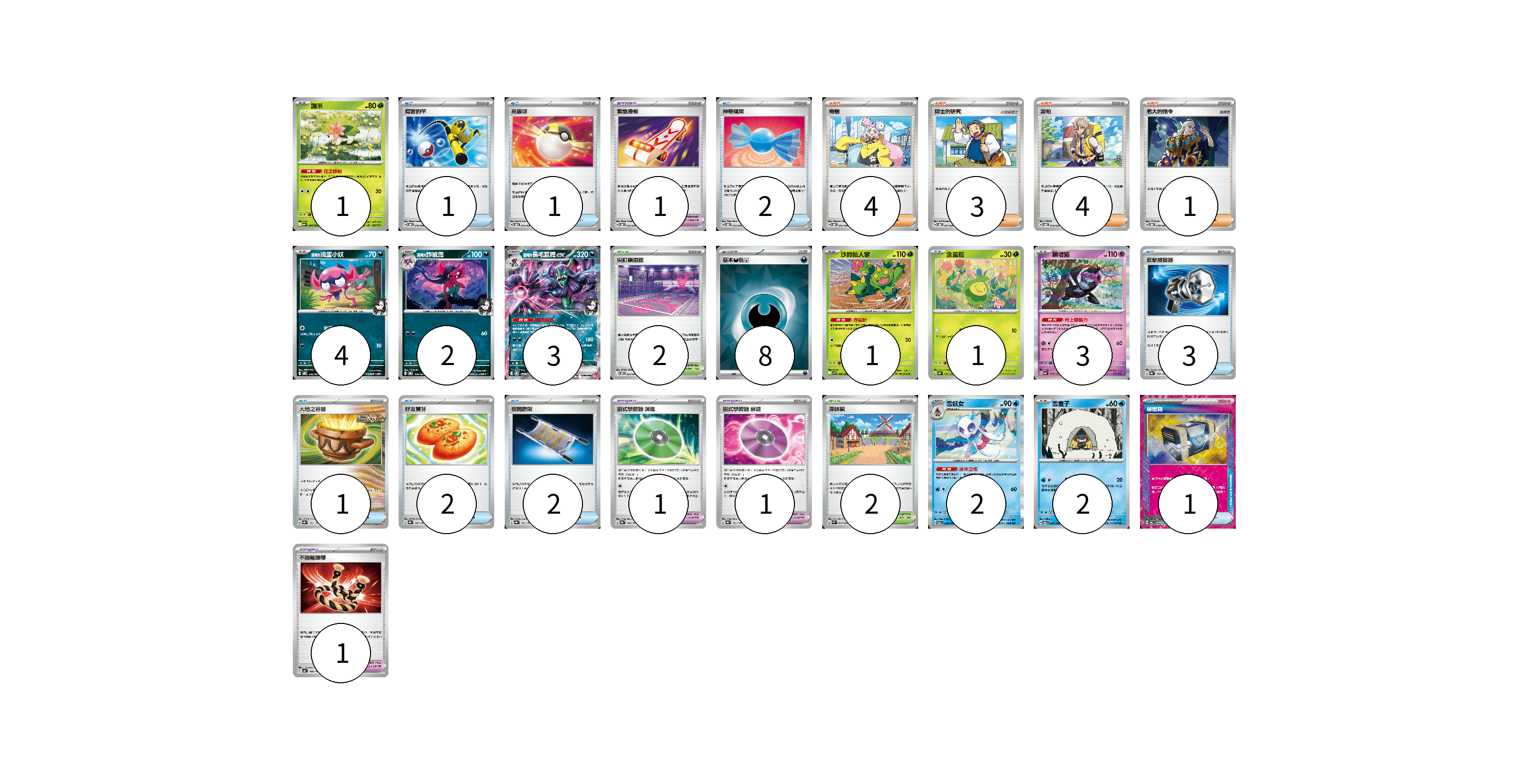 牌組構築方案 以此牌組為基礎新構築牌組 顯示卡面 顯示列表 寶可夢卡(19) 1 4 2 3 1 1 3 2 2 寶可夢道具(4) 1 1 1 1 物品卡(13) 1 1 2 3 1 2 2 1 支援者卡(12) 4 3 4 1 競技場卡(4) 2 2 能量卡(8) 8 寶可夢卡(19) 卡牌名稱 張數 卡牌名稱 張數 謝米 SV9a 006/063 01 <瑪俐的>搗蛋小妖 SVOM 005/021 04 <瑪俐的>詐唬魔 SVOM 006/021 02 <瑪俐的>長毛巨魔ex SVOM 007/021 03 沙鈴仙人掌 SV9 006/100 01 含羞苞 SV8a 001/187 01 願增猿 SV8a 075/187 03 雪妖女 SV6 033/101 02 雪童子 SV6 031/101 02 寶可夢道具(4) 卡牌名稱 張數 卡牌名稱 張數 緊急滑板 SVOD 015/020 01 招式學習器 演進 SV8a 160/187 01 招式學習器 衰退 SV8a 161/187 01 不服輸頭帶 SV4a 168/190 01 物品卡(13) 卡牌名稱 張數 卡牌名稱 張數 厲害釣竿 SVOD 010/020 01 高級球 SVOD 012/020 01 神奇糖果 SVOD 013/020 02 反擊捕捉器 SV8a 139/187 03 大地之容器 SV8a 143/187 01 好友寶芬 SV8a 147/187 02 夜間擔架 SV8a 151/187 02 秘密箱 SV6 092/101 01 支援者卡(12) 卡牌名稱 張數 卡牌名稱 張數 奇樹 SVOD 016/020 04 博士的研究 SVOD 017/020 03 派帕 SVOD 018/020 04 老大的指令 SVOD 019/020 01 競技場卡(4) 卡牌名稱 張數 卡牌名稱 張數 尖釘鎮道館 SVOM 021/021 02 深缽鎮 SVK 039/042 02 能量卡(8) 卡牌名稱 張數 卡牌名稱 張數 基本【惡】能量 SVOM DAR 08 以此牌組為基礎新構築牌組 牌組編碼 TPwvOj-FLrzJN-xDpnZB copy 列印牌組單 牌組編碼已複製 分享至SNS